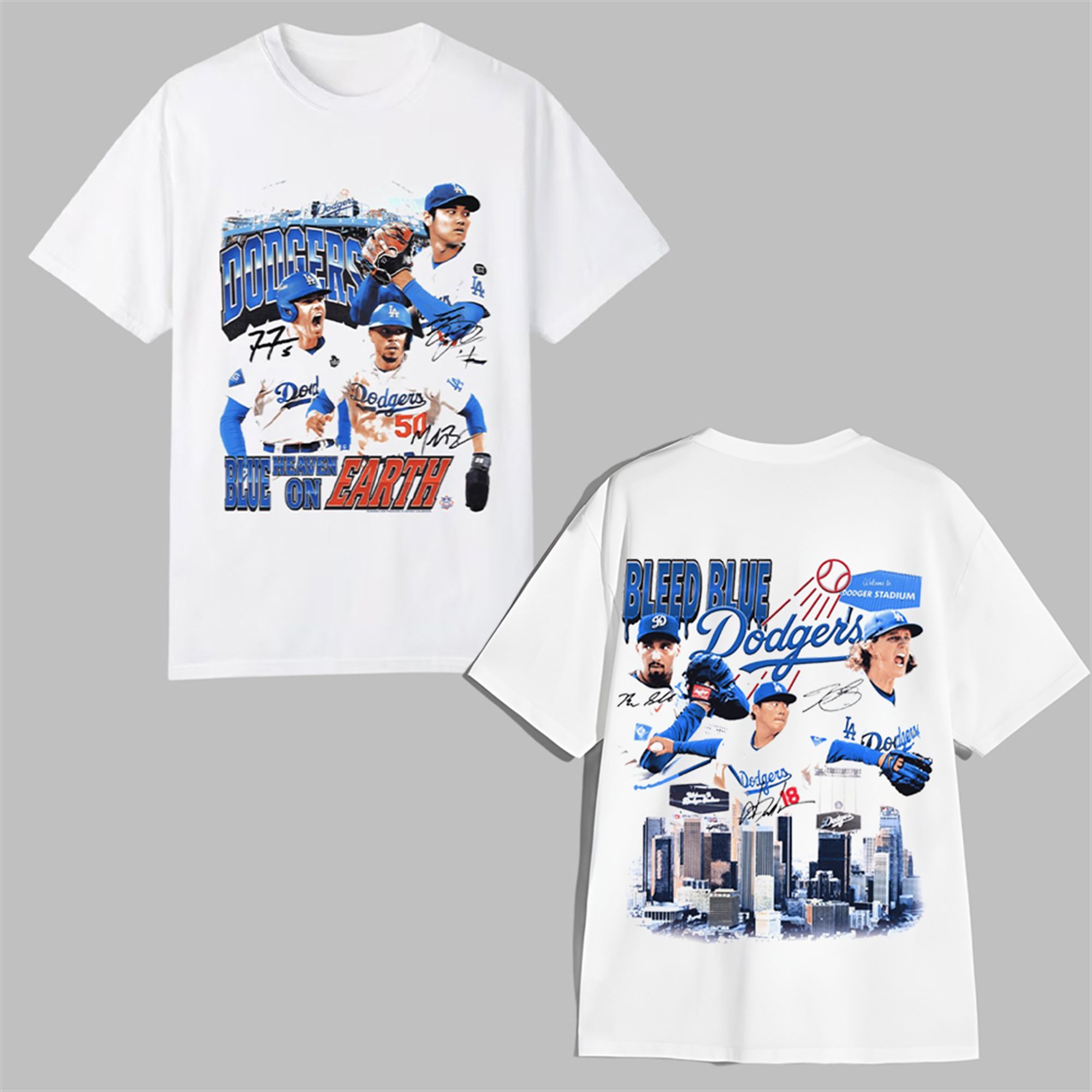 Front Design – “Blue Heaven On Earth”: The front of the shirt is a dynamic collage featuring the powerhouse trio of Shohei Ohtani (17), Mookie Betts (50), and Freddie Freeman. Each player is captured in an action shot, layered with their signatures and the iconic “Dodgers” script. The bold declaration “BLUE HEAVEN ON EARTH” anchors the design, a phrase every true fan understands to their core.