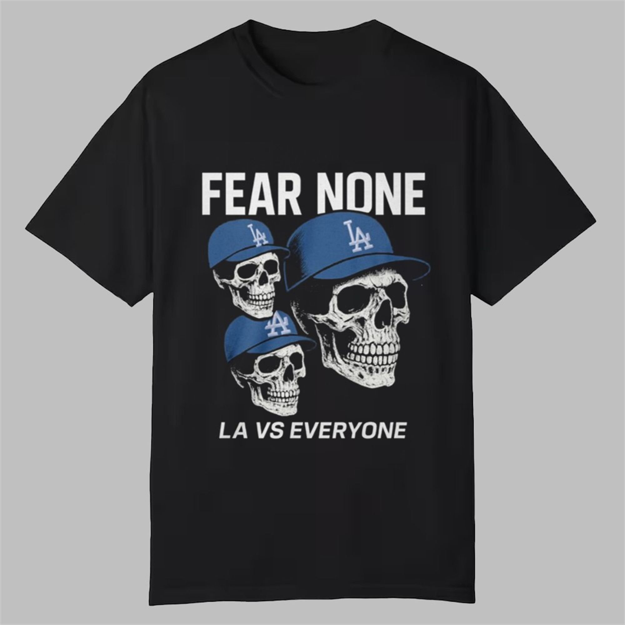 This shirt captures the defiant, confident spirit of Los Angeles. The powerful “FEAR NONE” text sits above a masterfully designed graphic of three intimidating skulls, each sporting the iconic “LA” cap. Below, the rallying cry “LA VS EVERYONE” cements the message. It’s an anthem of strength and solidarity, designed to be worn with pride whether you’re at Dodger Stadium, watching from a sports bar on Sunset, or representing your city far from home.