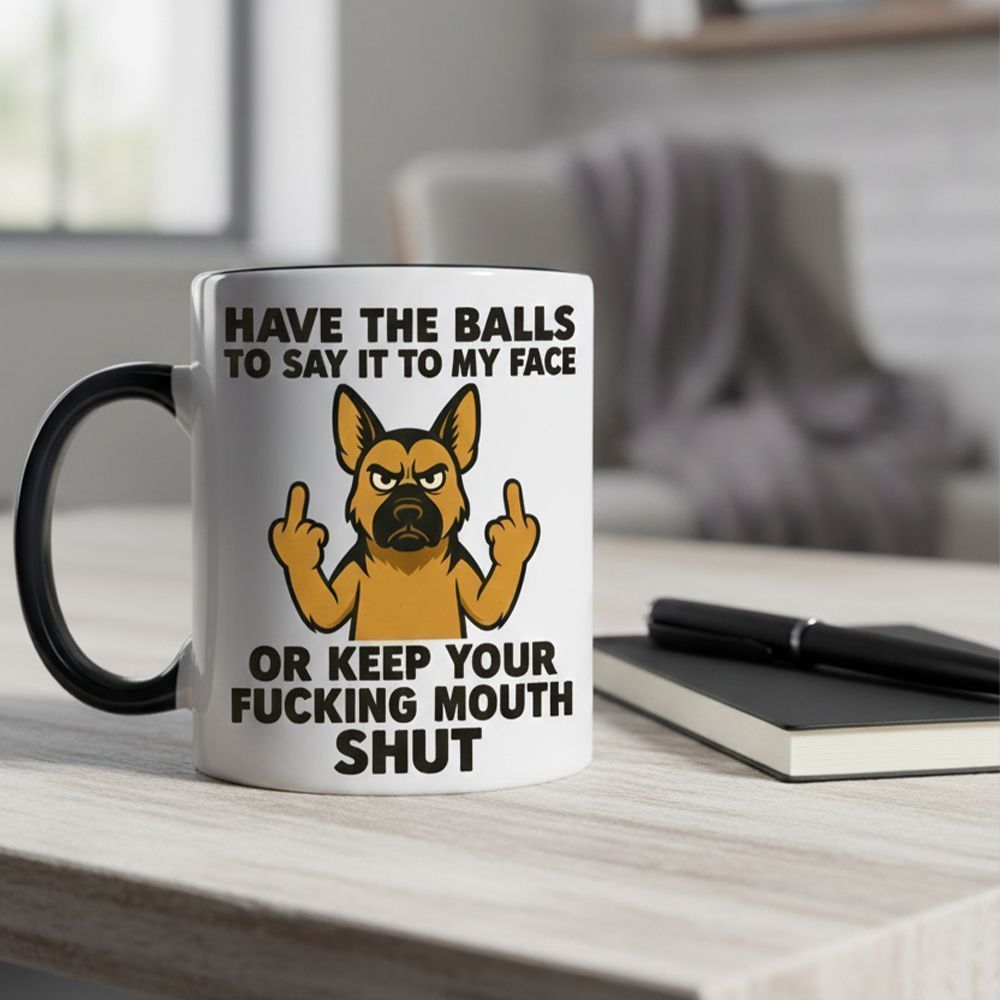 The design is simple yet powerfully effective: a stern-faced, cartoon German Shepherd who clearly means business, defiantly raising both middle fingers. The bold, black text perfectly frames this sentiment: “HAVE THE BALLS TO SAY IT TO MY FACE OR KEEP YOUR FUCKING MOUTH SHUT.” It’s a hilarious, edgy, and surprisingly liberating statement piece that’s guaranteed to turn heads and start conversations—or end them, depending on the audience. It’s more than a gag gift; it’s a well-made, functional item that delivers its message with clarity and quality.