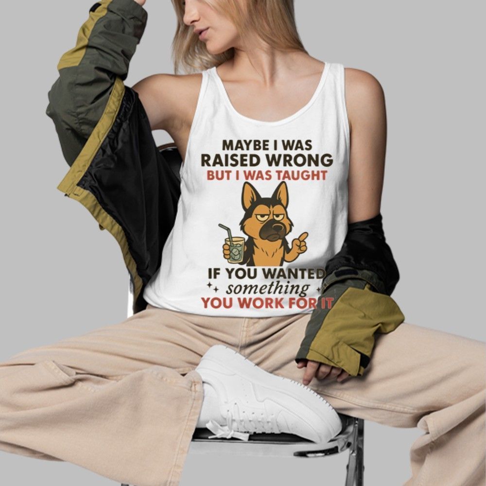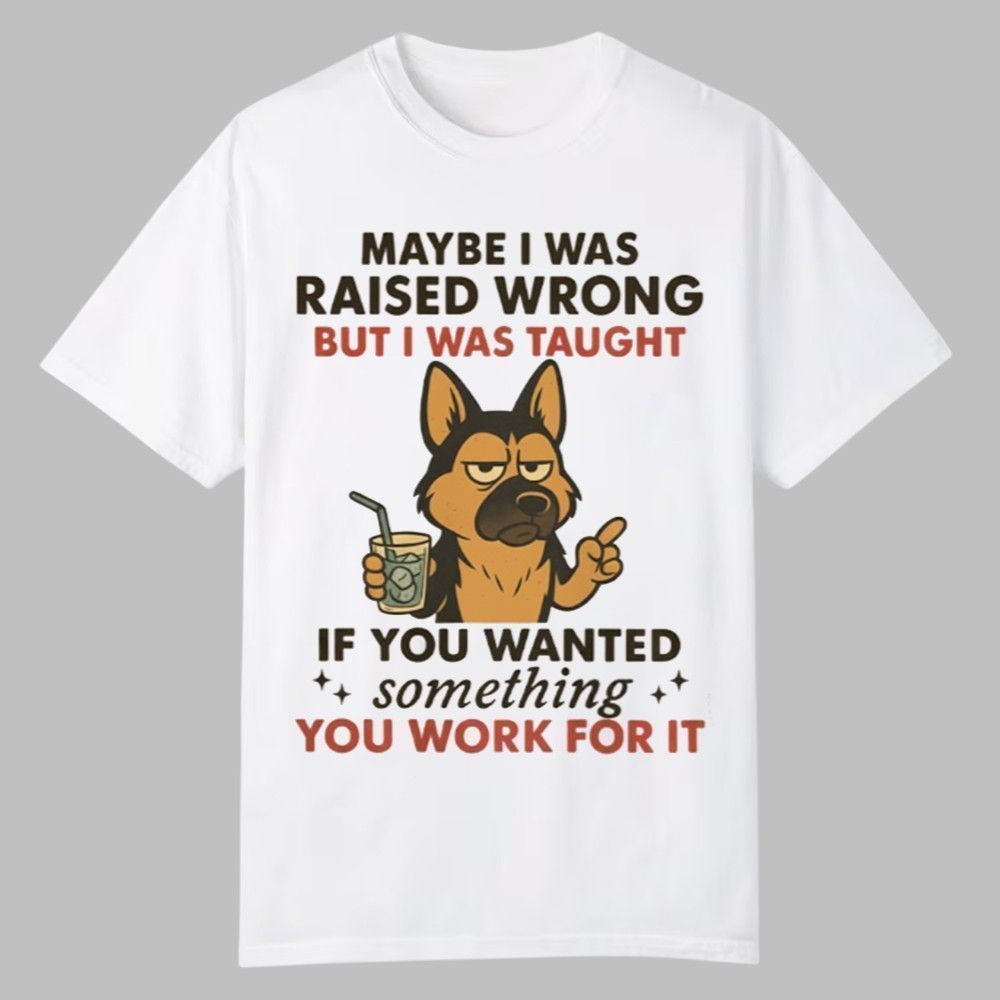 Introducing the Dog Maybe I Was Raised Wrong But I Was Taught If You Wanted Something You Work For It Shirt, a bold and humorous way to show off your no-nonsense work ethic and your love for the loyal German Shepherd breed. This unique white tee features a disgruntled-looking, yet undeniably adorable, cartoon German Shepherd holding a cold drink and sternly pointing a finger, embodying the ultimate spirit of hustle. The central, motivating message reads: “MAYBE I WAS RAISED WRONG BUT I WAS TAUGHT IF YOU WANTED SOMETHING YOU WORK FOR IT.” It’s a powerful, slightly cheeky statement that resonates with anyone who believes in the value of effort, sweat, and good old-fashioned grit.