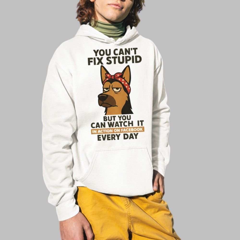 Don’t just scroll past the absurdity—celebrate it. This t-shirt is the perfect blend of style, comfort, and razor-sharp wit, making it an essential addition to any modern wardrobe. It’s a tribute to our favorite furry companions and a salute to the wild, unpredictable world of the internet. Stop shaking your head at the screen and start laughing with a shirt that gets it. Order your “You Can’t Fix Stupid” Dog Shirt today and wear your worldview with pride!