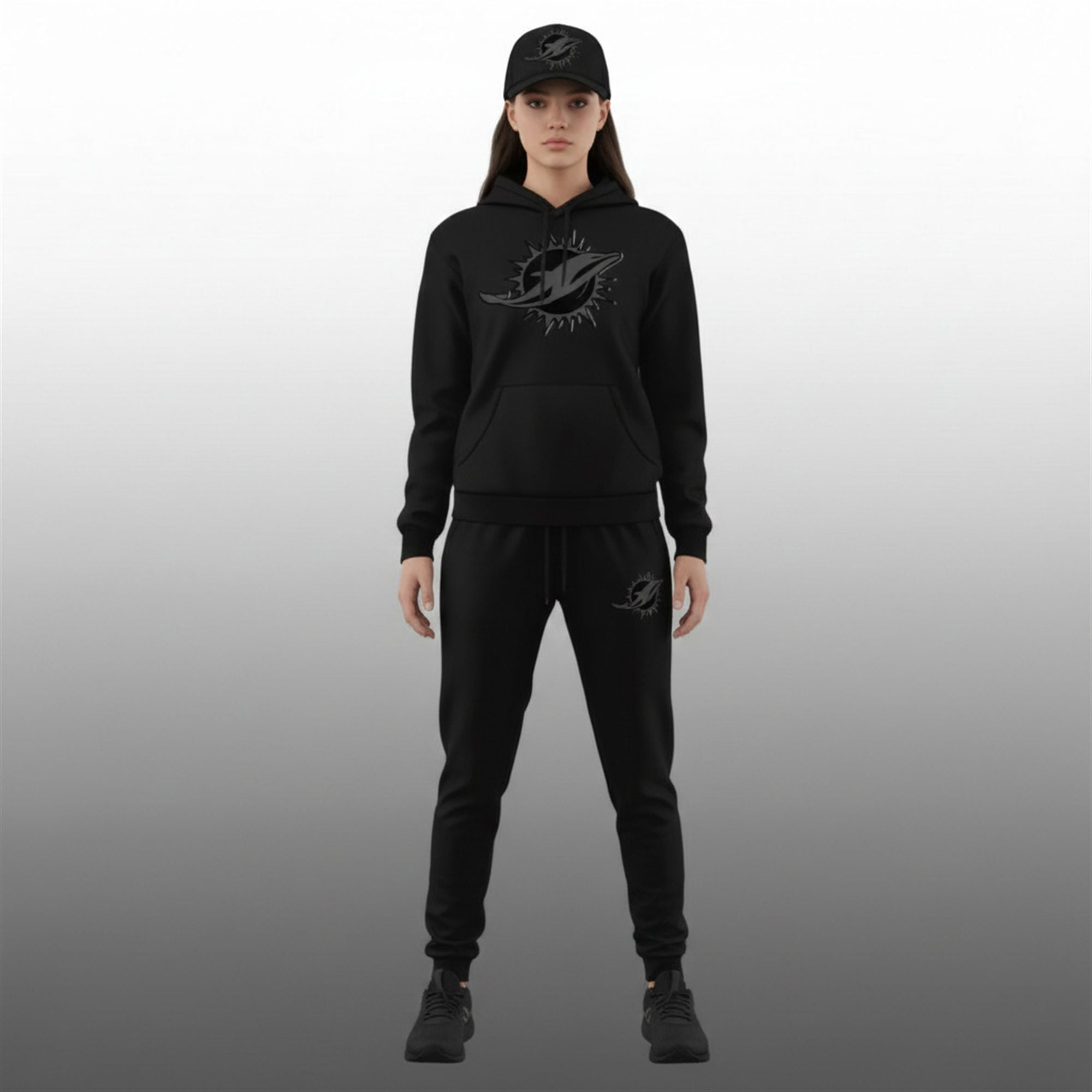 The combo is more than just merchandise; it is a uniform for the dedicated. As the 2025 season heats up towards the playoffs, show your support with a colorway that signifies dominance. This set includes three essential pieces: a premium pullover hoodie, athletic-fit joggers, and a structured baseball cap, all featuring a tonal, black-on-black rendition of the iconic Dolphins logo.