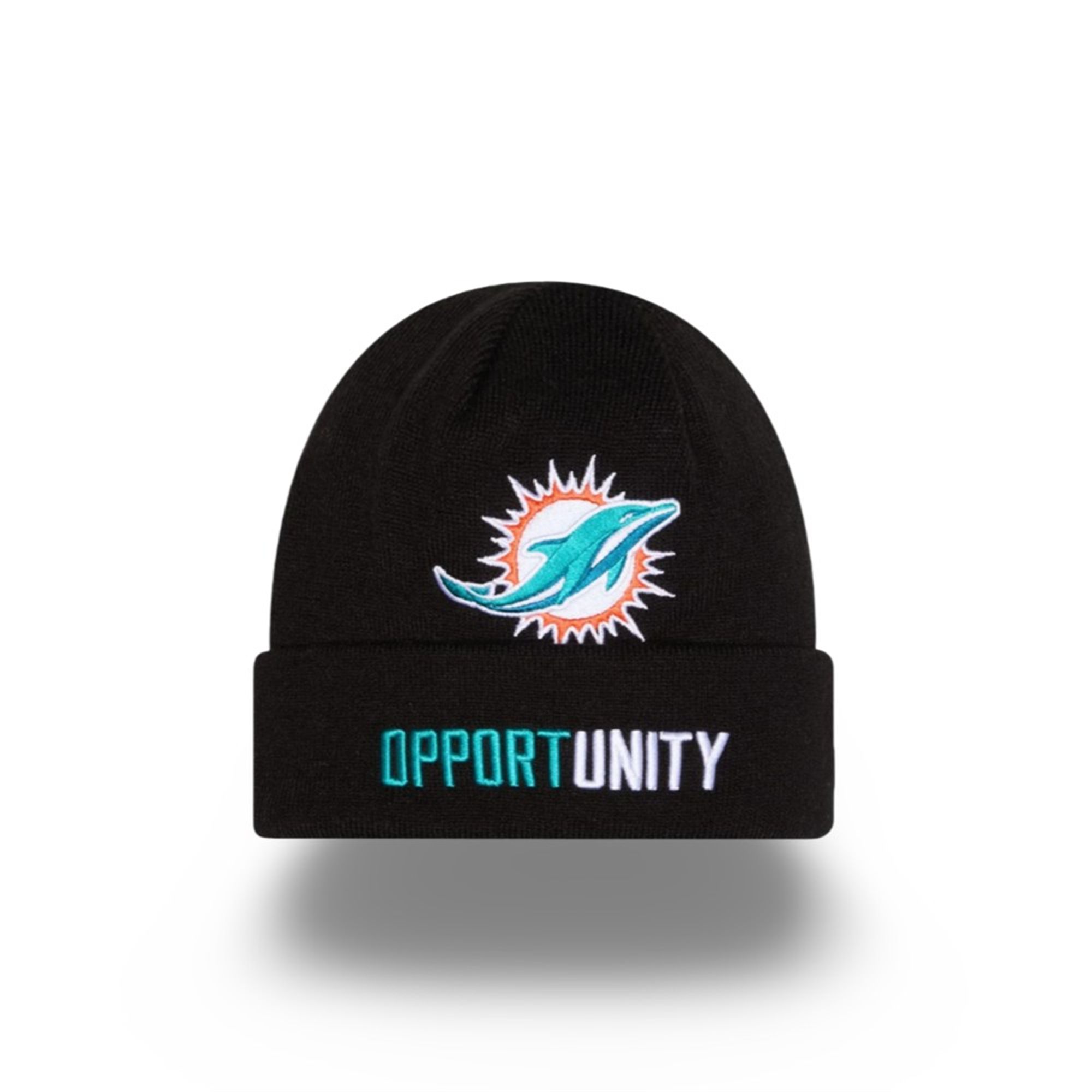 The beanie is not just fan gear; it is a wearable manifesto for the modern era of Miami football. The design genius lies in the typography on the cuff. The word “OPPORTUNITY” is split into two distinct color palettes—classic Dolphins Teal for “OPPORT” and a stark, bright White for “UNITY.”