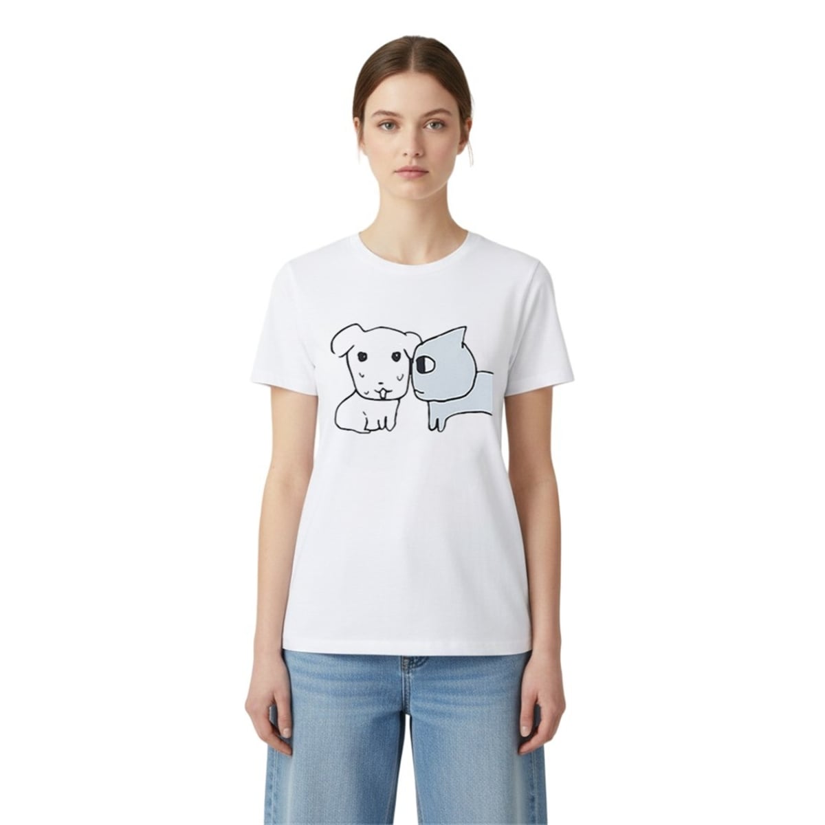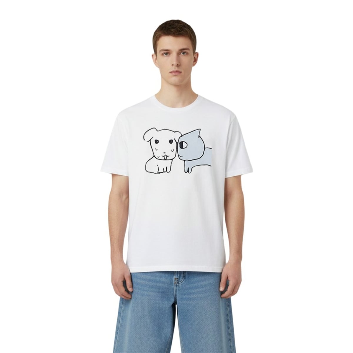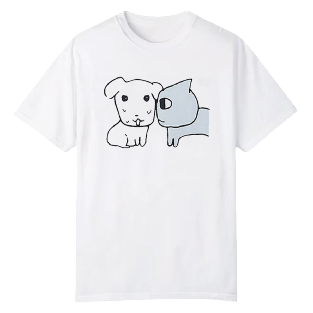 The tee is a masterclass in visual storytelling through minimalist art. The front of the shirt features a crisp, cartoon-style illustration detailing a highly specific and universally understood interaction: an overly intense grey cat staring directly into the soul of a visibly sweating, nervous little white dog. It is a humorous, boundary-setting garment designed for the modern social landscape.