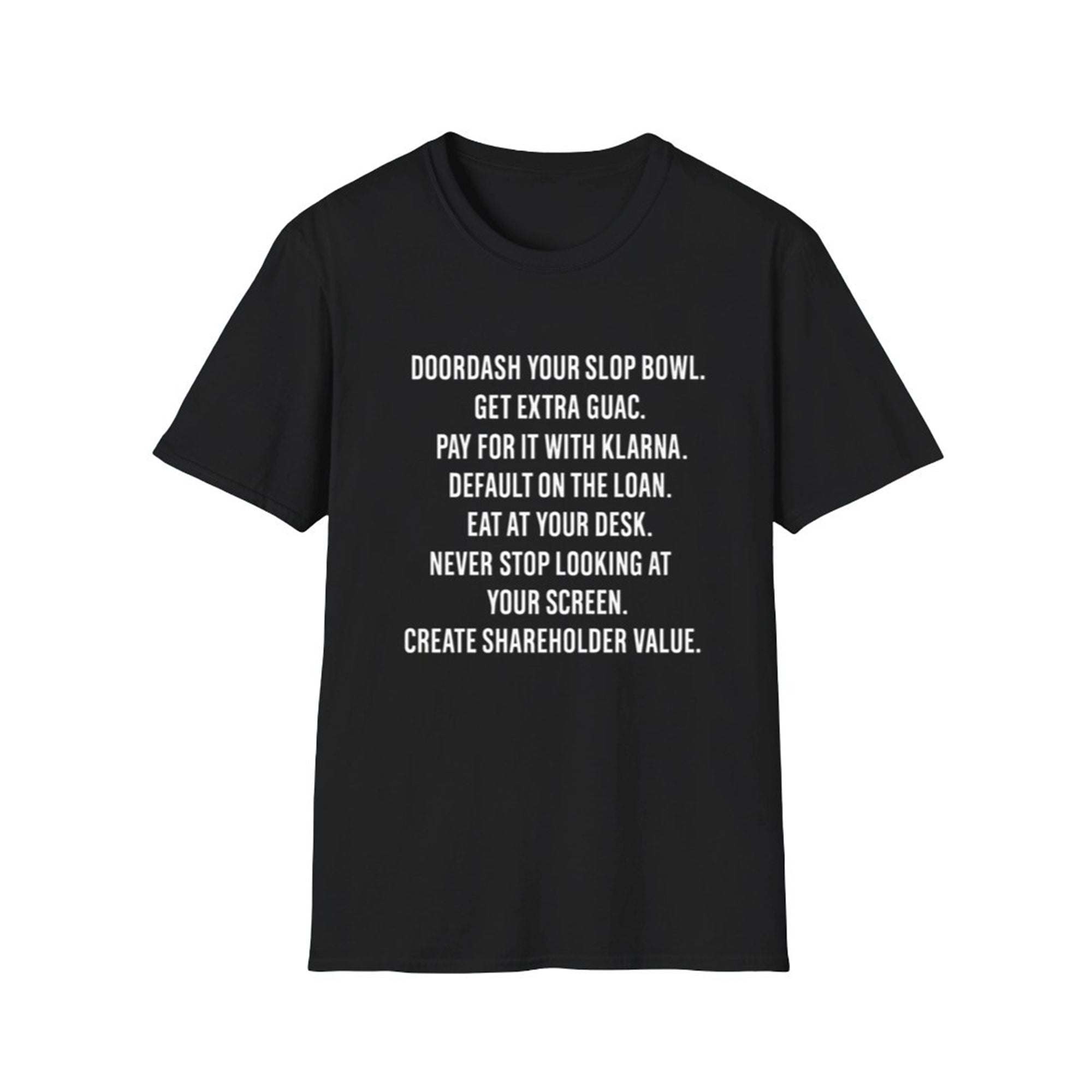 Are you tired of pretending that your 9-to-5 is anything other than a cycle of consumption and screen time? The Doordash Your Slop Bowl Create Shareholder Value Shirt is the ultimate uniform for the modern office drone who has achieved peak self-awareness. This isn’t just a shirt; it’s a satirical timeline of the average Tuesday in late-stage capitalism.