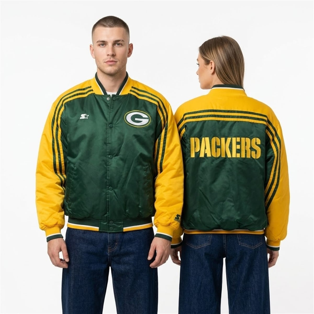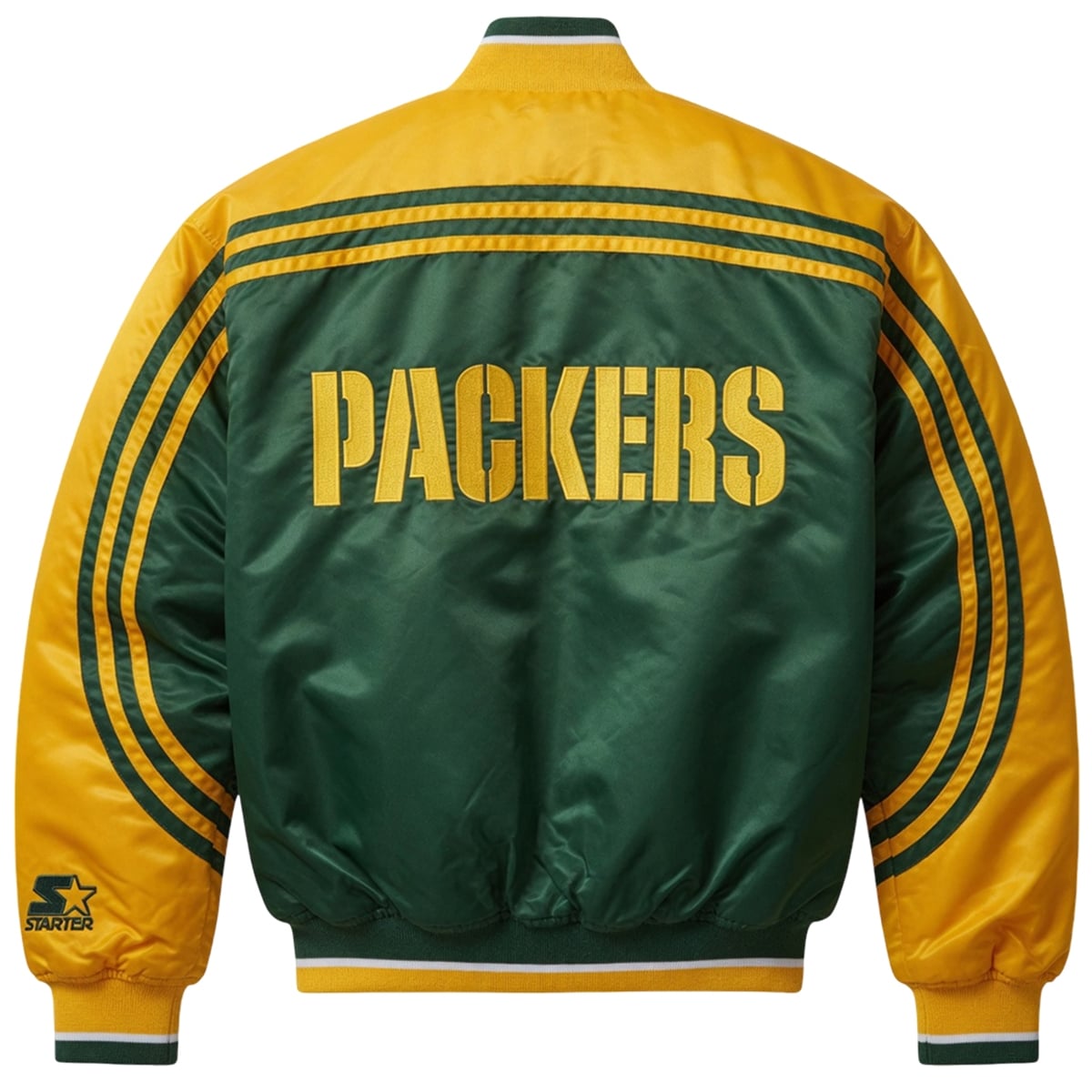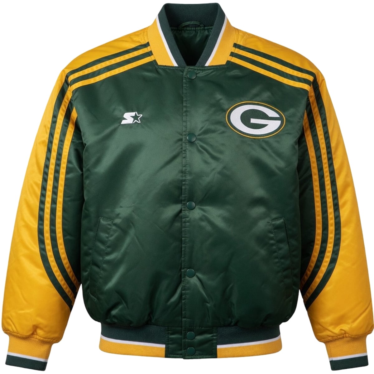 This remarkable outerwear piece perfectly captures the essence of classic 90s sports fashion while remaining entirely relevant in today’s hype-driven landscape. Visually, the jacket is a masterpiece of team branding, utilizing the iconic deep forest green and vibrant yellow-gold colorway that instantly identifies the Green Bay Packers. The front profile features the legendary, undeniable “G” logo prominently displayed on the chest, complemented by the classic Starter star emblem.