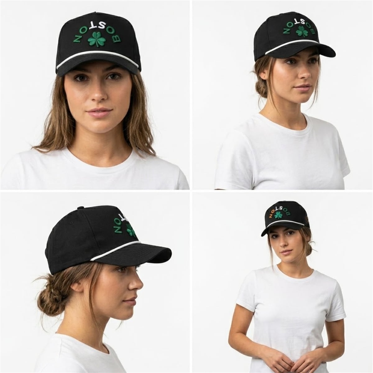 Centered perfectly beneath the arched text is a classic, rich green shamrock emblem. To frame the front panel, a sleek white rope detail runs across the brim, adding a distinct, vintage-inspired aesthetic to the modern silhouette. It is a masterpiece of fan apparel design, created to stand out in a sea of traditional team merchandise.