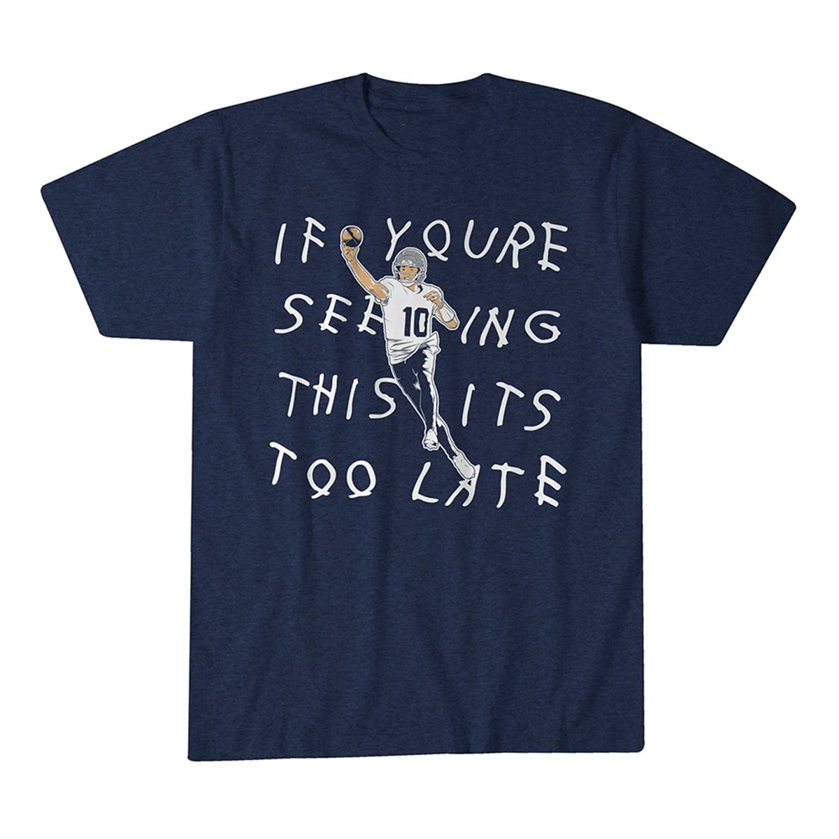 The front of the shirt features a striking, stylized graphic of quarterback Drake Maye wearing his signature number 10, executing a flawless passing motion. Floating around his silhouette is the instantly recognizable, handwritten-style text reading “IF YOURE SEEING THIS ITS TOO LATE.”