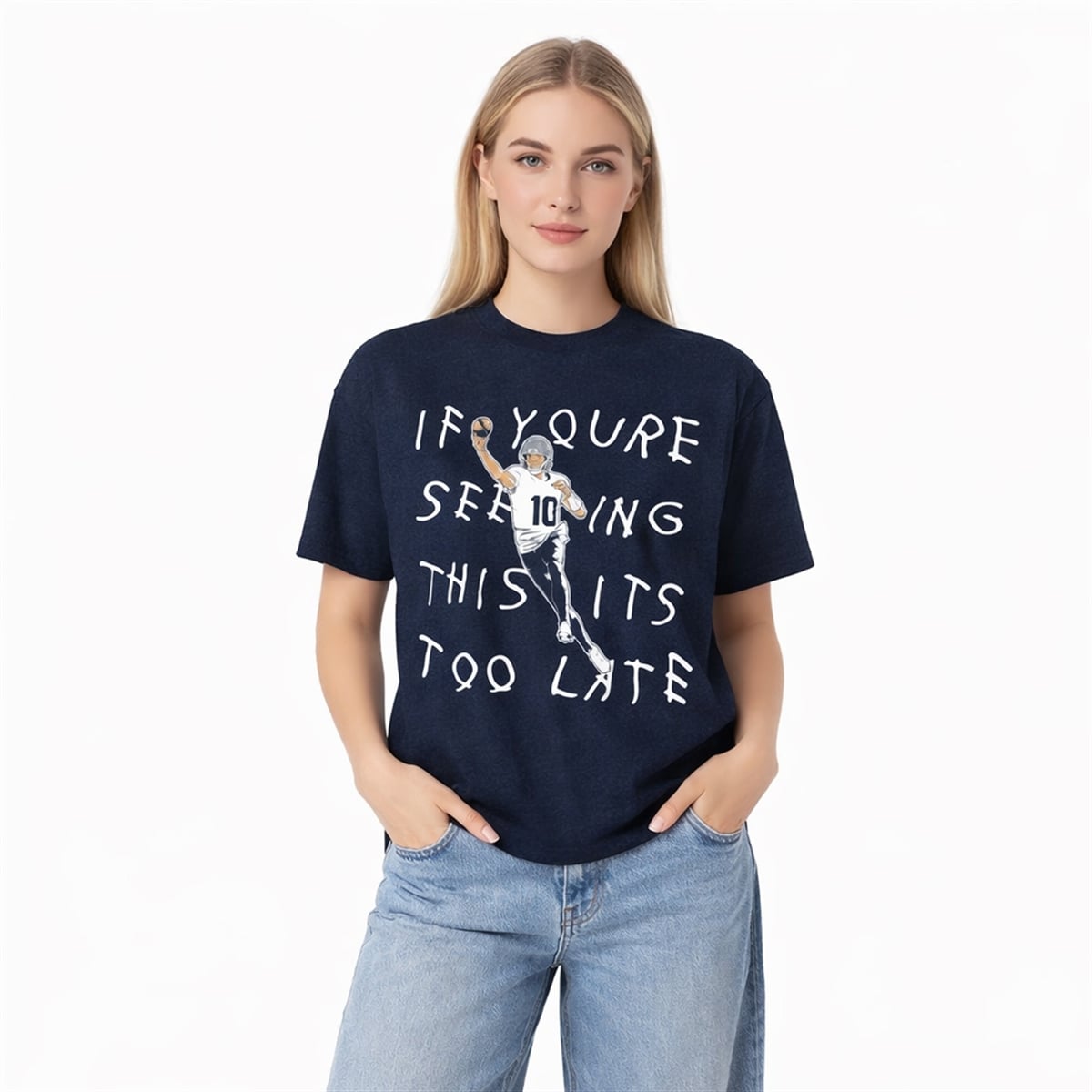 The brilliance of this design lies in its multi-layered wordplay and visual storytelling. It connects the quarterback’s first name, Drake, to the world-famous recording artist of the same name, specifically referencing the rapper’s iconic 2015 mixtape, If You’re Reading This It’s Too Late.