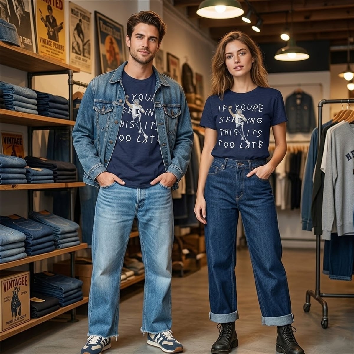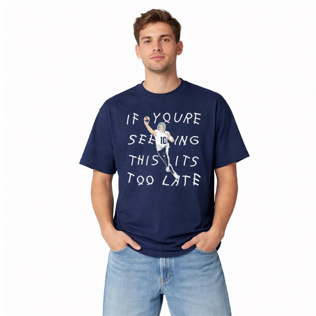 In the context of this apparel, the phrase is brilliantly re-contextualized for the football field. When the defense sees Maye winding up for a deep pass, the realization hits—the play is already made, the receiver is open, and the touchdown is inevitable. “If you’re seeing this, it’s too late” translates directly to Maye’s processing speed, arm talent, and ability to outsmart the opposition before they even know what hit them. It is a psychological flex translated into wearable art.