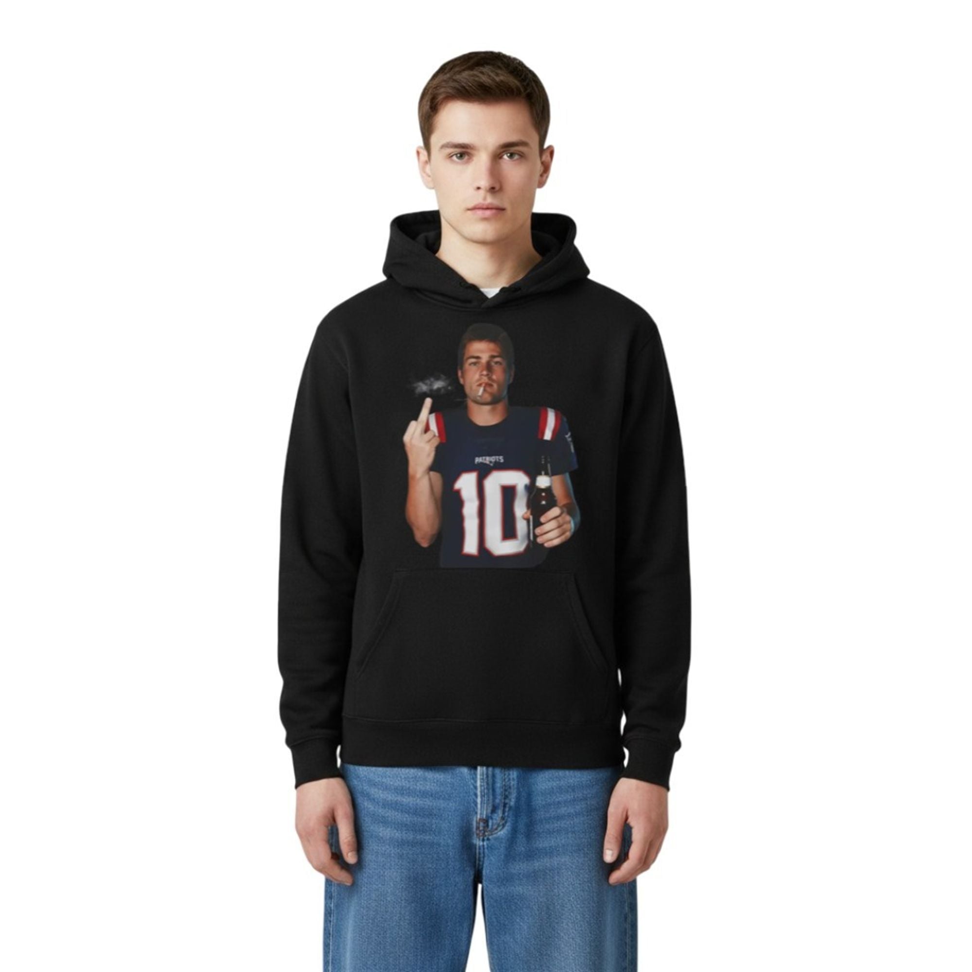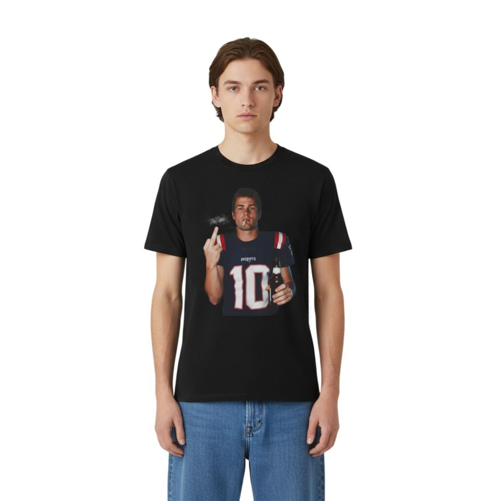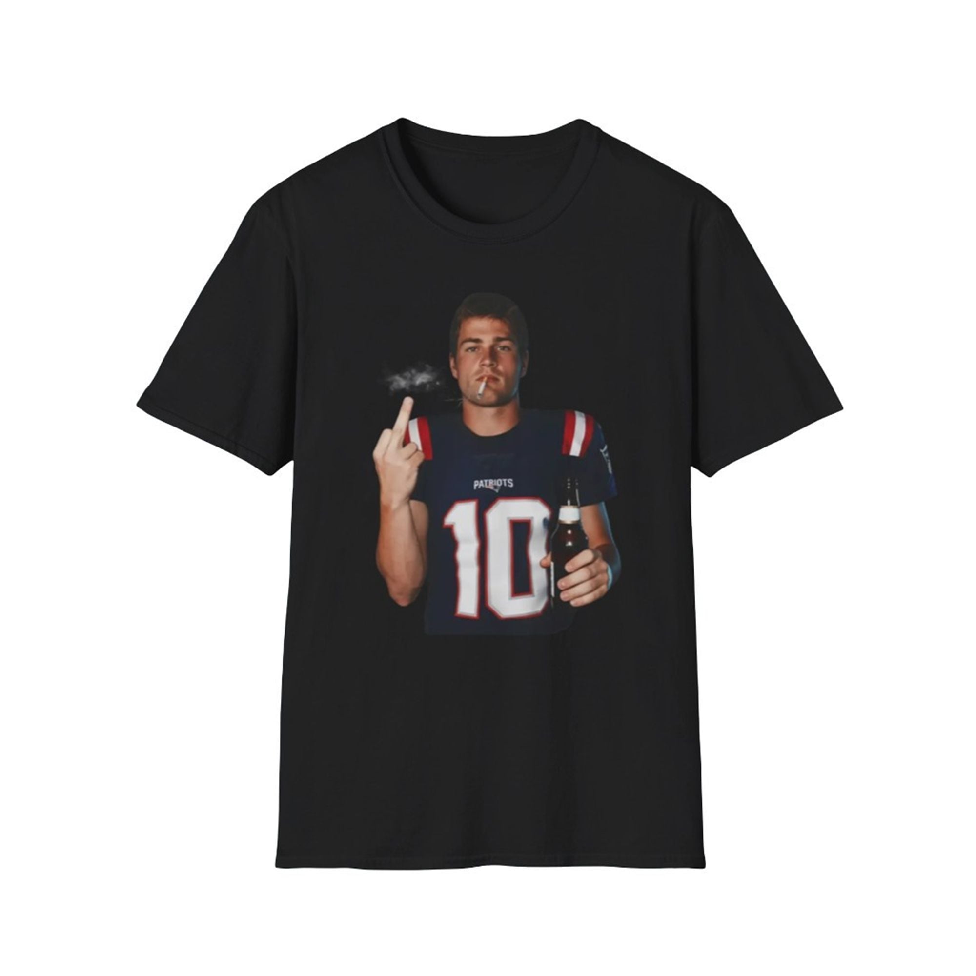 In an era of heavily curated athlete personas and sanitized media appearances, the shirt stands out as a beacon of irreverence. This product features a high-definition, viral digital edit of the New England Quarterback, #10, in his navy blue jersey. The artwork depicts Maye in a moment of relaxed defiance, holding a beer bottle in one hand while flipping the bird with the other, a cigarette dangling loosely from his lips.