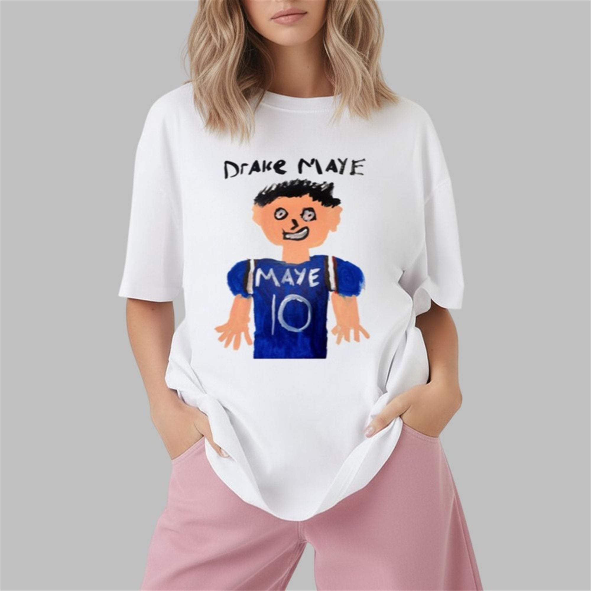 The shirt is a standout piece of apparel that breaks the mold of traditional sports merchandise. Instead of high-gloss graphics and logos, this shirt features a hand-drawn marker sketch of New England’s quarterback, complete with wobbly lines and an unmistakably amateur aesthetic. The artwork depicts Maye in his navy blue #10 jersey, with a joyful, slightly chaotic expression that perfectly encapsulates the ups and downs of fandom.