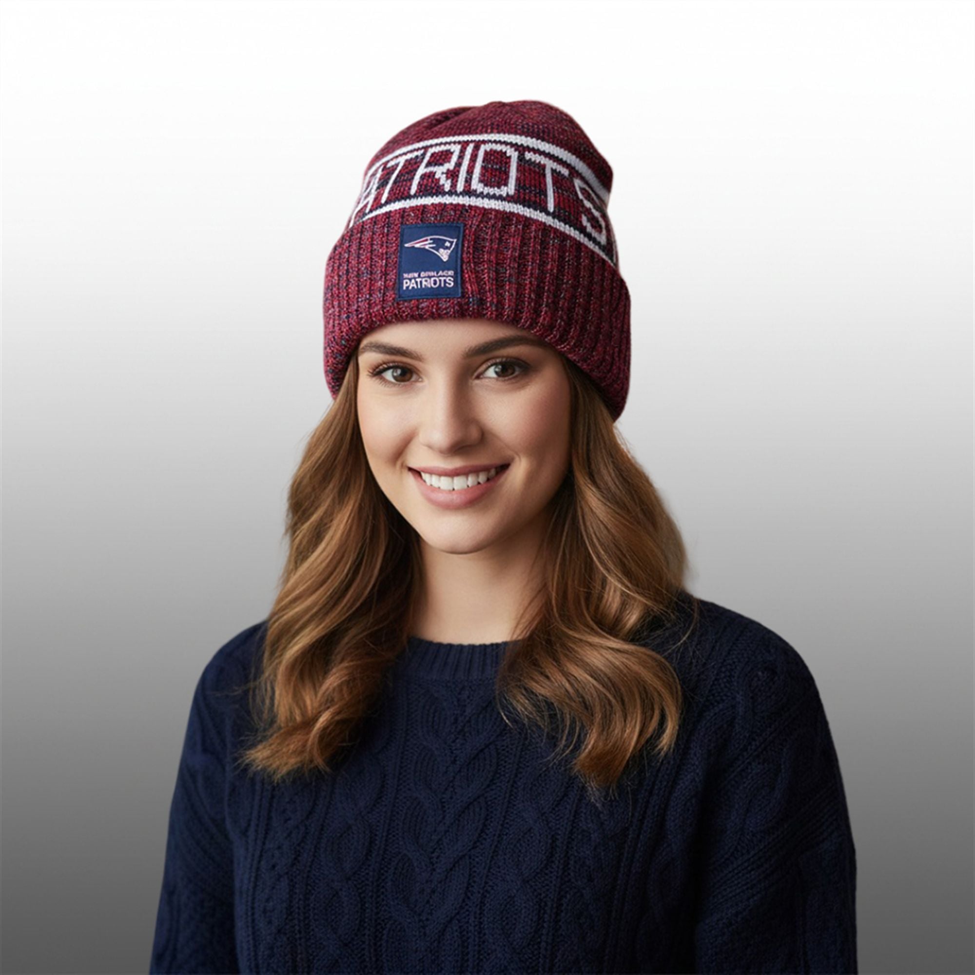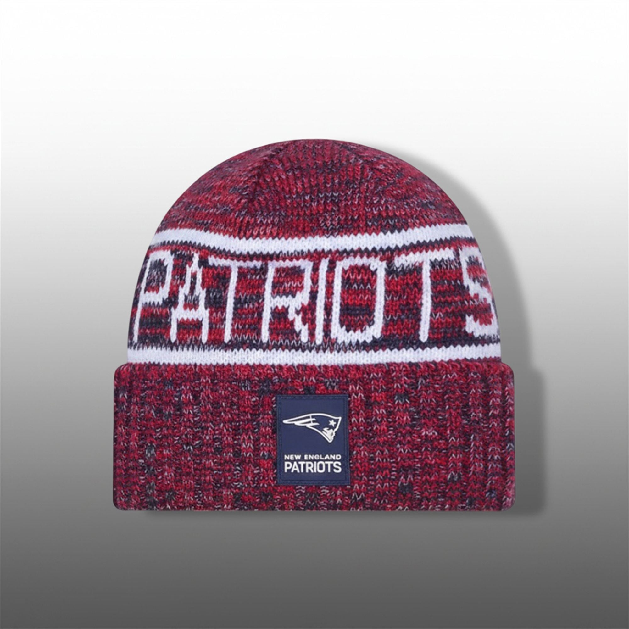 The design features a rich, heathered cardinal red crown that stands out against the sea of standard navy blue. A bold, white horizontal stripe encircles the crown, housing the “PATRIOTS” wordmark in a classic, block-letter typeface that evokes the team’s gritty heritage. The ribbed cuff provides a snug, wind-resistant fit, anchored by the New England Patriots logo patch—a mark of authenticity and quality. Topped with a classic multi-colored pom, this beanie balances the nostalgic “football weather” aesthetic with the sharp, modern edge of the current roster.