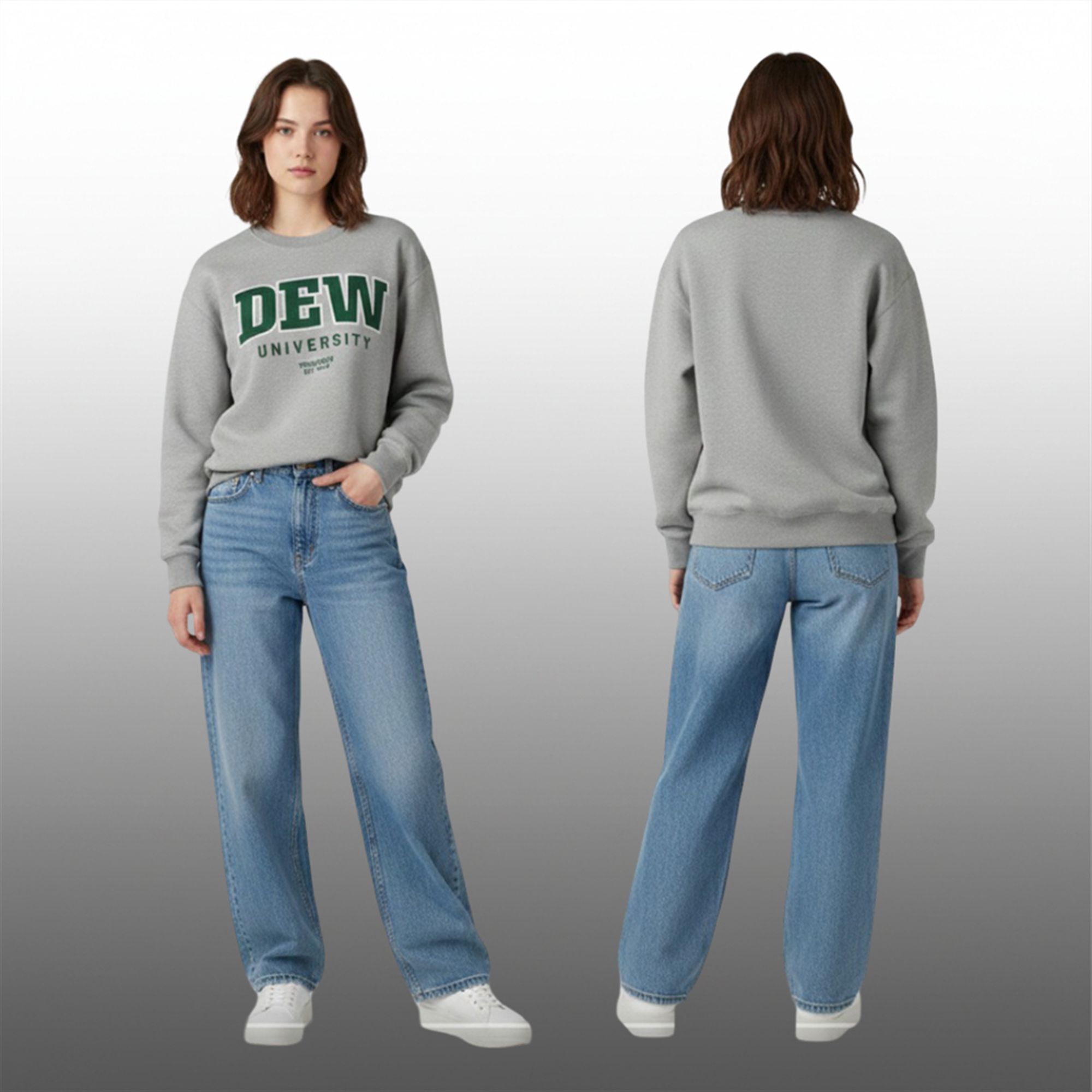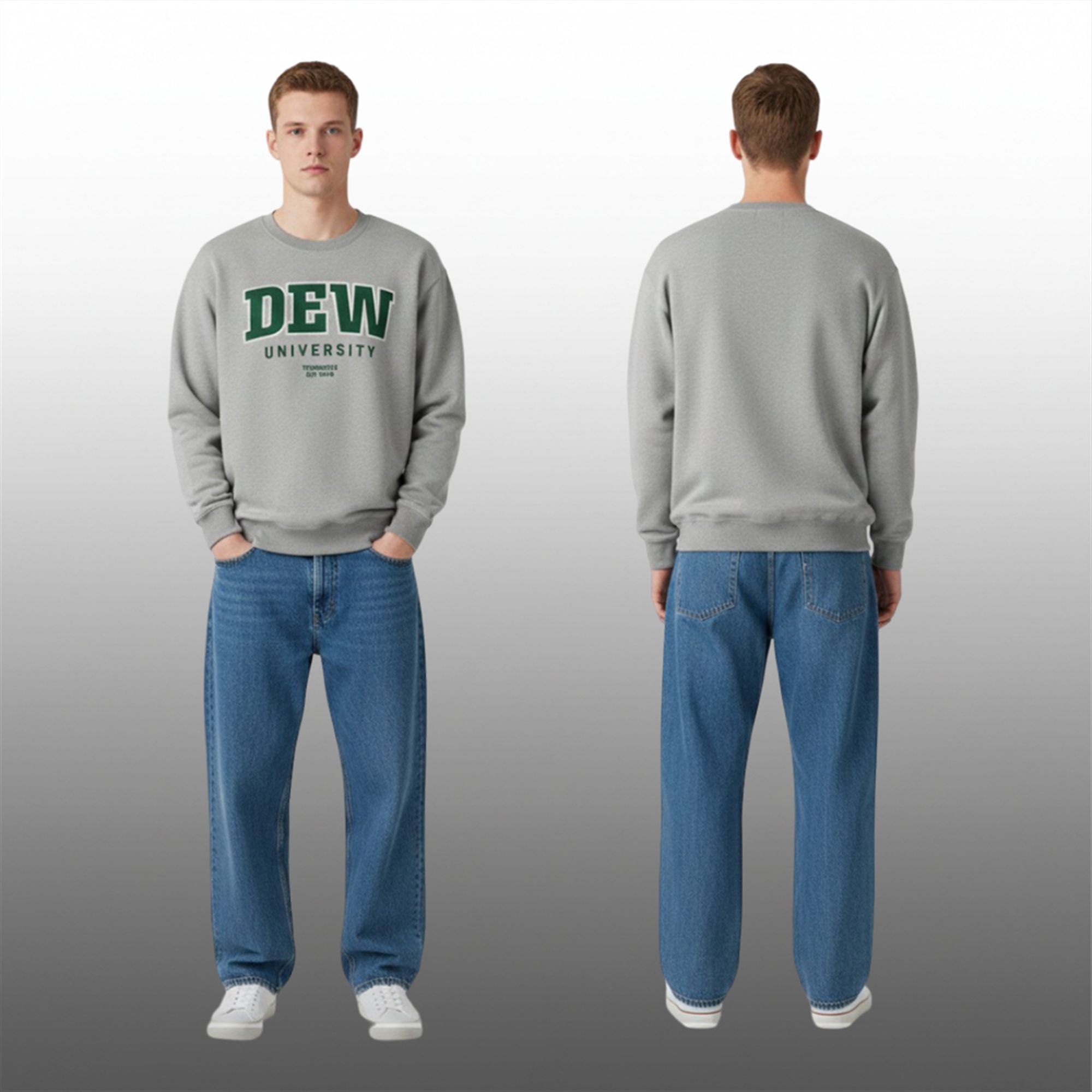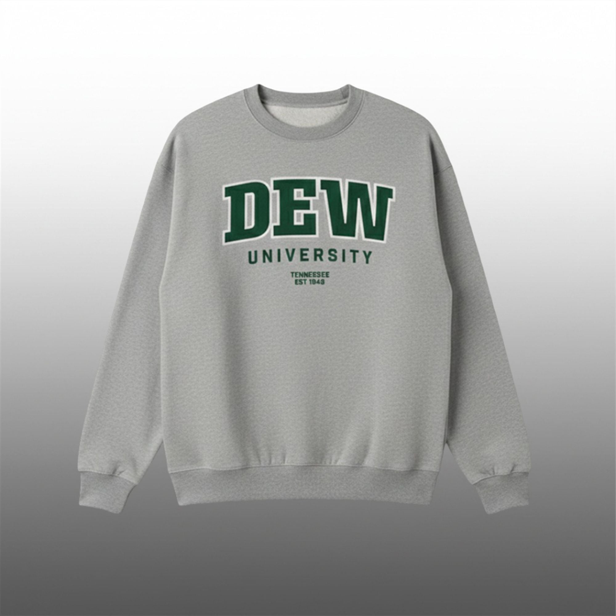 The Dew University Crewneck is a high-quality, heather grey sweatshirt designed for those who appreciate comfort, irony, and iconic pop culture references. The centerpiece of this garment is the bold, varsity-style lettering across the chest. The “DEW” text is rendered in a classic forest green with crisp white outlines, instantly evoking the branding of America’s favorite neon-green soda. Below, “UNIVERSITY” solidifies the collegiate parody, while the text “Tennessee EST 1948” anchors the design in historical fact—nodding to the region and era where the legendary drink began its rise to fame.