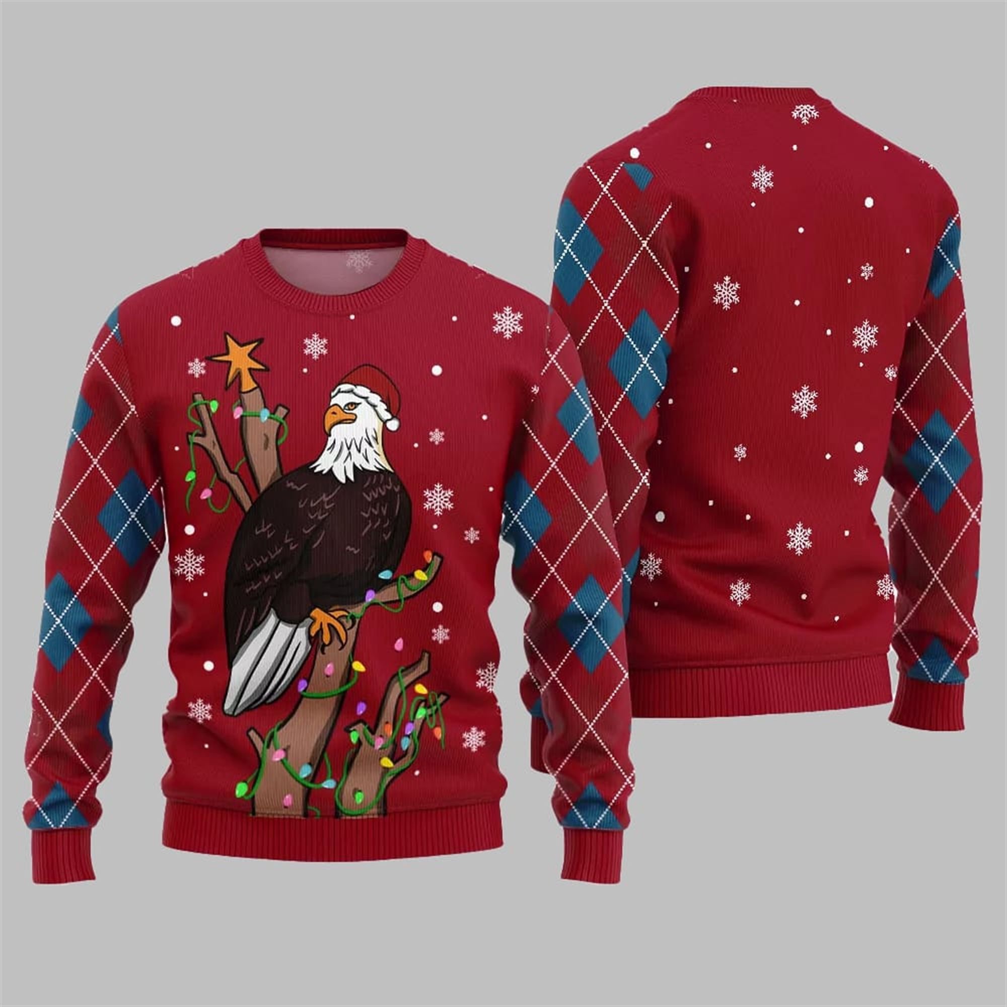 The centerpiece is a beautifully rendered Bald Eagle, perched proudly on a tree branch. But this is no ordinary eagle; it’s fully embracing the Christmas spirit with a bright red Santa hat perched jauntily on its head. The tree branch itself is wrapped in a tangle of colorful, glowing Christmas lights, with a shining star at the very top, mimicking a Christmas tree. The eagle’s sharp, determined gaze paired with the playful holiday attire creates a delightful contrast that is guaranteed to bring smiles and start conversations. The design is completed with classic argyle patterns in red and navy blue on the sleeves, adding a traditional “ugly sweater” touch to this modern masterpiece.
