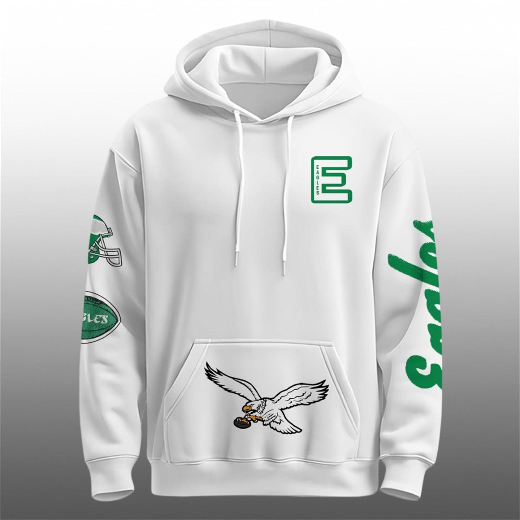 This hoodie redefines the fan aesthetic by moving away from the dark, heavy tones of the past and embracing a crisp, “Whiteout” visual that pops on camera and in the crowd. The front design is intentionally understated, featuring a stylized “E” block logo on the chest and a detailed, vintage-inspired eagle carrying a football on the kangaroo pocket area—a subtle nod to the team’s gritty history.