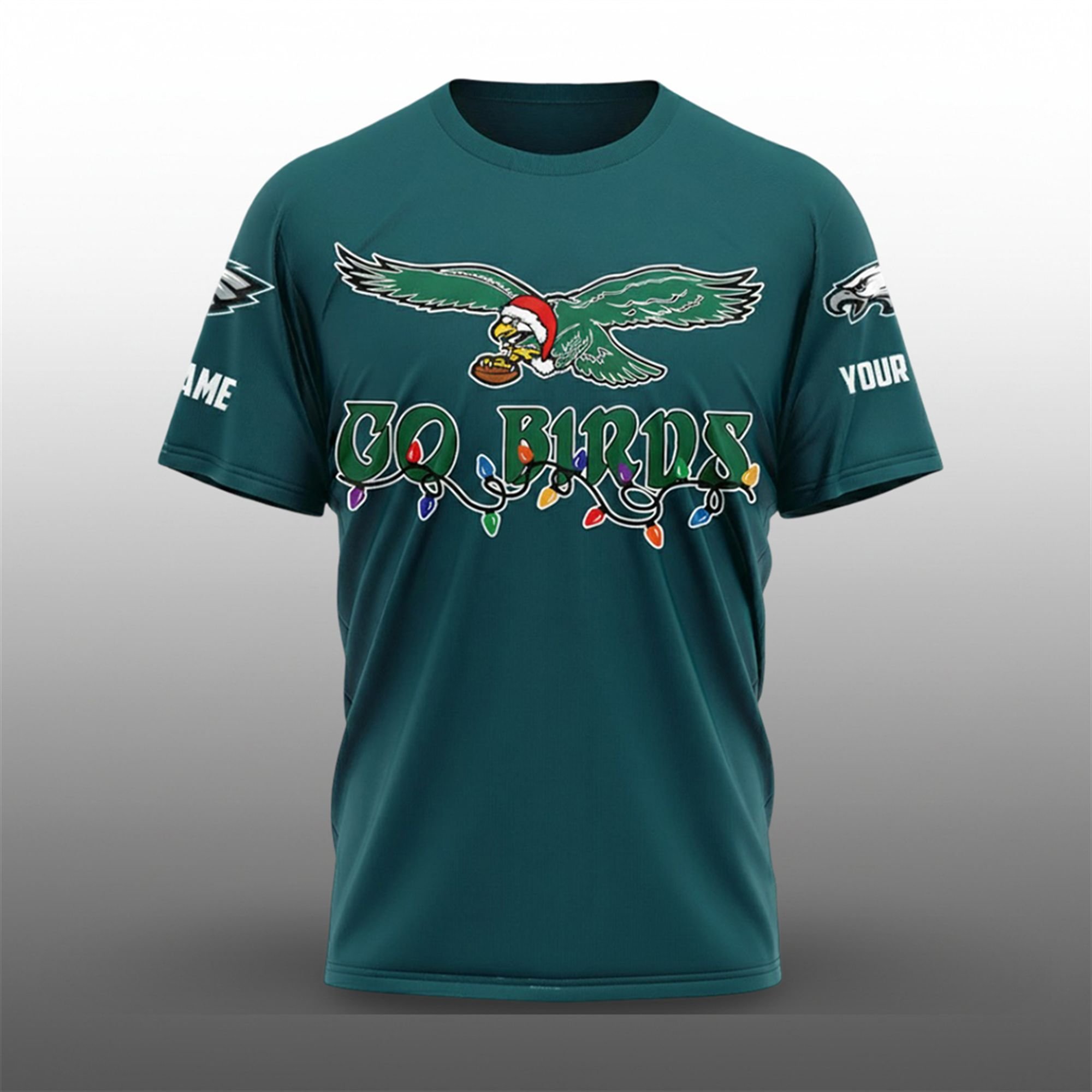 The Festive Front: The chest proudly displays the classic, fierce Eagles logo, now topped with a jolly Santa hat. Below it, the rallying cry “GO BIRDS” is spelled out in bold letters, intricately tangled in a string of festive Christmas lights. It’s the perfect icebreaker and a clear signal to everyone in the room which team you’re rooting for.
