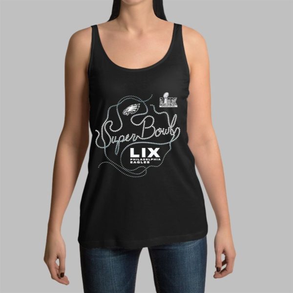 Step into the spotlight and celebrate the Philadelphia Eagles’ journey to Super Bowl LIX with this Eagles Super Bowl LIX Studded Stones Shirt. Beneath the bold script, the Roman numeral “LIX” proudly proclaims the year of this epic event, ensuring you’ll remember this Super Bowl for years to come. Further enhancing the design, the beloved Philadelphia Eagles logo is subtly integrated into the artwork, adding a touch of team spirit without overwhelming the overall aesthetic.