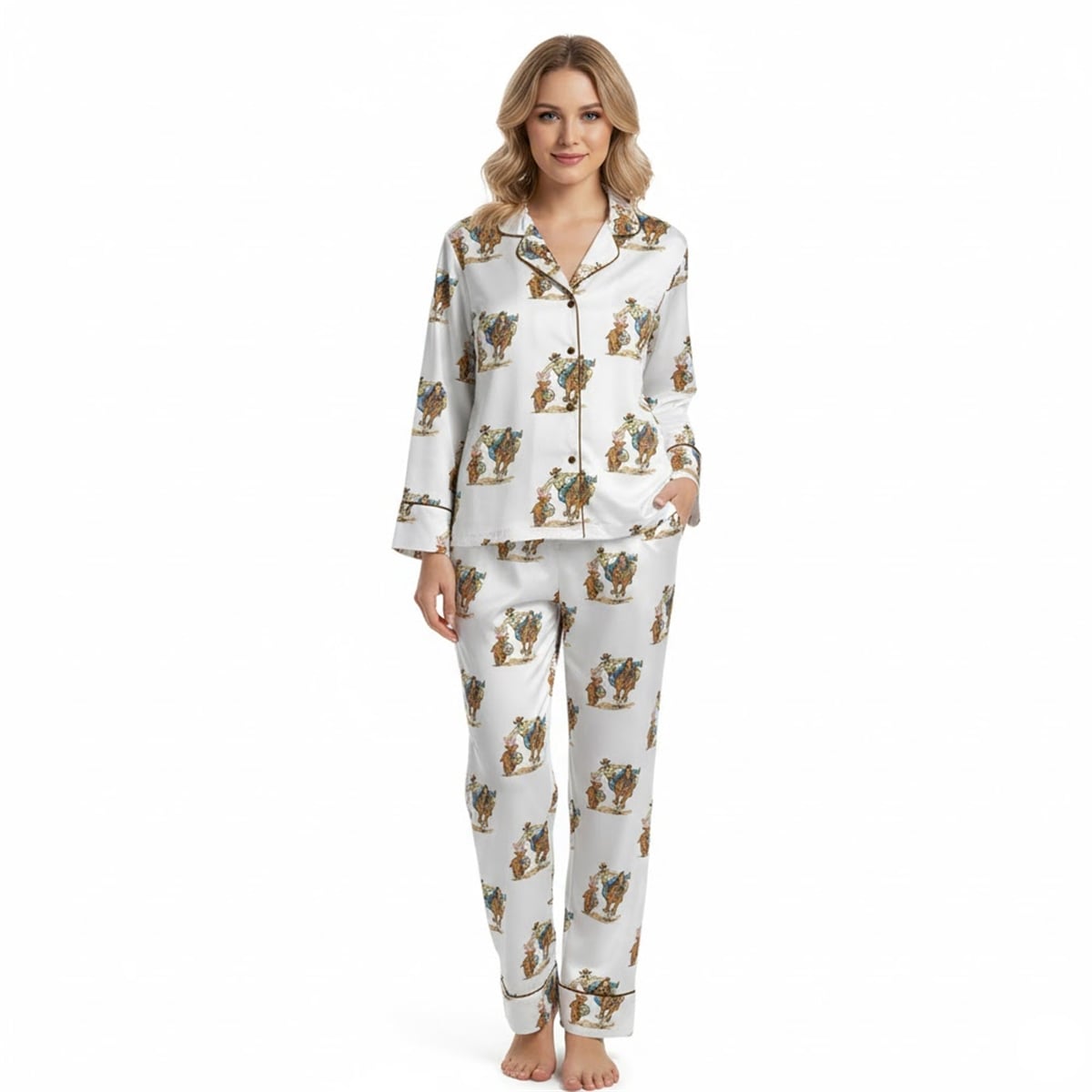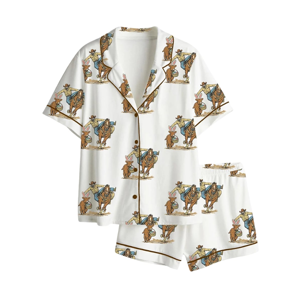 The set is a visually striking two-piece loungewear ensemble. The design features a crisp, white background adorned with a repeating, dynamic illustration: a classic Western cowboy riding a bucking horse, expertly tossing a lasso toward a festive Easter bunny clutching a basket full of eggs. The set includes a classic long-sleeved, button-down top with a traditional notch collar and coordinating full-length trousers. Deep brown contrast piping along the lapels, cuffs, and pant hems frames the whimsical artwork, giving the set a polished, tailored silhouette.
