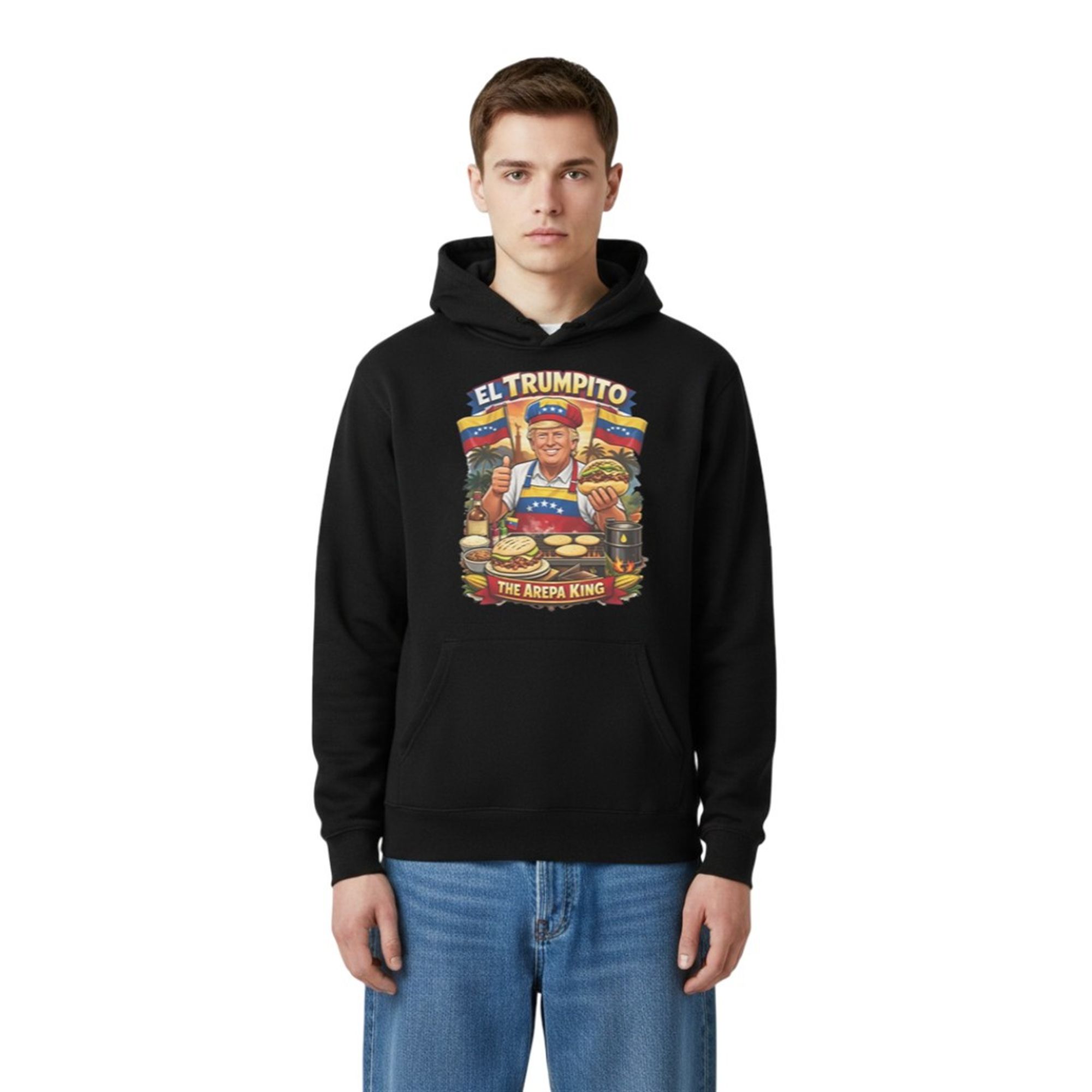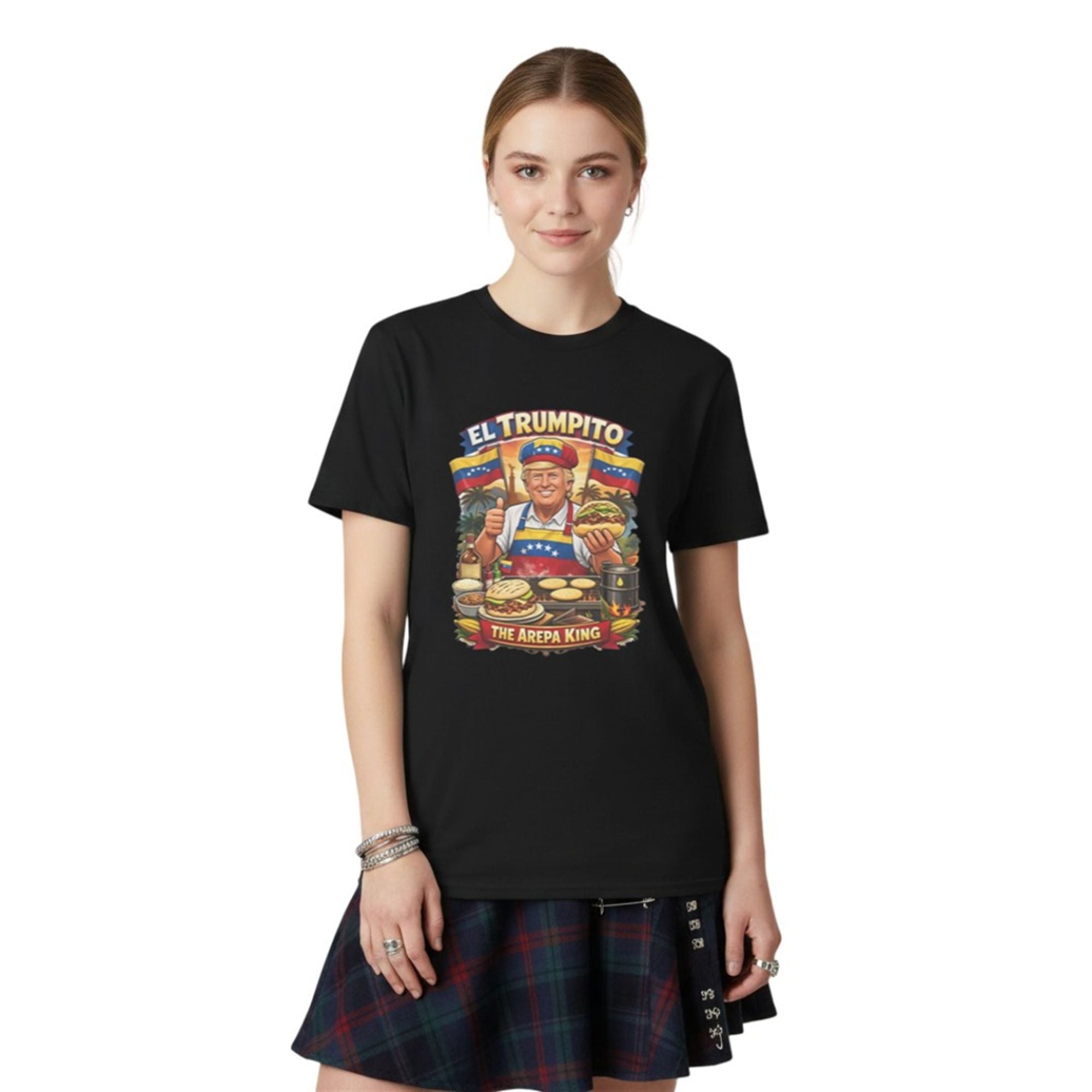 Arepas are a beloved staple of Venezuelan and Latin cuisine. By branding Trump as “The Arepa King,” the design merges political parody with culinary celebration, creating a fusion that resonates across diverse audiences.