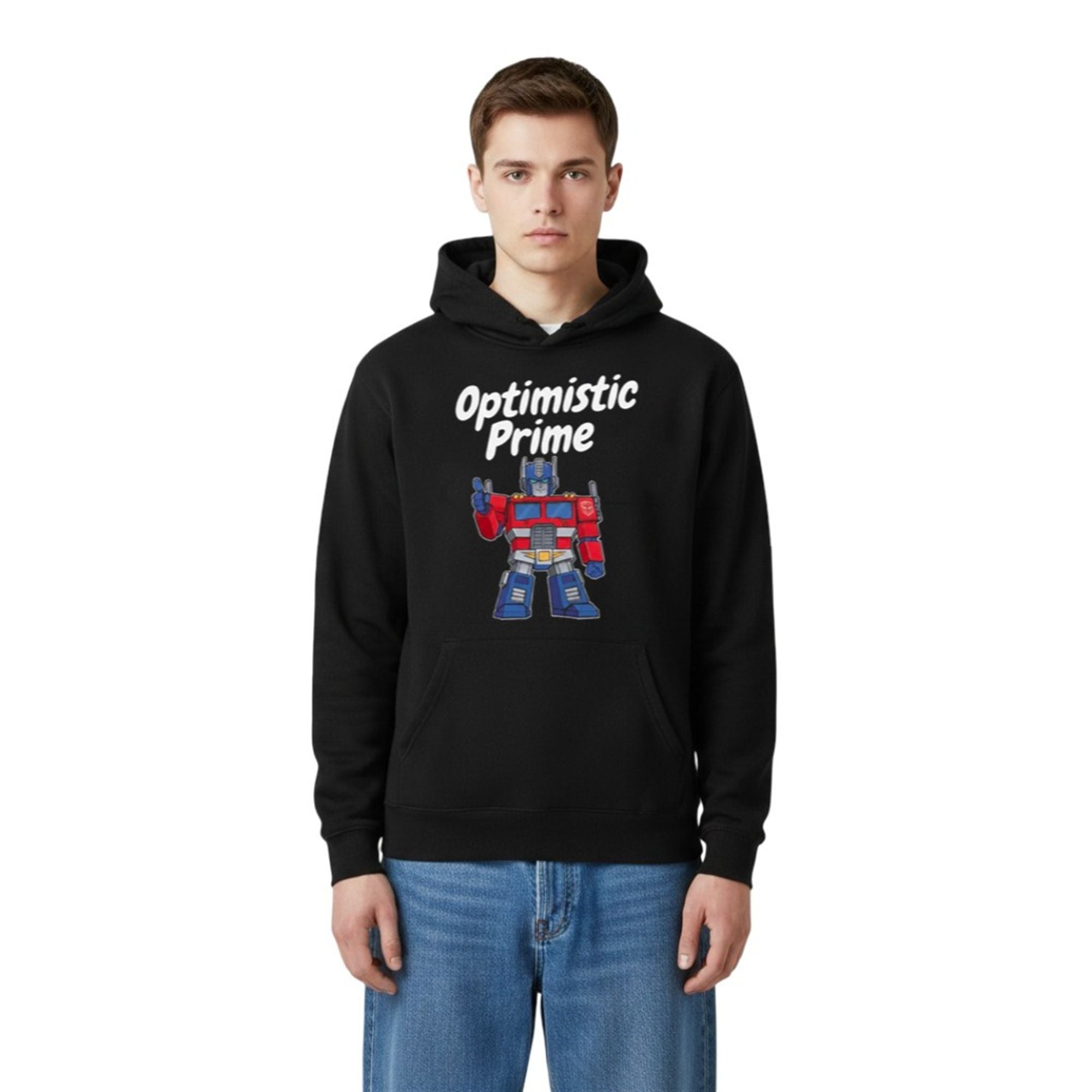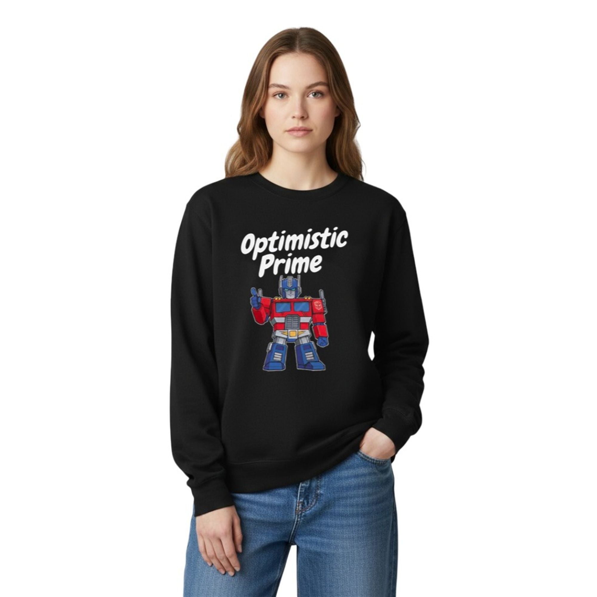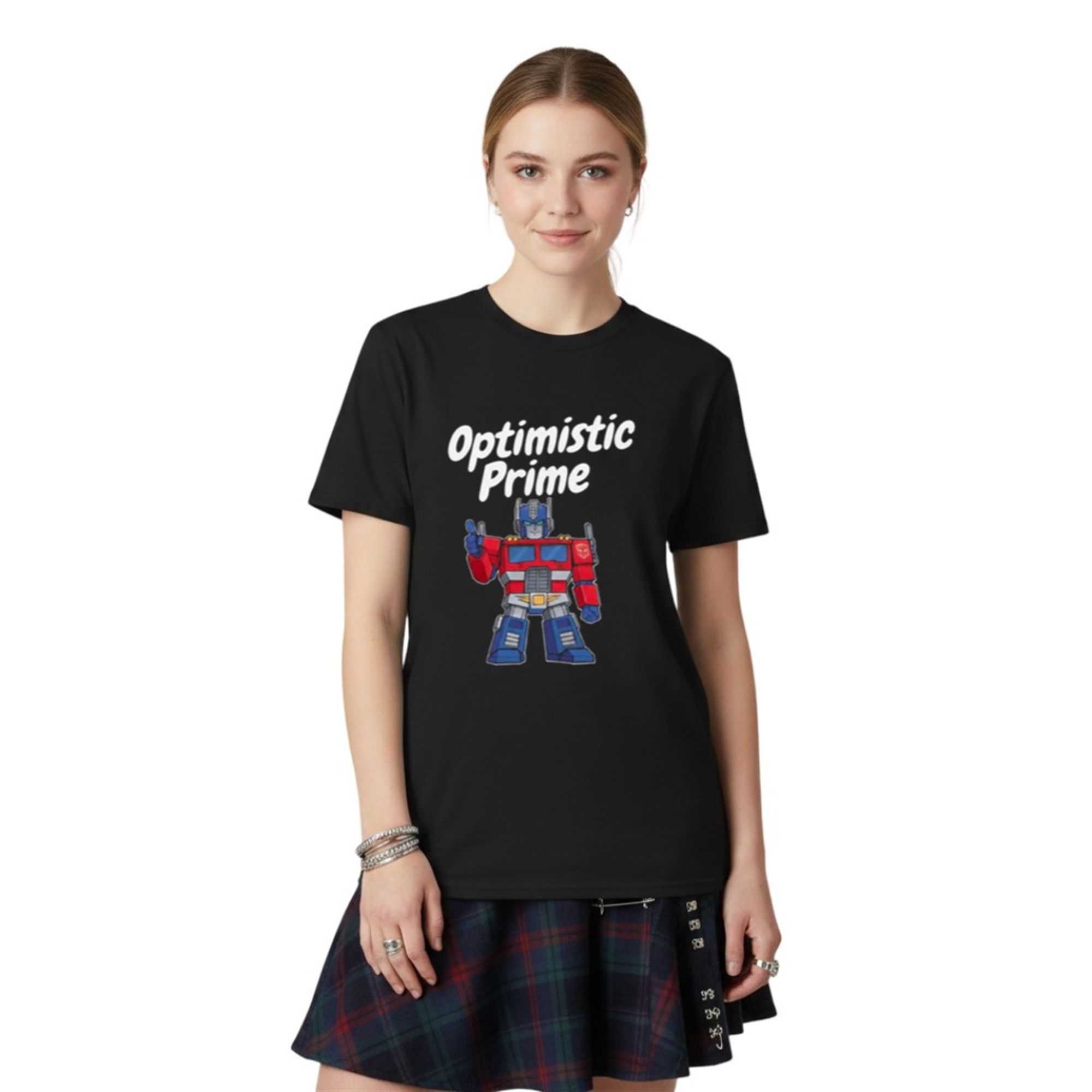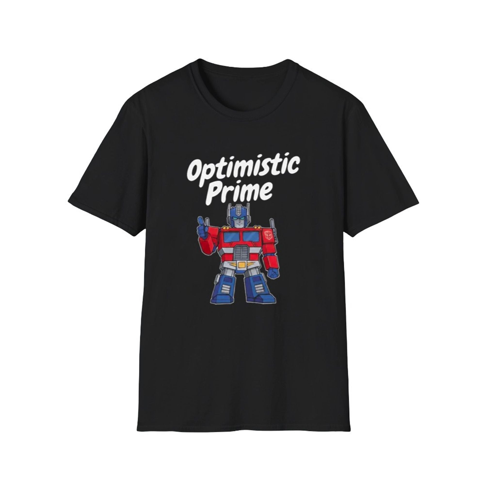 In the fast-paced world of technology and startups, symbolism matters. The shirt features a playful yet powerful pun on the legendary Transformer, “Optimus Prime.” Instead of just a robot leader, the graphic depicts a cheerful, thumbs-up-giving mecha that represents unyielding positivity.
