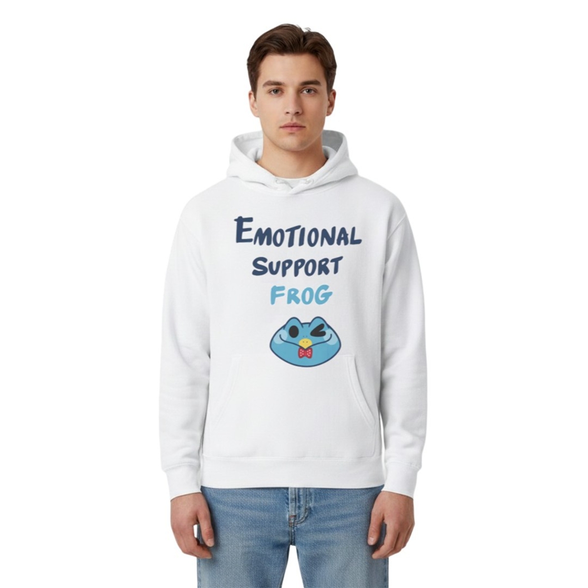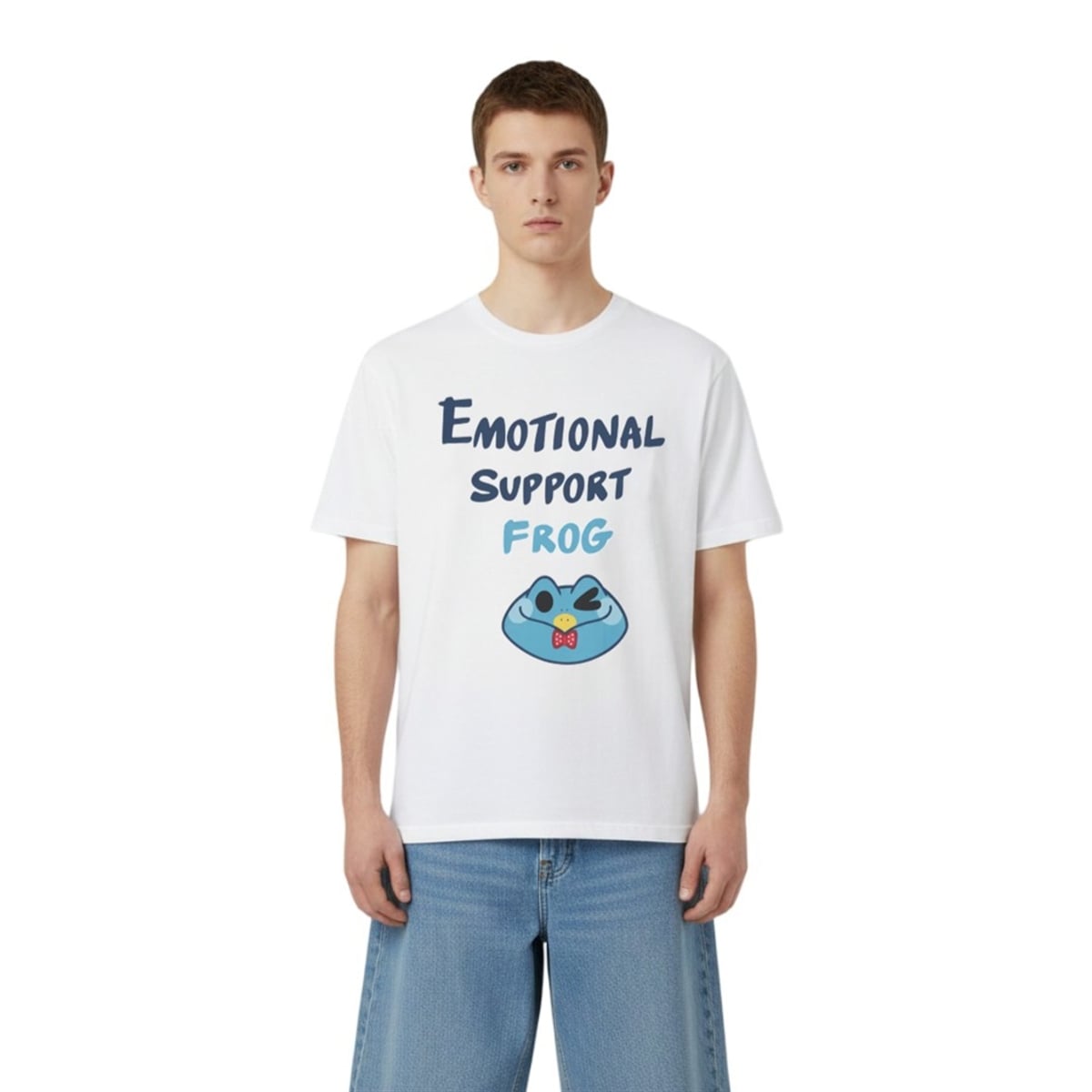 The shirt is a masterclass in combining modern internet humor with eye-catching, character-driven art. The front of the shirt proudly displays the phrase “EMOTIONAL SUPPORT FROG” in a casual, slightly staggered, and highly legible blue font that immediately draws the eye. Below the text sits the star of the show: a stylized, spherical blue frog. With its wide, reassuring smile, a confident wink, a yellow beak-like mouth, and a dapper red bow tie, the character radiates an aura of chaotic but comforting energy. It is an aesthetic that perfectly bridges the gap between niche fandom lore and universal mental health positivity, making it an essential piece for anyone who uses humor to navigate their daily life.