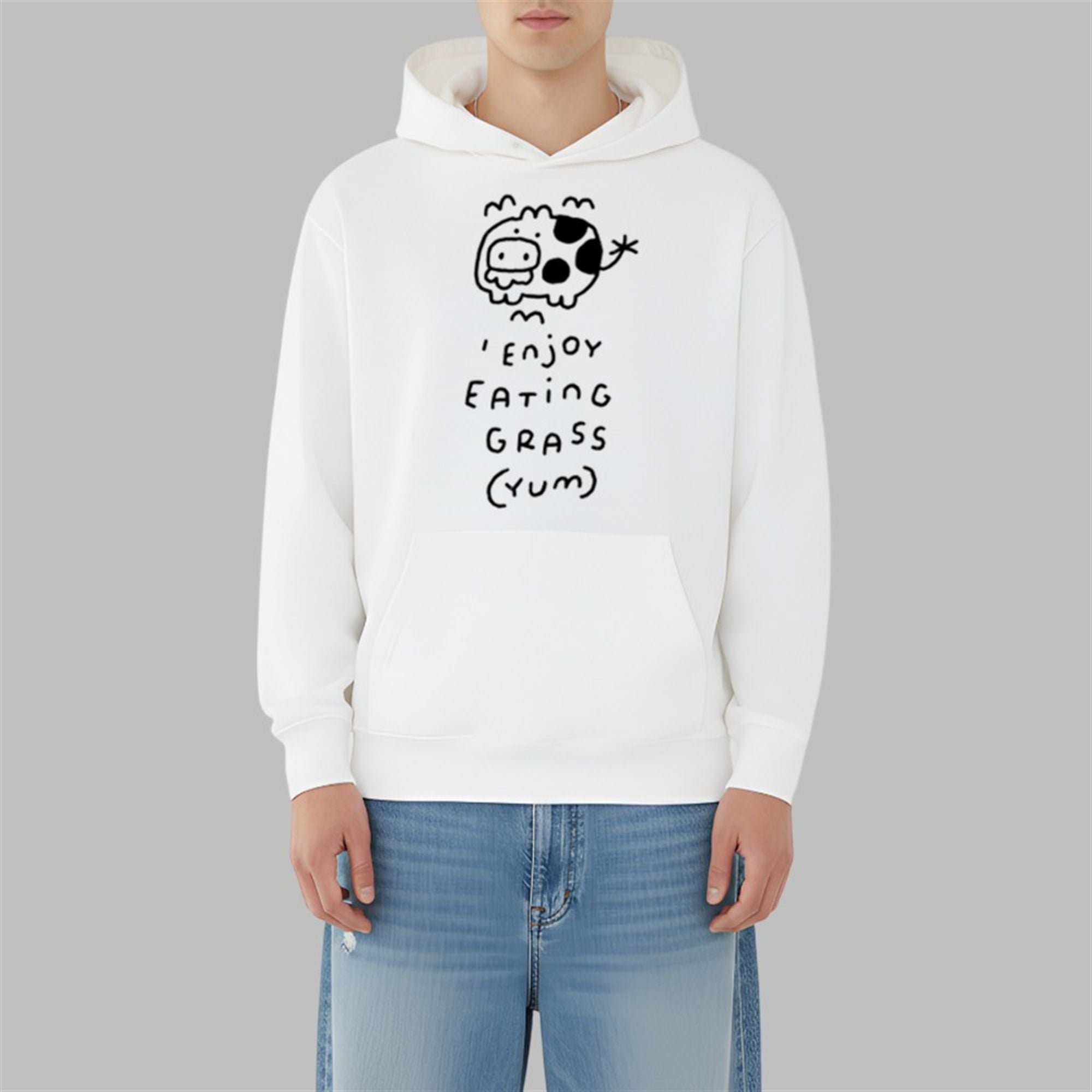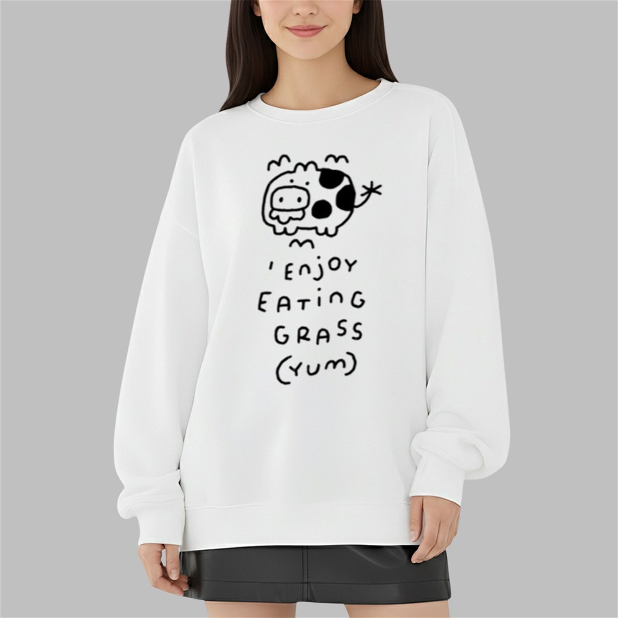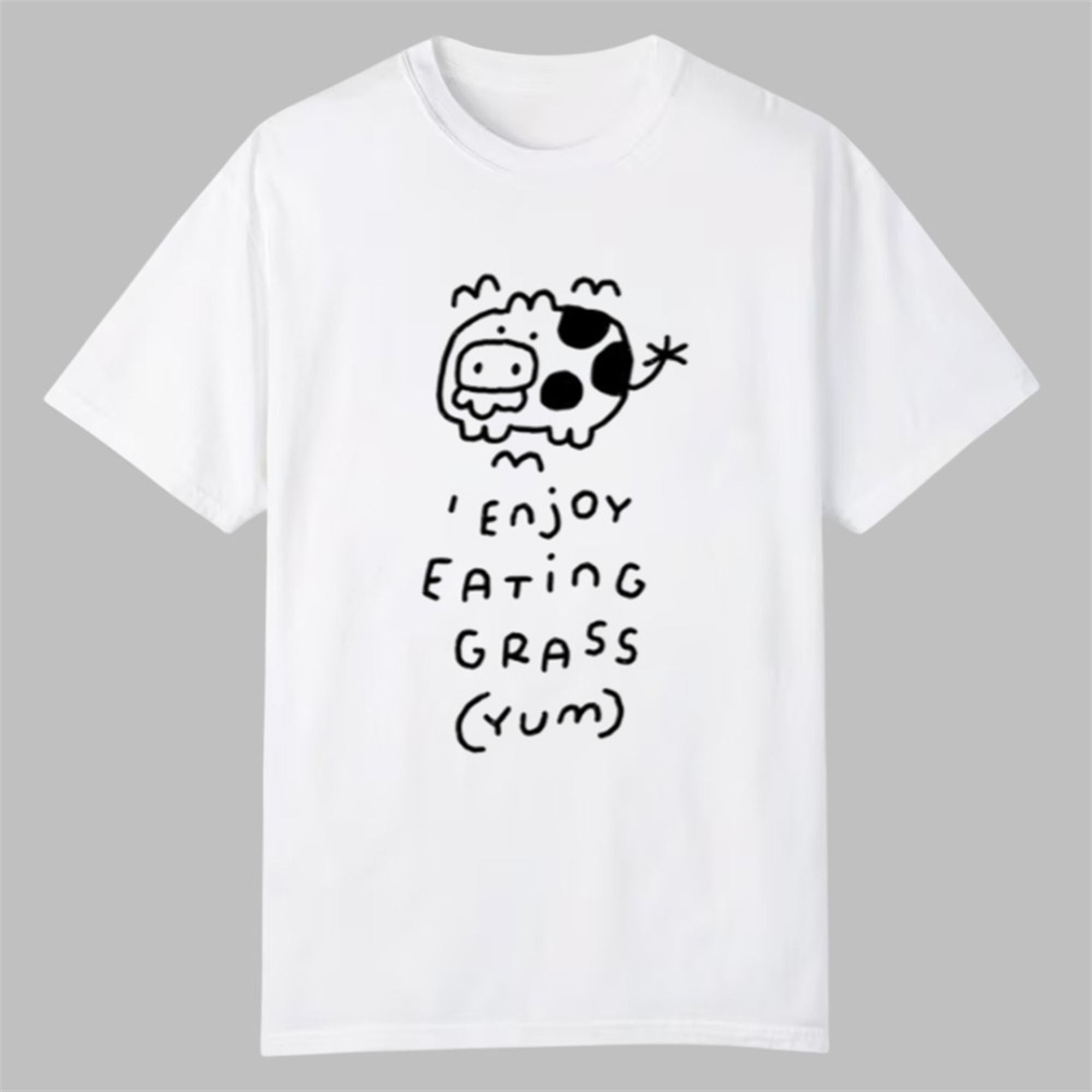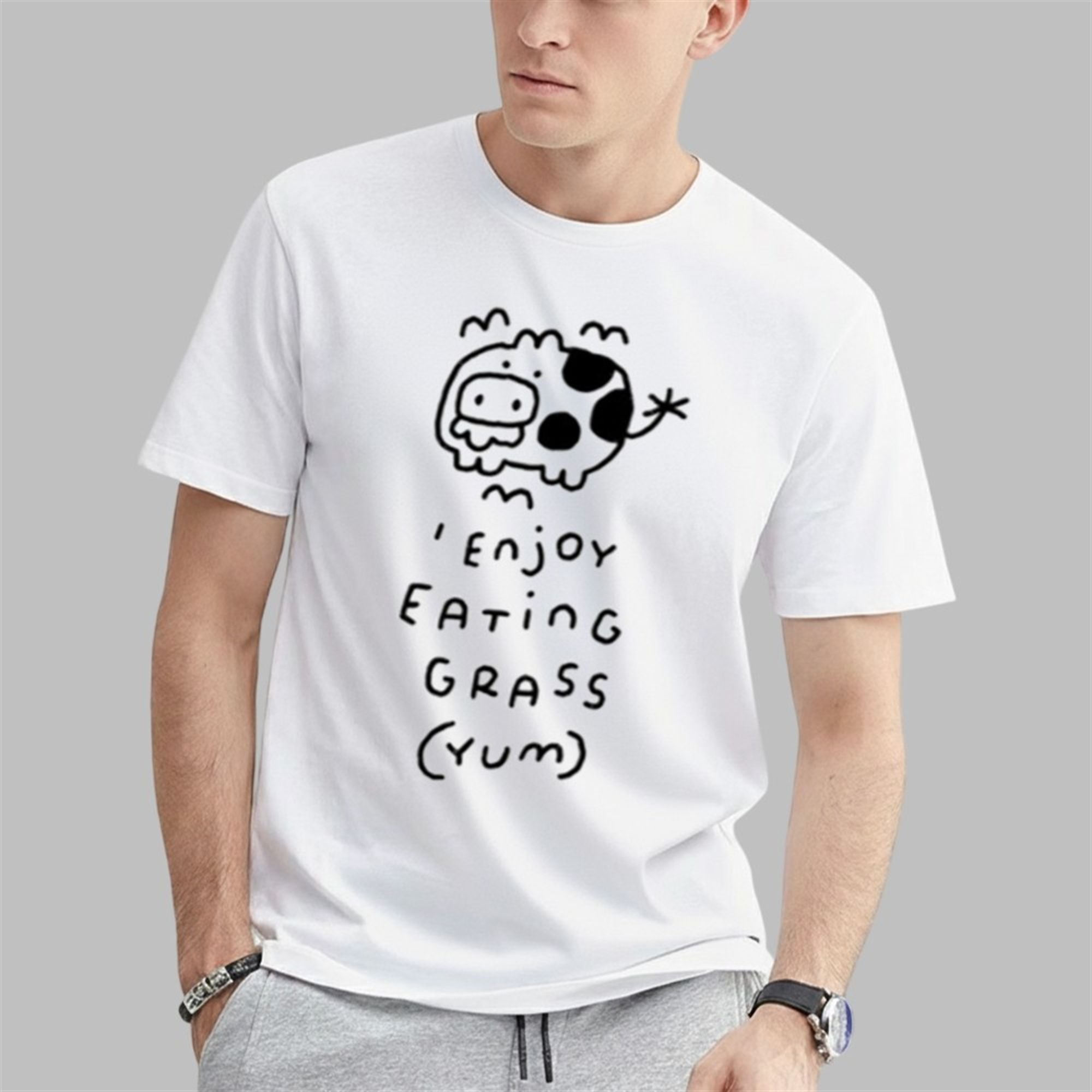 The tee is more than just apparel; it is a rejection of the hyper-serious modern world. The centerpiece of the design features a rotund, blissfully unaware cow, drawn in a deliberately crude, charming doodle style. The accompanying text, “I ENJOY EATING GRASS (YUM),” is written in a matching handwritten font that emphasizes authenticity over perfection.