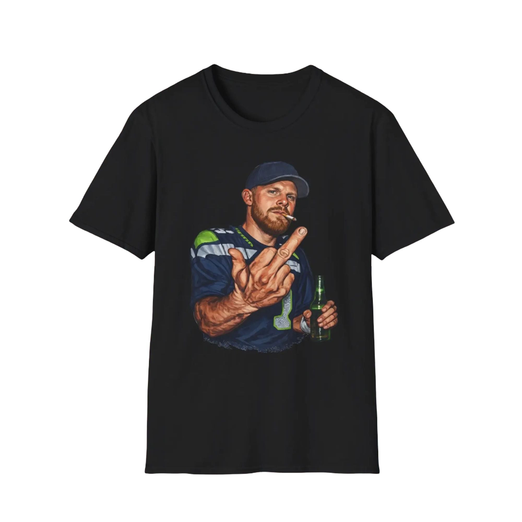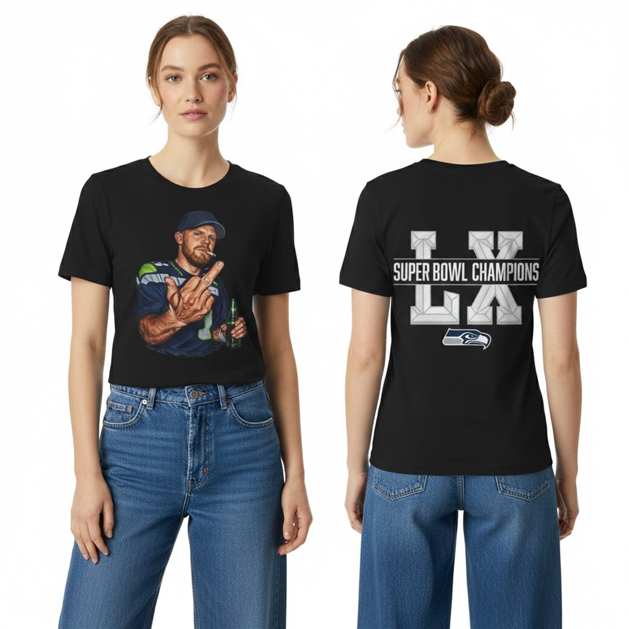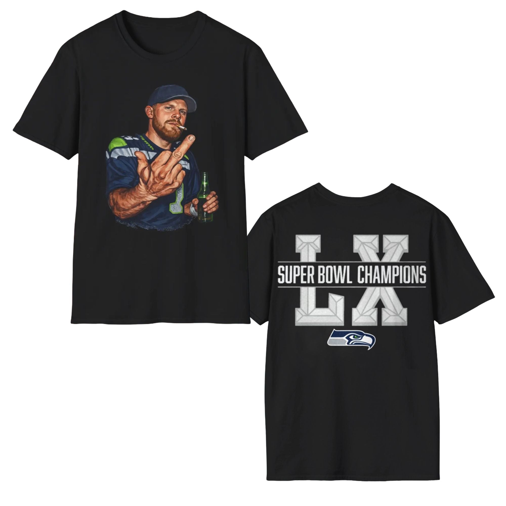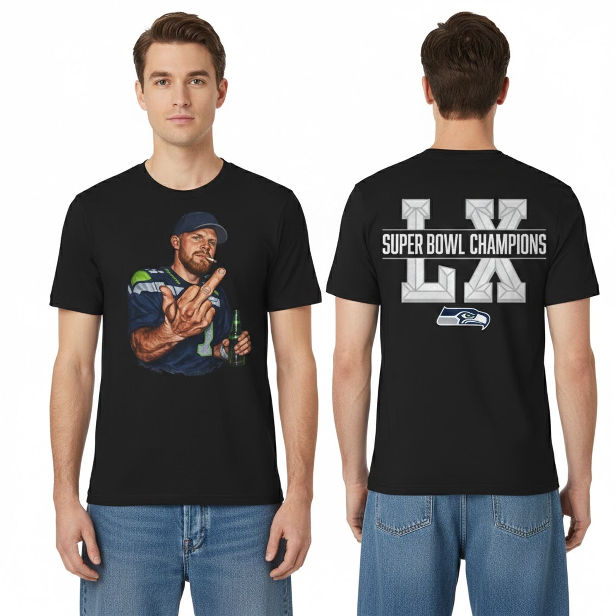 The front graphic features a stylized, painterly rendering of Sam Darnold in a Seahawks jersey, exuding an aura of rock-star indifference with a lit cigarette and a beer bottle, flipping the bird to the doubters. The back of the shirt anchors the design in reality with a bold “Super Bowl Champions LX” graphic, solidifying its place as victory memorabilia. This double-sided design ensures you are making a statement coming and going.