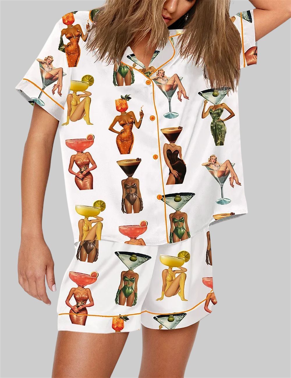 The custom, all-over print features a playful and sophisticated gallery of stylized figures artfully blended with classic cocktail glasses, celebrating a spirit of fun and femininity. The rich, vibrant colors pop against the crisp white background, while elegant golden-orange piping adds a final touch of polished luxury. This set is crafted for making memories, whether you’re hosting a girls’ night, enjoying a quiet evening with a book, or waking up to Sunday brunch at home.