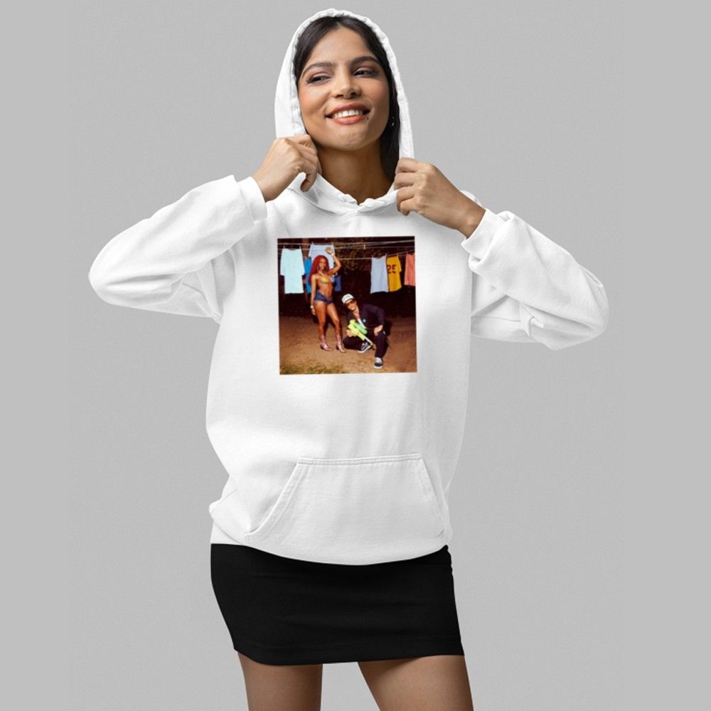This “Fat Juicy & Wet Throw It Up Shirt” showcases a memorable image. The photograph captures the unique style, pose and energy. Behind them, a backdrop of hanging clothes adds an urban, authentic feel to the scene, grounding the image in the reality of their roots.