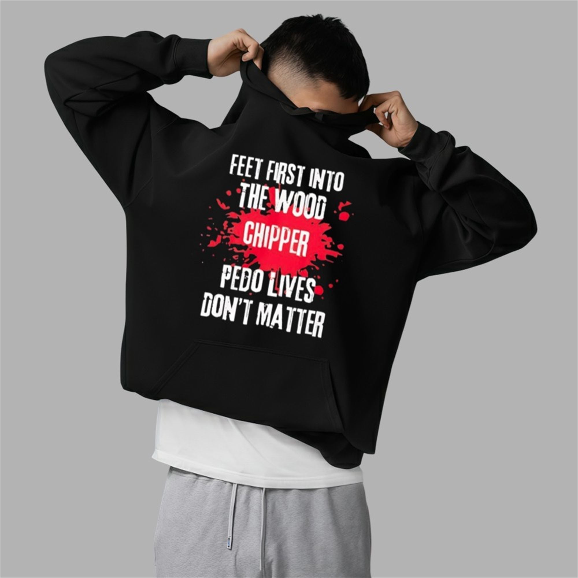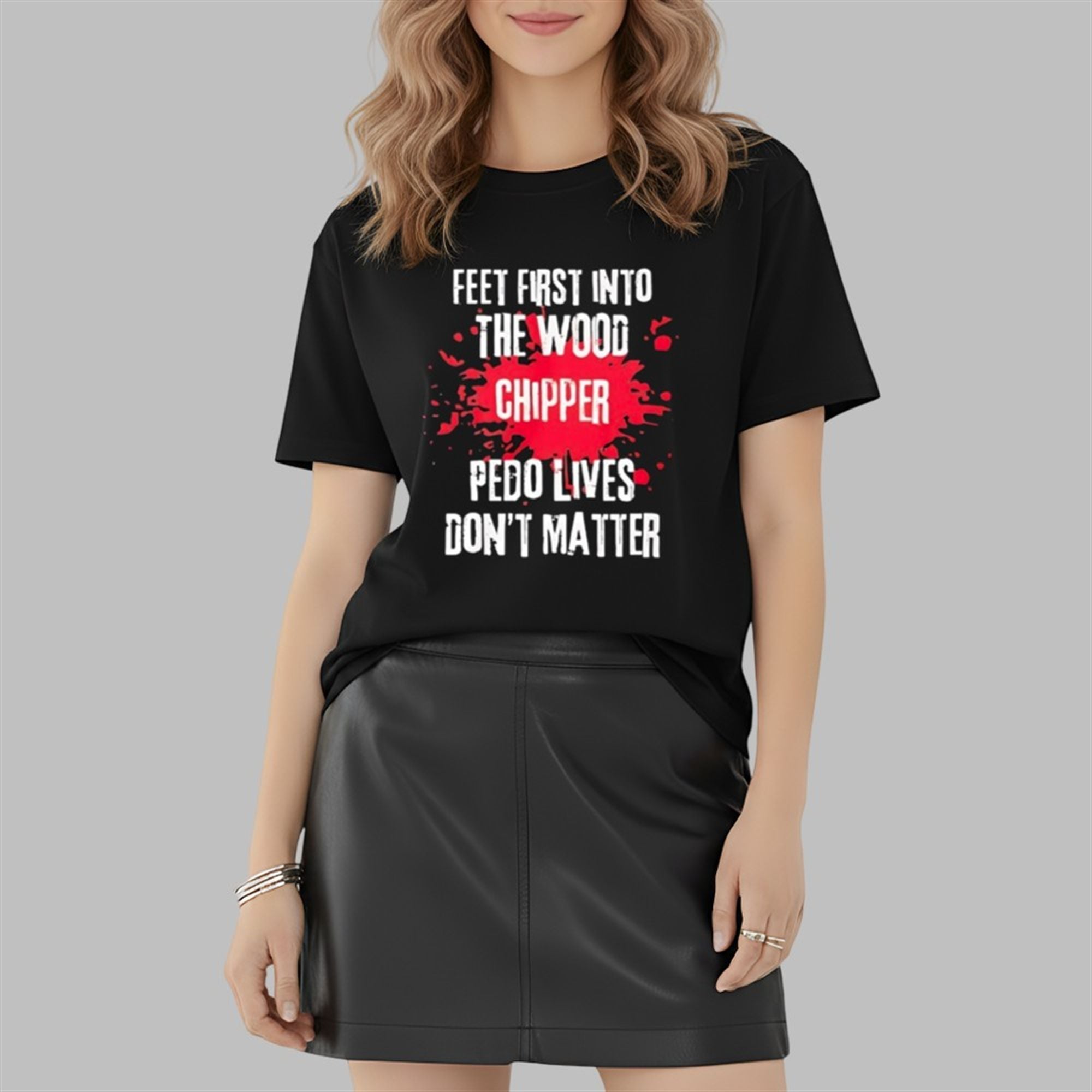 The design features the provocative slogan “Feet First Into The Wood Chipper” followed by “Pedo Lives Don’t Matter,” set against a striking red splatter background. The typography utilizes a distressed, grunge-style font that complements the aggressive and serious nature of the message. This isn’t just a novelty item; it is a piece of conviction clothing meant for bikers, veterans, parents, and anyone with a dark sense of humor and a strong moral compass regarding child safety.
