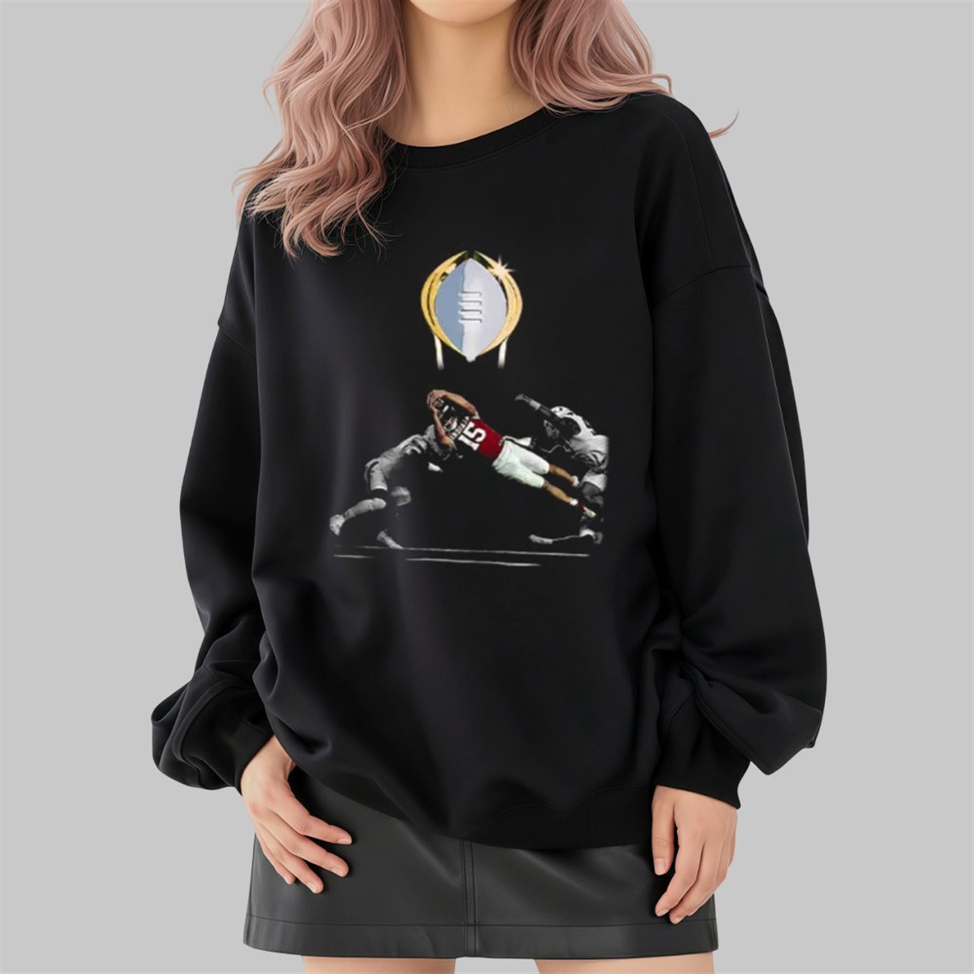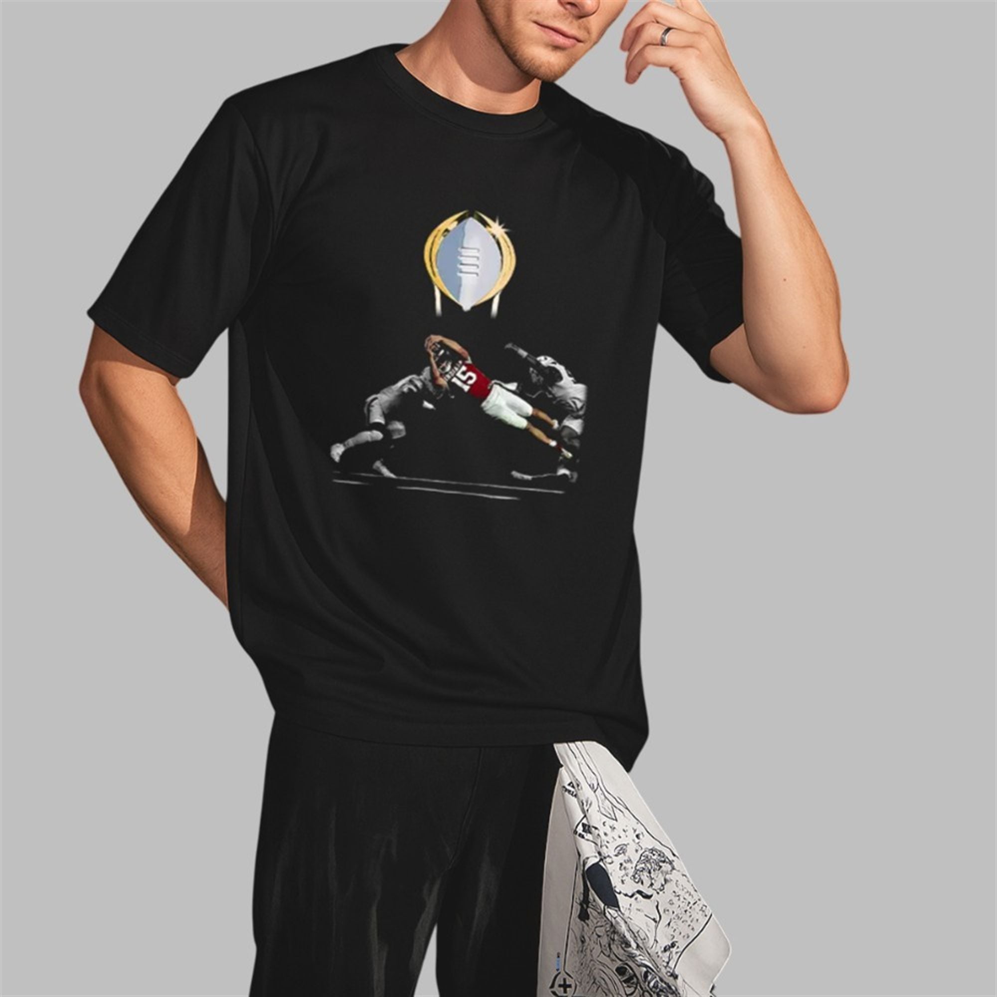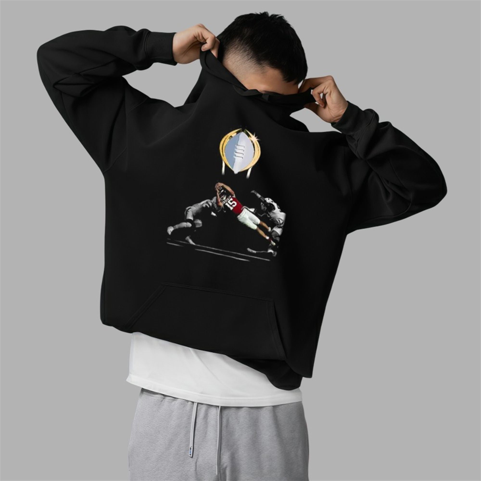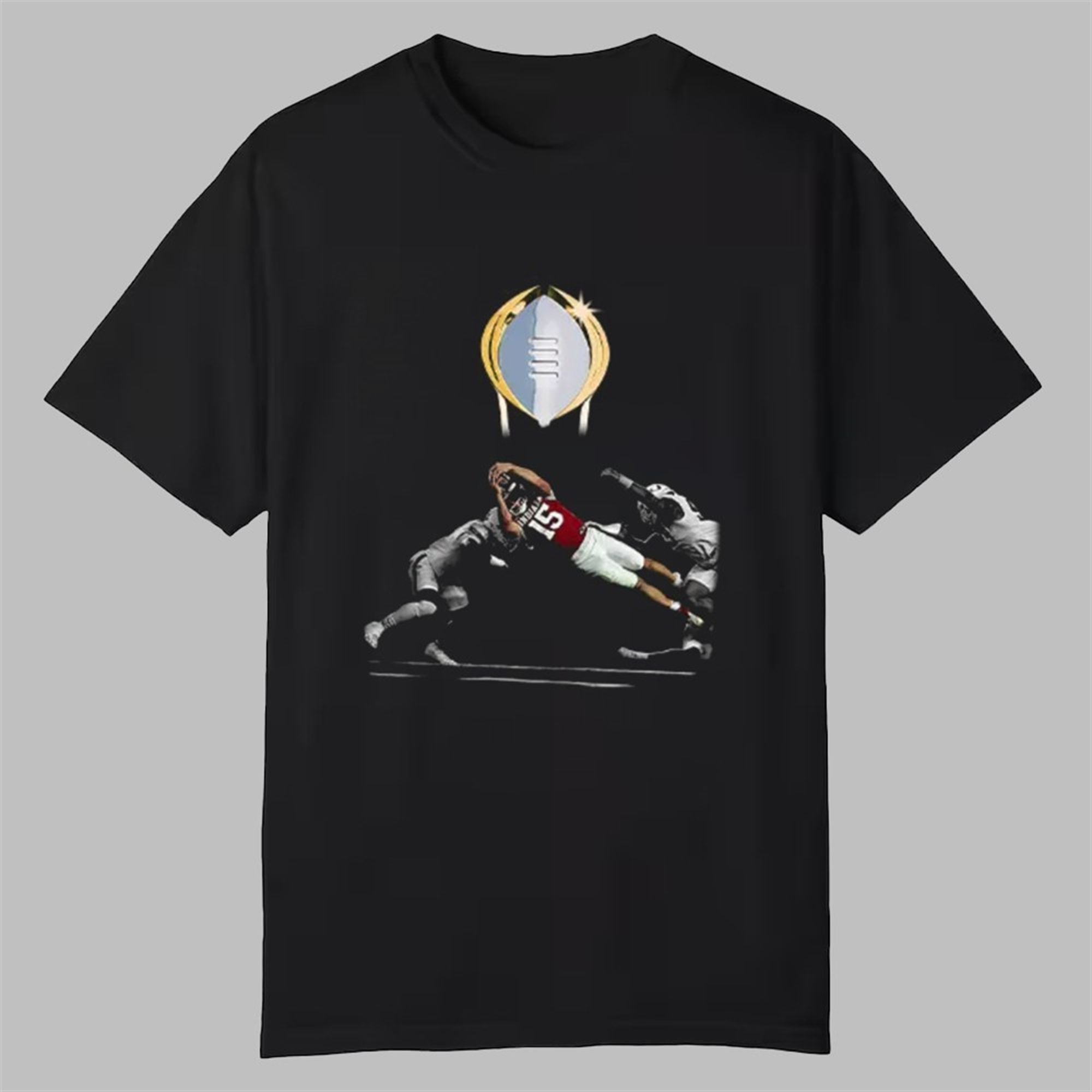 This design freezes time at the absolute peak of the 2026 National Championship run. The graphic focuses on the raw intensity of Number 15’s legendary diving touchdown—the play now etched in Indiana lore as “The Leap.” By isolating the player against a deep void background, the artwork emphasizes the solitude of the quarterback’s decision to put his body on the line for the glory of the team. The golden trophy hovering above serves as the halo of victory, linking the individual Heisman brilliance to the ultimate team triumph.