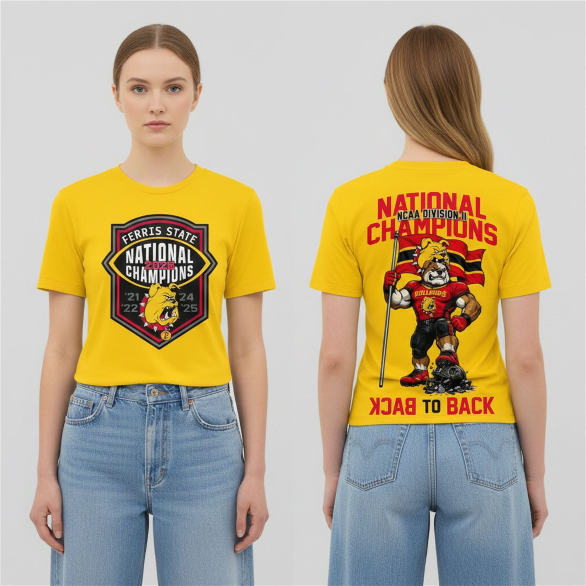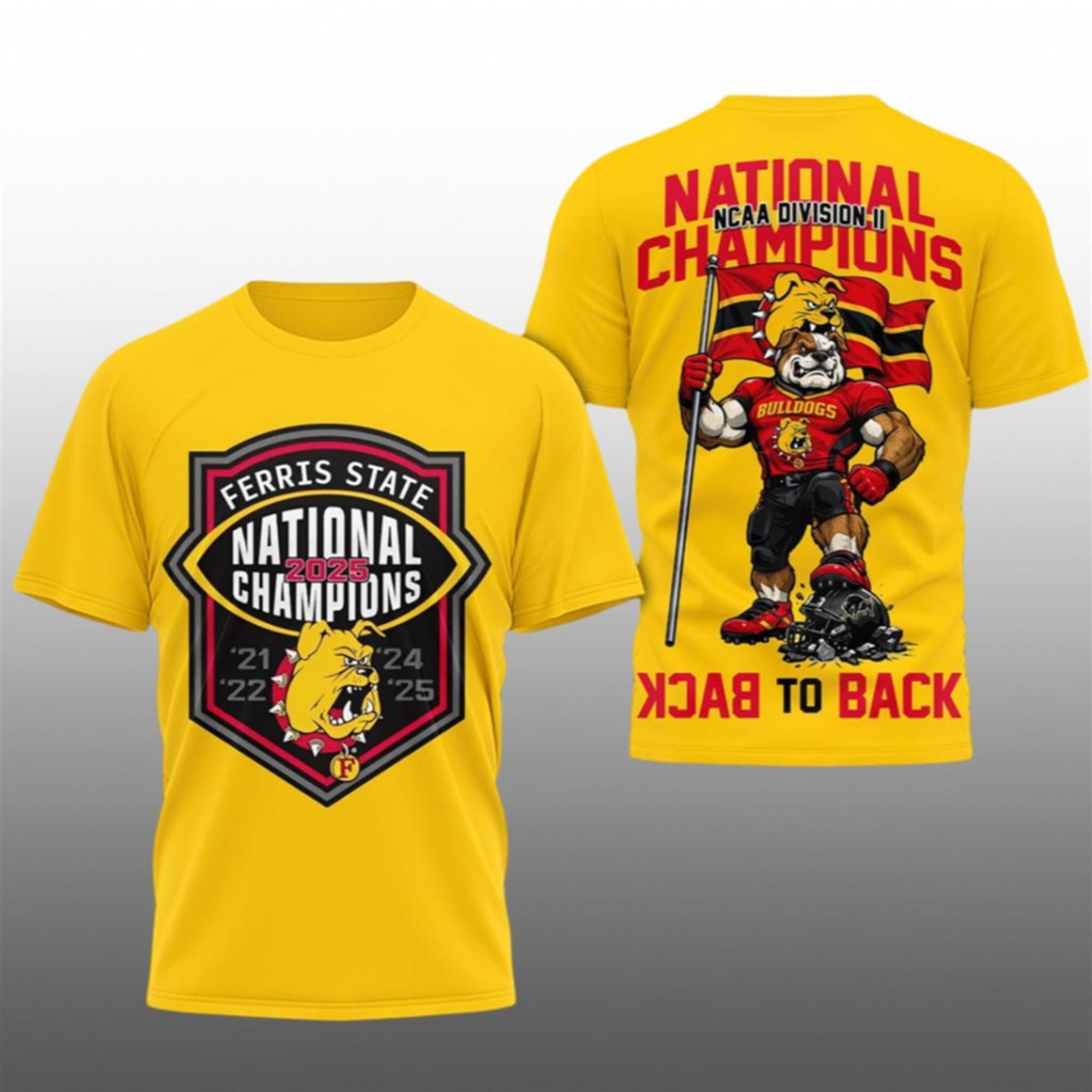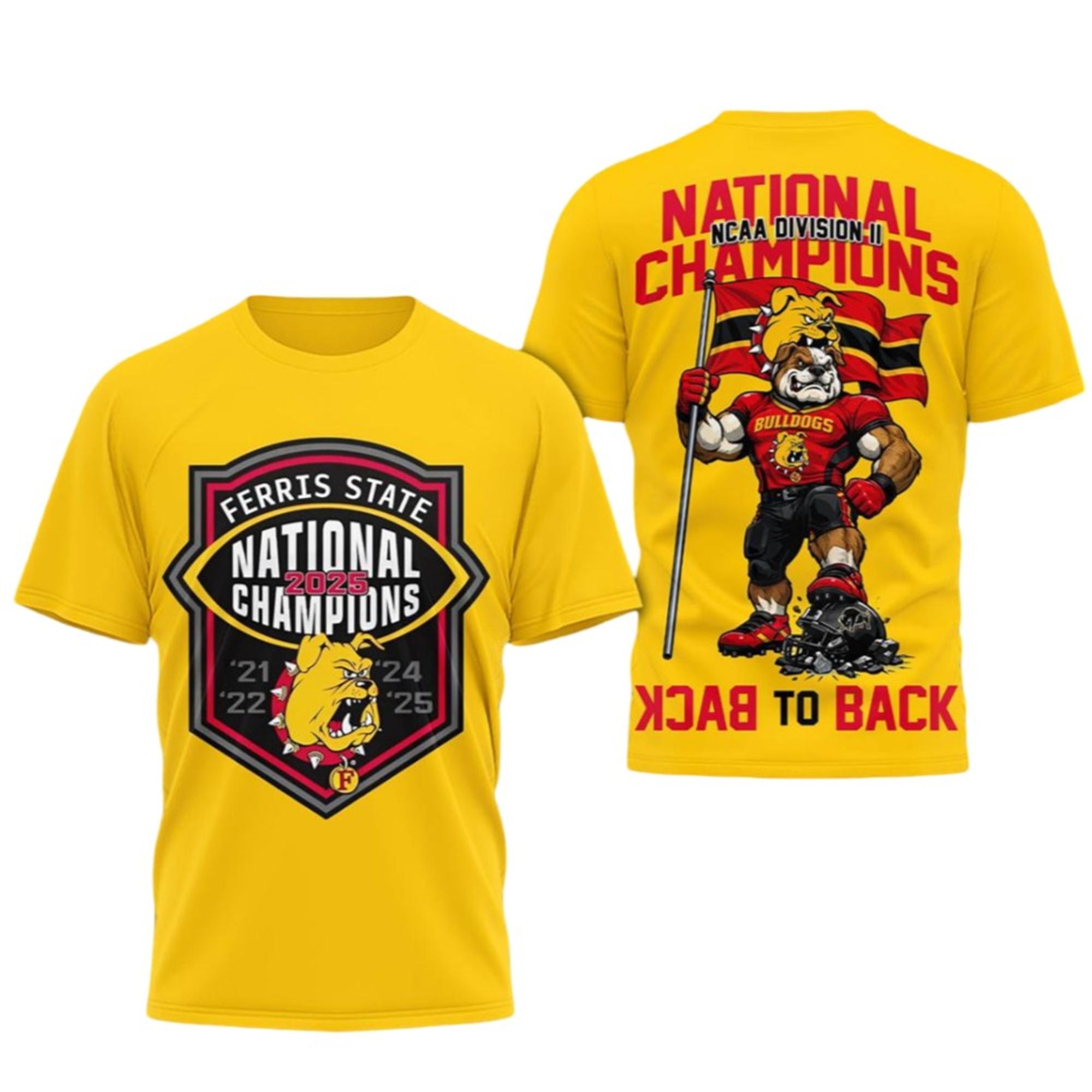 Back Design: The reverse side makes a massive statement with the text “BACK TO BACK” mirrored at the bottom. A full-body illustration of the muscular Bulldog mascot stands triumphantly atop a crushed opponent’s helmet, waving the team flag. Above him, the “Division II National Champions” text ensures everyone behind you knows exactly who rules the gridiron.