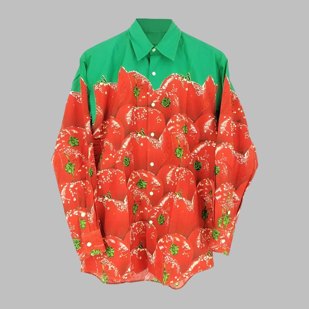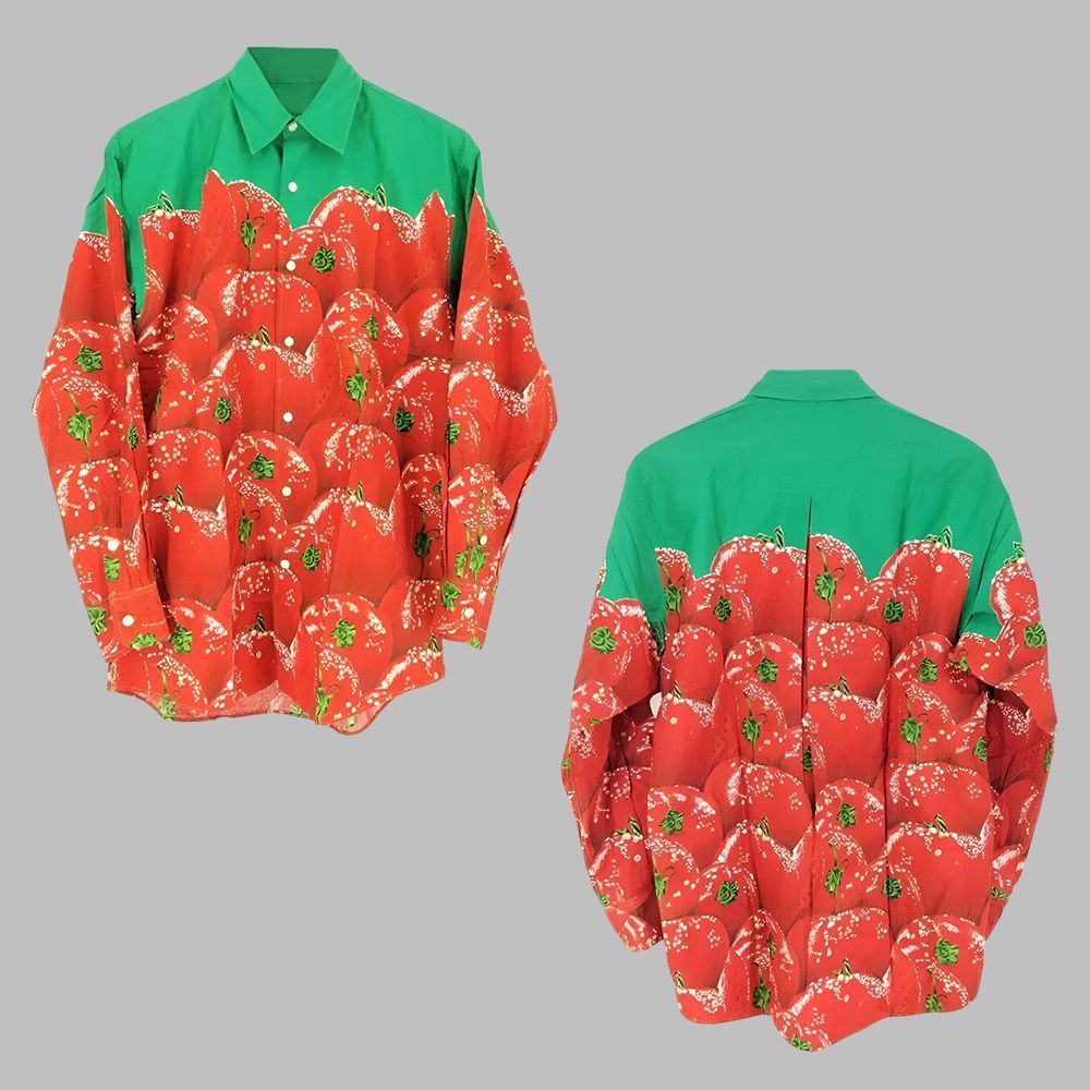 The design features a cascade of brilliantly red, ripe tomatoes, creating a visually arresting pattern that is both playful and bold. The all-over print is sharp, detailed, and bursting with color, ensuring that the design remains vivid wash after wash. Contrasting this sea of red is a sharp, solid green yoke and collar, perfectly evoking the image of fresh tomatoes still on the vine. This clever color blocking not only enhances the visual appeal but also frames the piece, giving it a structured yet fluid look that is flattering for all body types. It’s a wearable masterpiece that perfectly balances chaos and composition.