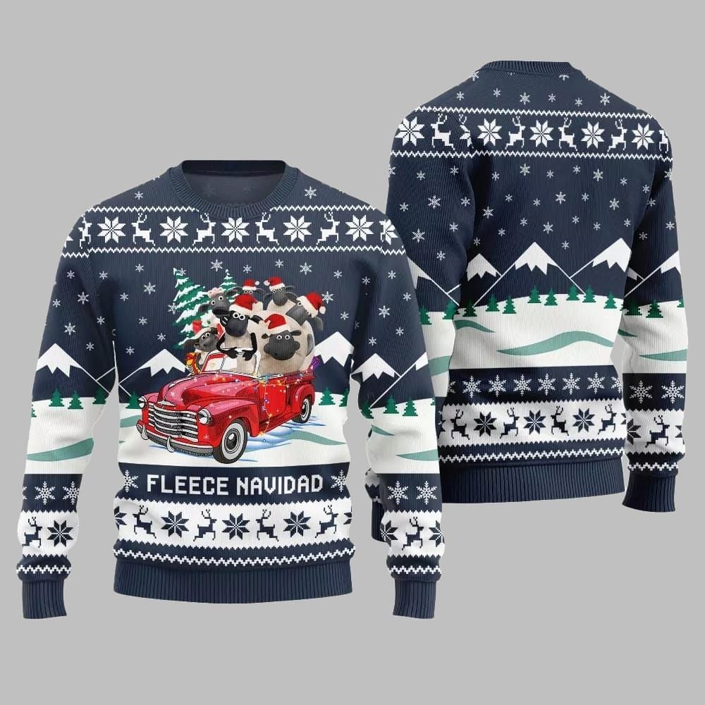 Get ready to sleigh the holiday season with Fleece Navidad Ugly Sweater 2025 Christmas. This masterfully designed sweater is the perfect storm of holiday cheer, nostalgic vibes, and clever wordplay. The vibrant royal blue backdrop is adorned with classic patterns of crisp white snowflakes and dashing reindeer, setting a timeless Christmas scene. However, the true magic is in the central graphic: a charming, vintage-style red pickup truck, bursting with holiday spirit and carrying the season’s most adorable passengers. A cheerful flock of fluffy sheep, each sporting a jaunty Santa hat, are piled in the back, ready to spread joy and laughter.