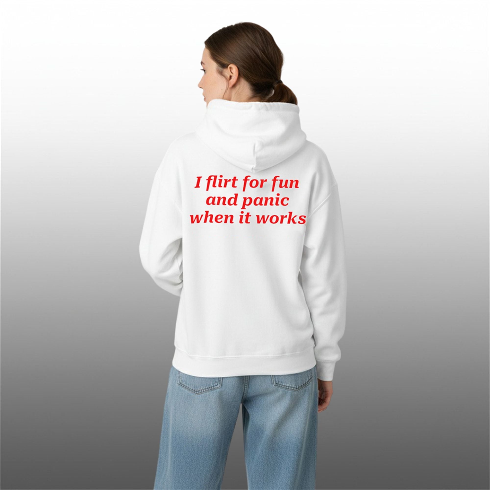 In a world dominated by visual storytelling, your outfit is your headline. This shirt features a clean, minimalist aesthetic that prioritizes the message above all else. The design utilizes a classic serif font in a striking, deep red hue,”Flirt for Fun and Panic When It Works” centered on the back of the garment for maximum impact as you walk away.