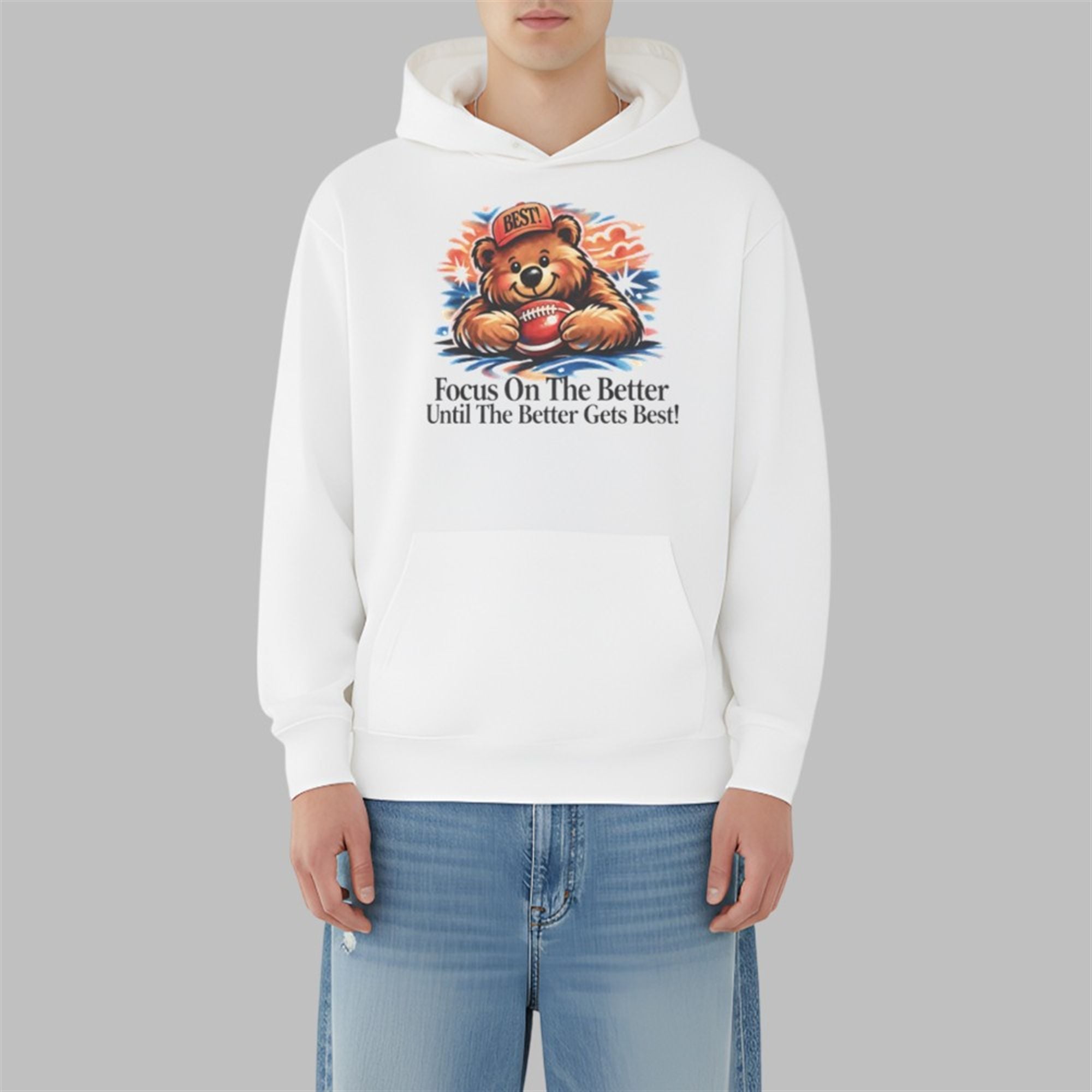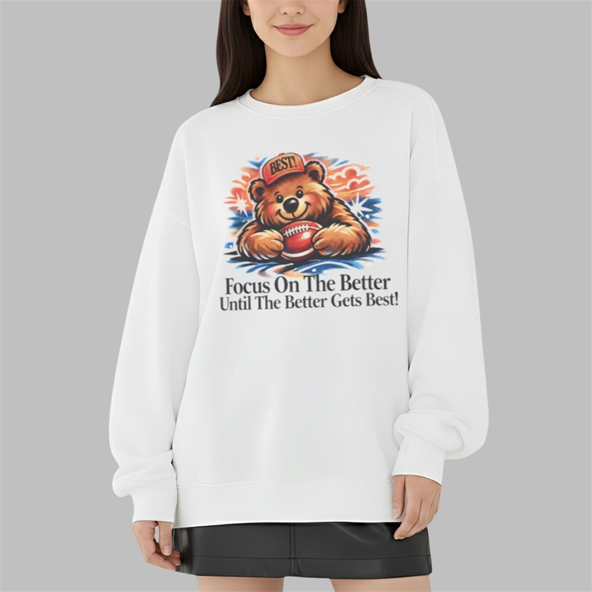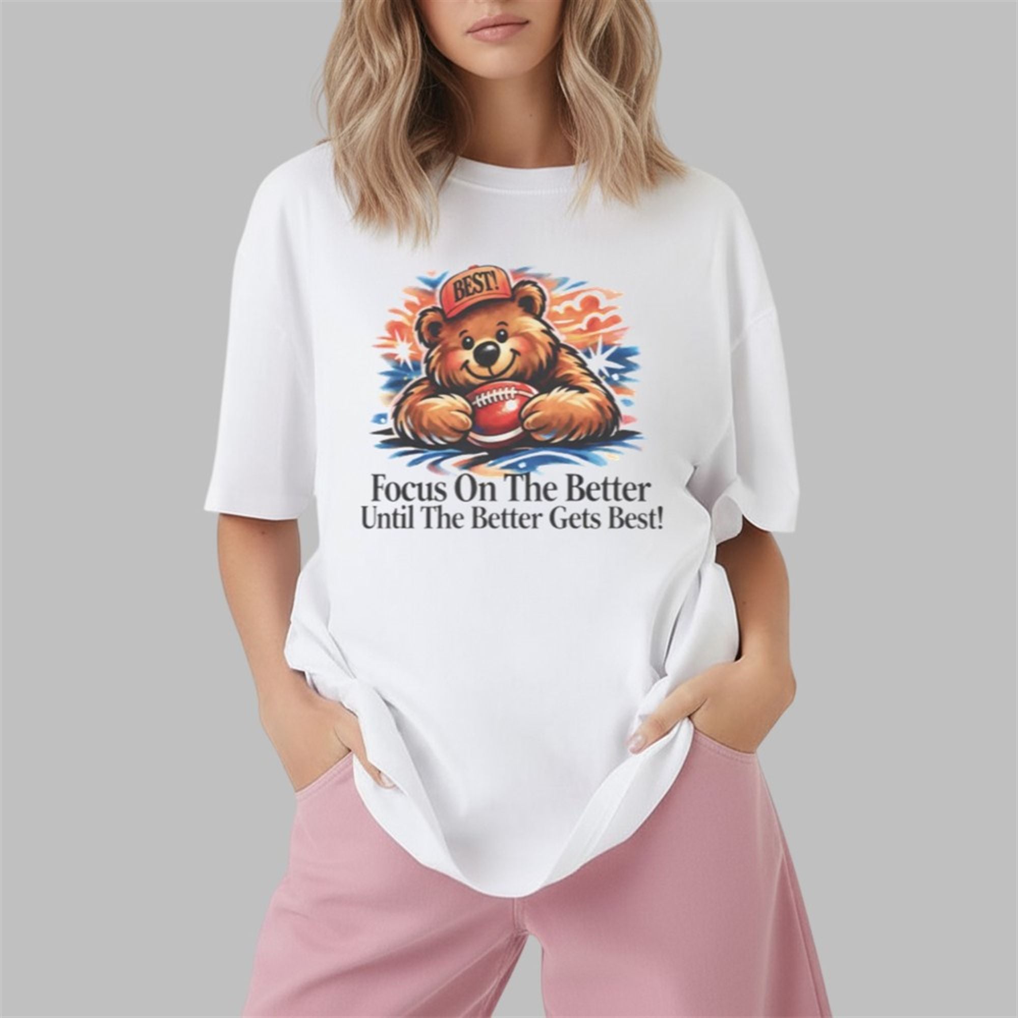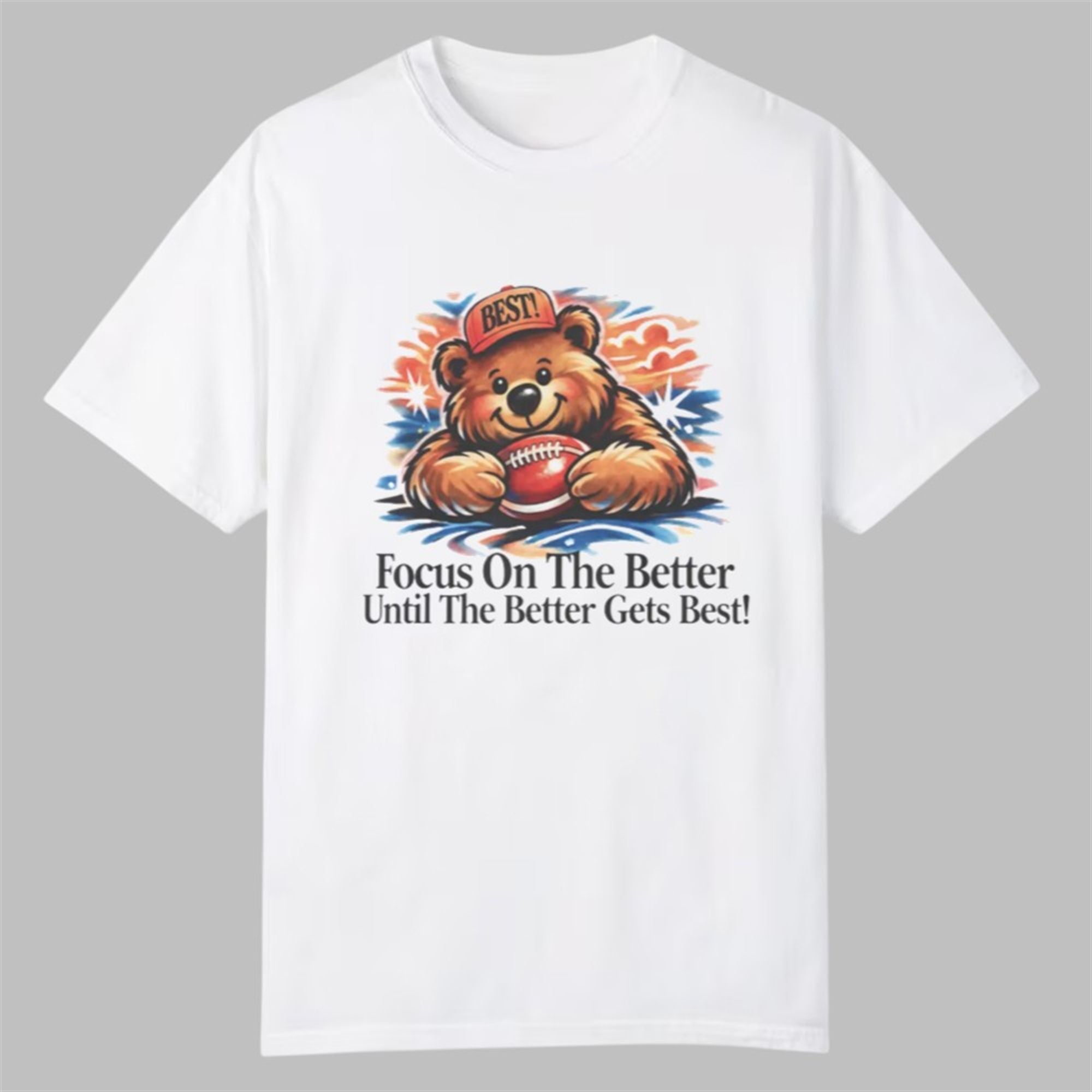 In a world that moves fast, finding reminders to stay grounded and focused is essential. This shirt delivers that reminder in the most charming way possible. The centerpiece of the design is a beautifully illustrated bear, beaming with a smile while lying prone with an American football. The bear dons a spirited red cap emblazoned with the word “BEST!“, immediately setting a tone of high achievement and confidence.