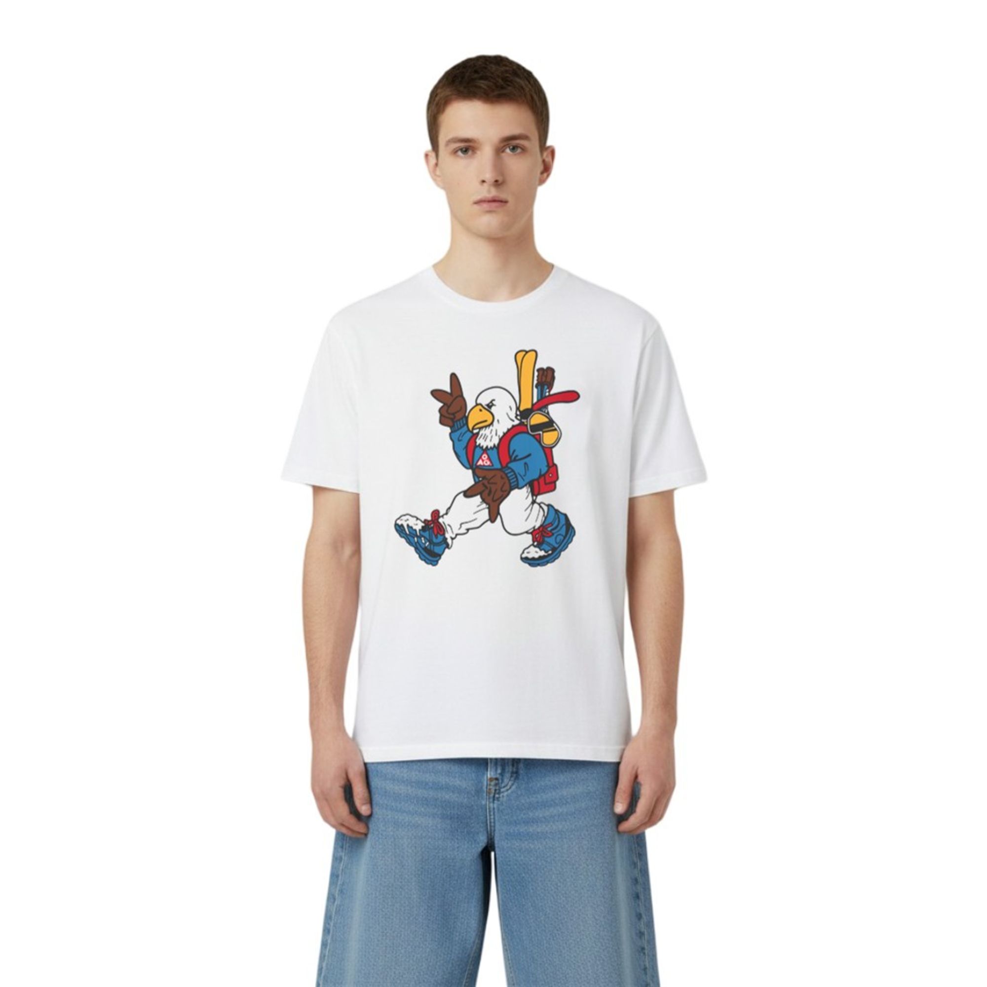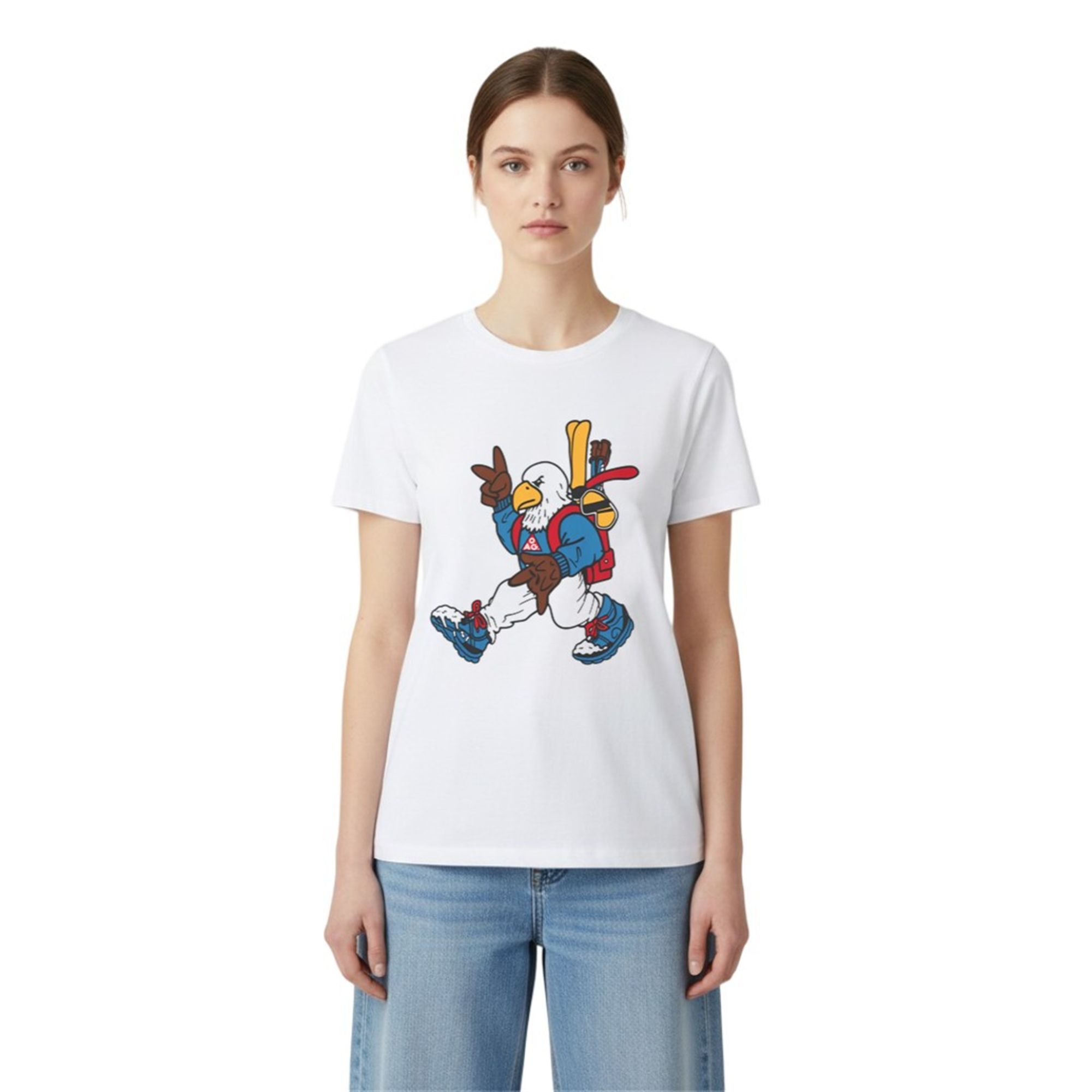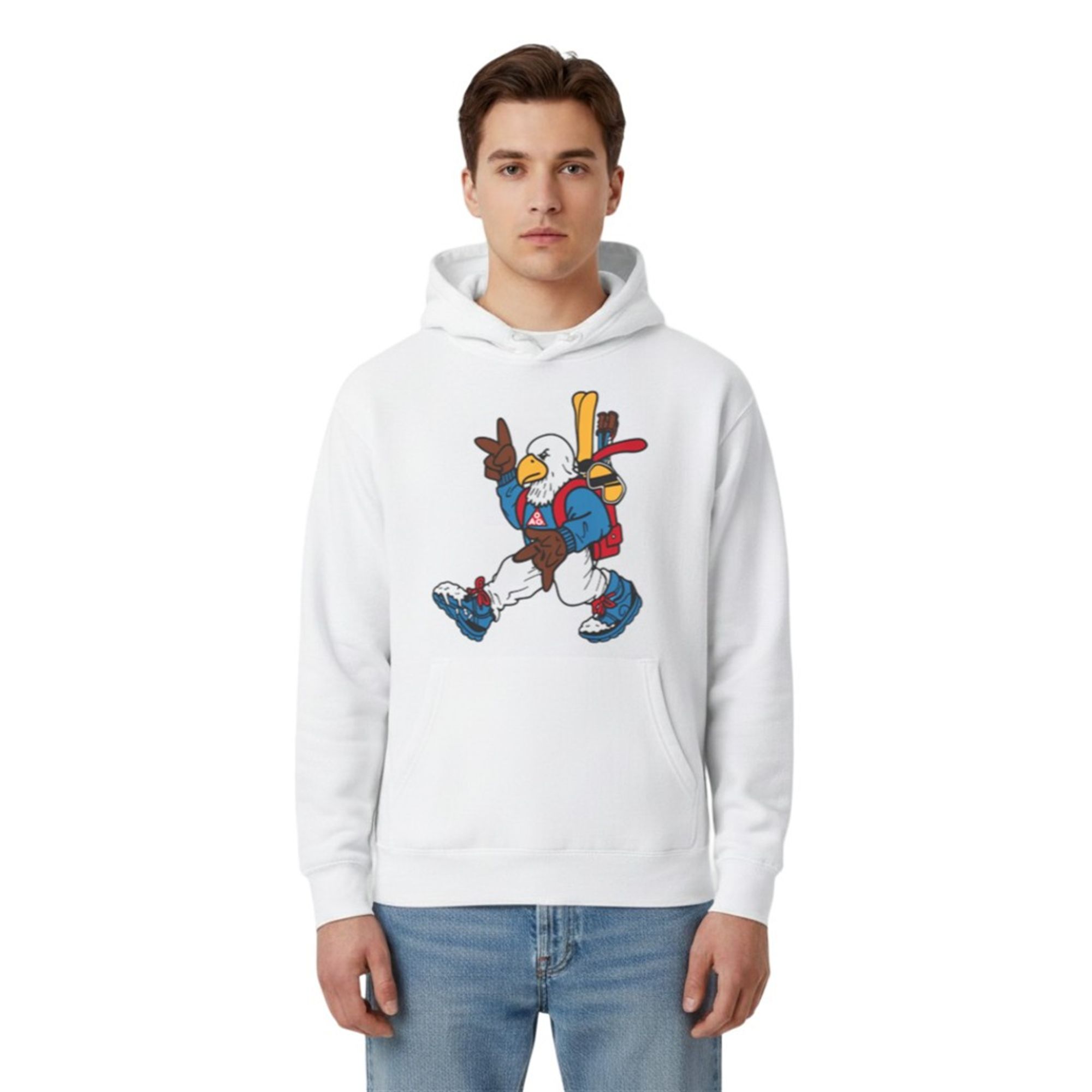 The visual appeal of the shirt lies in its masterful execution of retro-inspired character art. The centerpiece is a fiercely cool, anthropomorphic bald eagle fully outfitted for an alpine adventure. Sporting a vibrant blue winter jacket adorned with a classic red triangle crest, snow-ready blue boots, and a red backpack carrying bright yellow skis, the mascot exudes absolute confidence while throwing up a casual peace sign. The artwork leverages bold, comic-style outlines and striking color blocking that commands attention from across the room. It is a design that doesn’t take itself too seriously, yet perfectly captures the cool, unbothered energy of an elite athlete off the ice.
