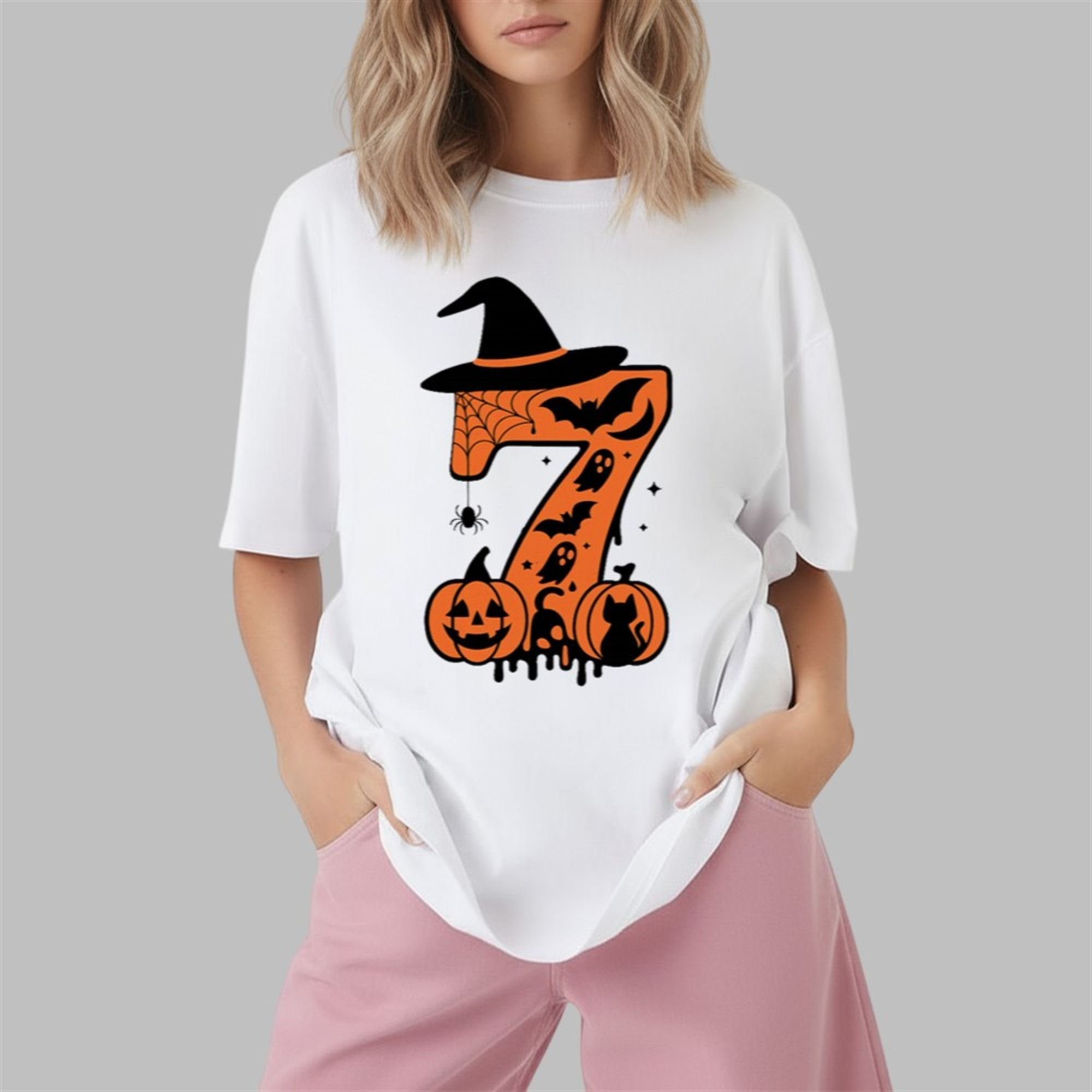 This shirt is specially designed for parents, grandparents, and relatives looking for the perfect birthday gift for a child celebrating their 7th birthday during the fall season. If you’re tired of spending money on uncomfortable, single-use costumes that your child will only wear for a few hours, this t-shirt is your ideal alternative. It brilliantly serves a dual purpose: it’s a proud announcement of their new age and a completely effortless, no-fuss Halloween costume.