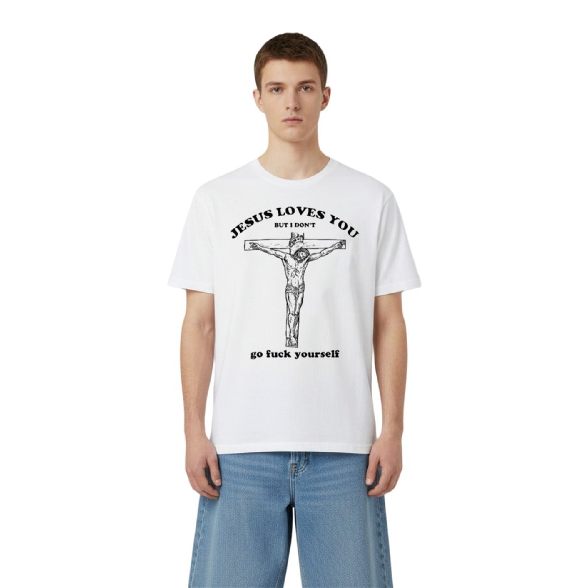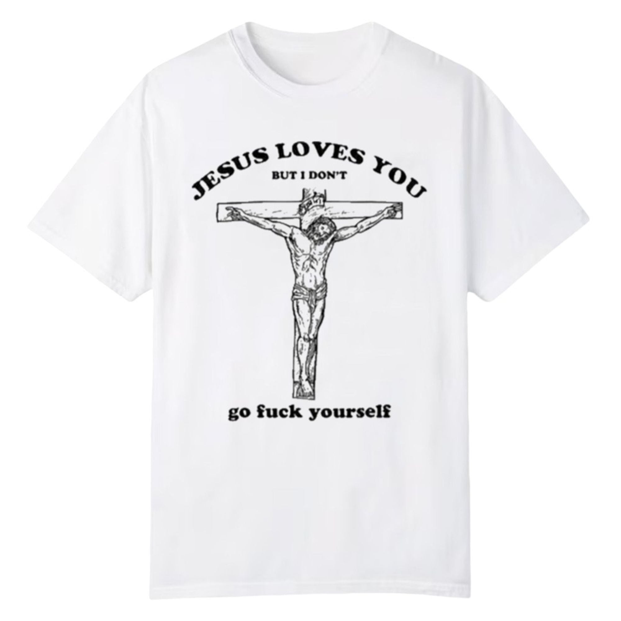 In the landscape of 2026 fashion, where “loud luxury” is fading in favor of “loud messaging,” this graphic tee stands supreme. The design features a classic, monochromatic illustration of religious iconography—specifically a detailed sketch of the crucifixion—offset by a curved, bold serif font. The top text reads a comforting “JESUS LOVES YOU,” luring the viewer in, before the punchline lands at the bottom in a stark gothic or typewriter font: “BUT I DON’T… go fuck yourself.”
