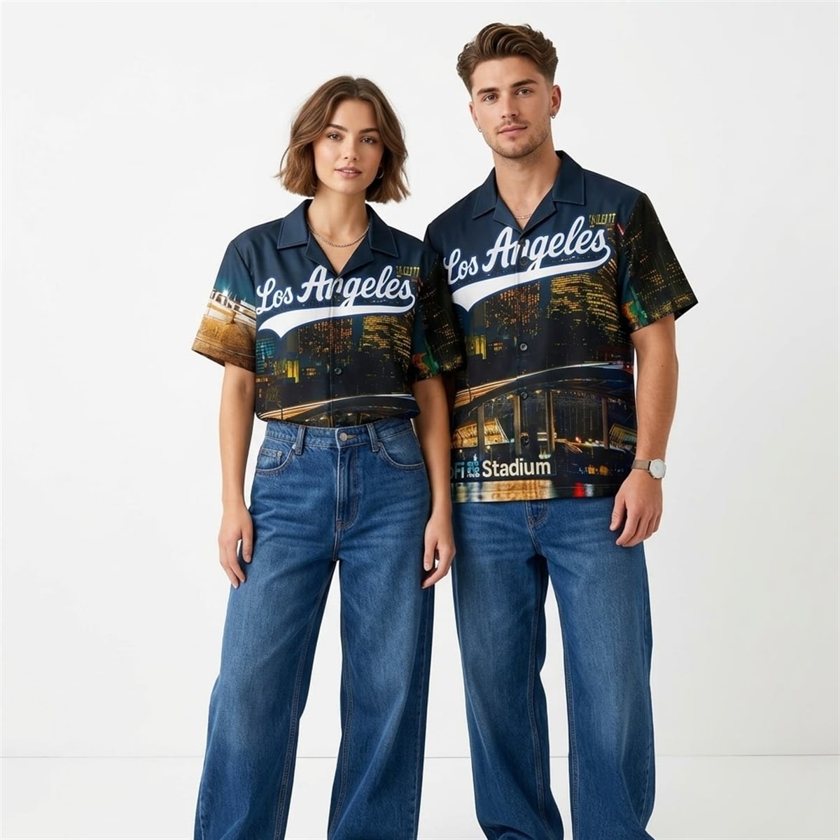 The shirt is a vivid visual celebration of a milestone in entertainment history. Designed with a striking, all-over scenic print, the shirt features a breathtaking nighttime vista of the Los Angeles skyline, leading the eye down to the brilliantly illuminated architecture of SoFi Stadium. Across the chest sits a bold, sweeping “Los Angeles” script logo, reminiscent of classic local sports typography, tying the entire aesthetic to the heart of the city.