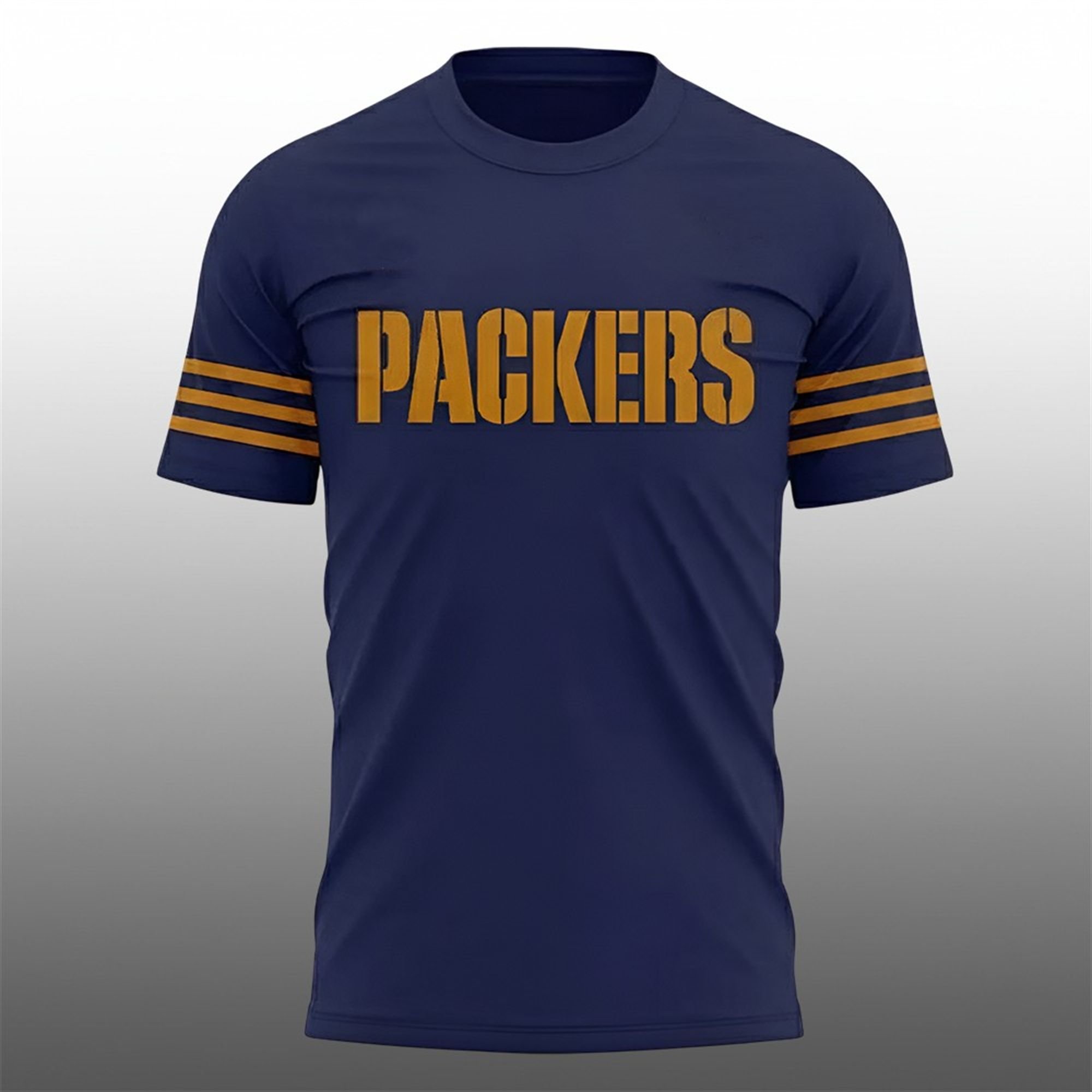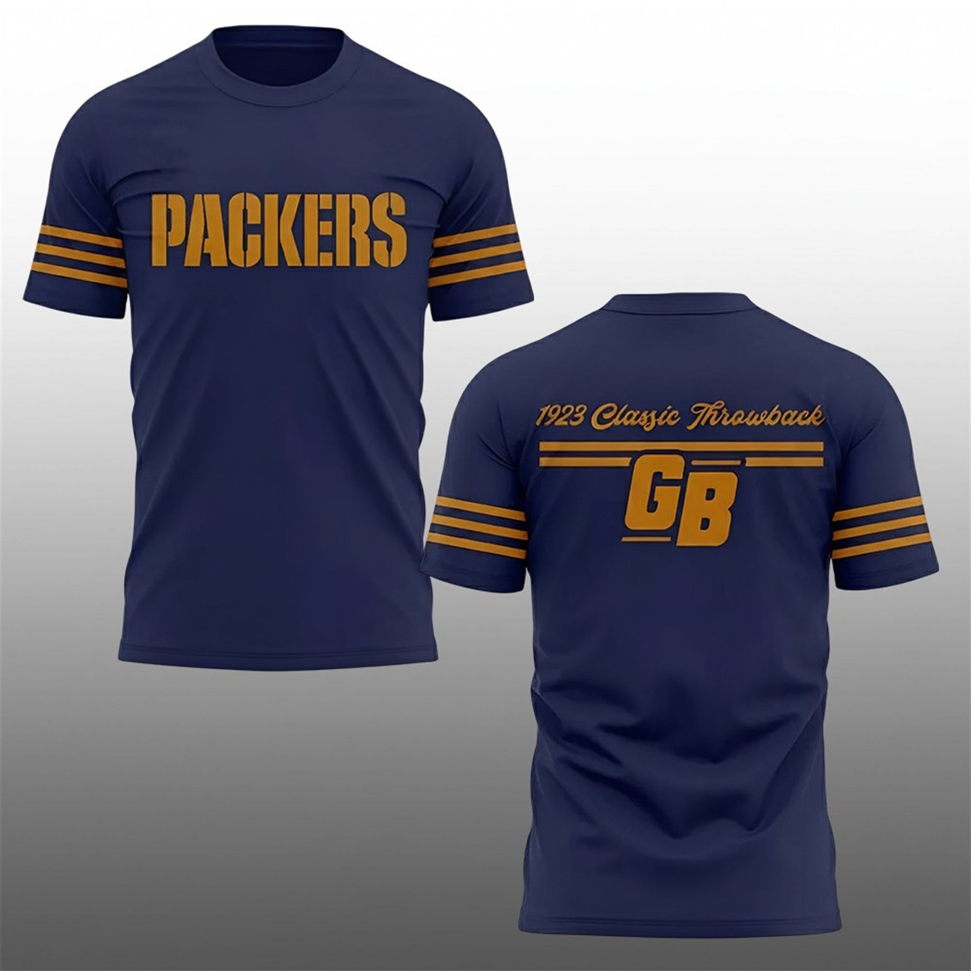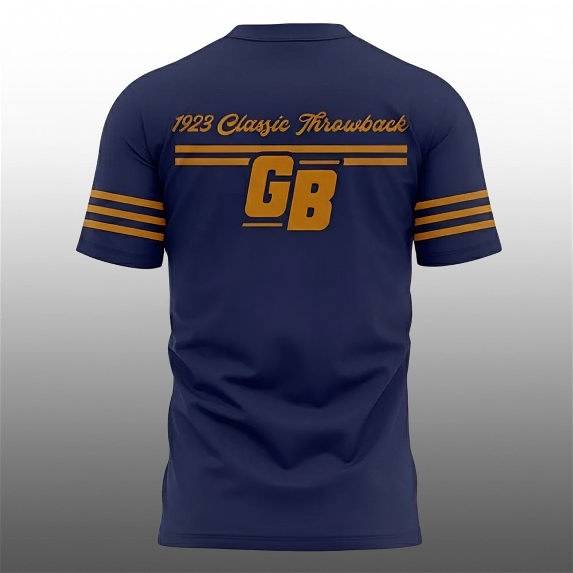 This design is a conversation starter. The front features “PACKERS” in a bold, vintage stencil-style font, exuding the tough, industrial spirit of the 1920s. The rich gold lettering pops against the deep navy blue, creating a look that is both striking and classic. On the back, the design continues with “1923 Classic Throwback” elegantly scripted above a custom “GB” emblem, reinforcing the shirt’s heritage status.