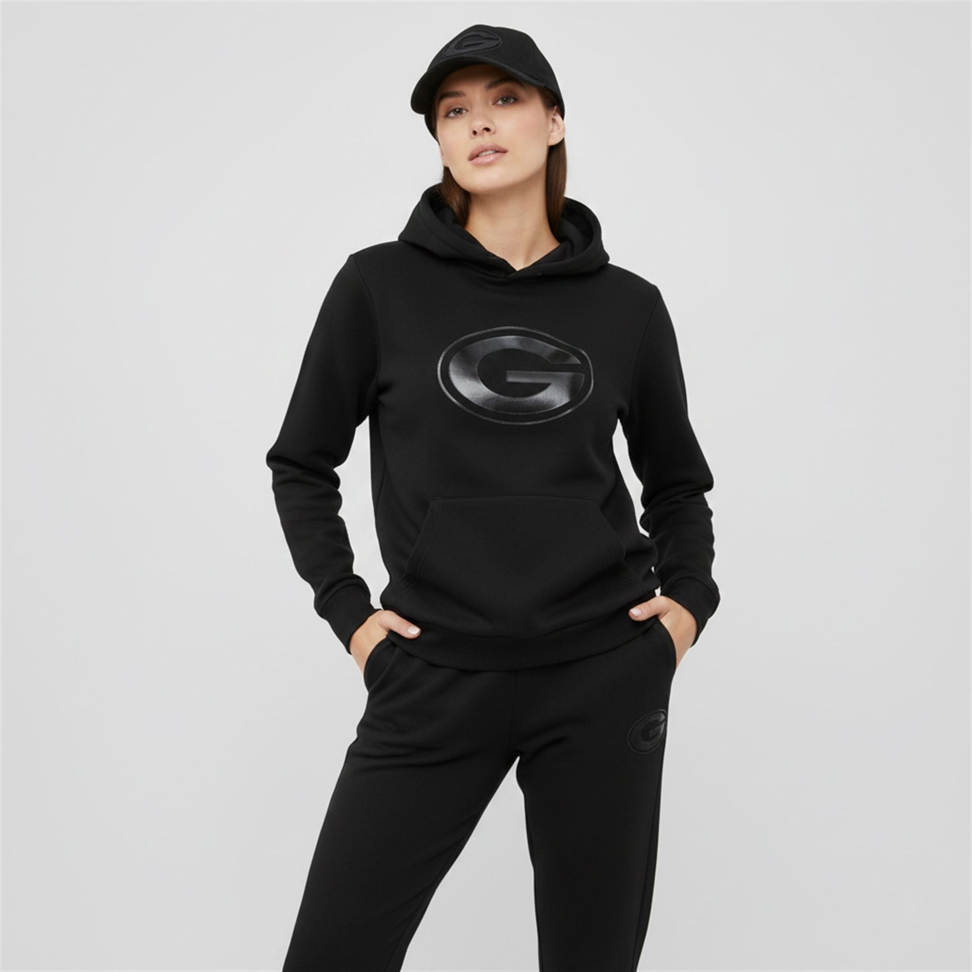 The Hoodie: Features a bold “G” on the chest and a large “GREEN BAY PACKERS FOOTBALL” graphic on the back in a dark, phantom-grey font. The Joggers: A modern, tapered fit with a matching metallic “G” on the left thigh, offering a clean silhouette that avoids the baggy “sweats” look of the past. The Cap: A structured crown with a pre-curved visor, finishing the outfit with a polished, head-to-toe monochromatic vibe.