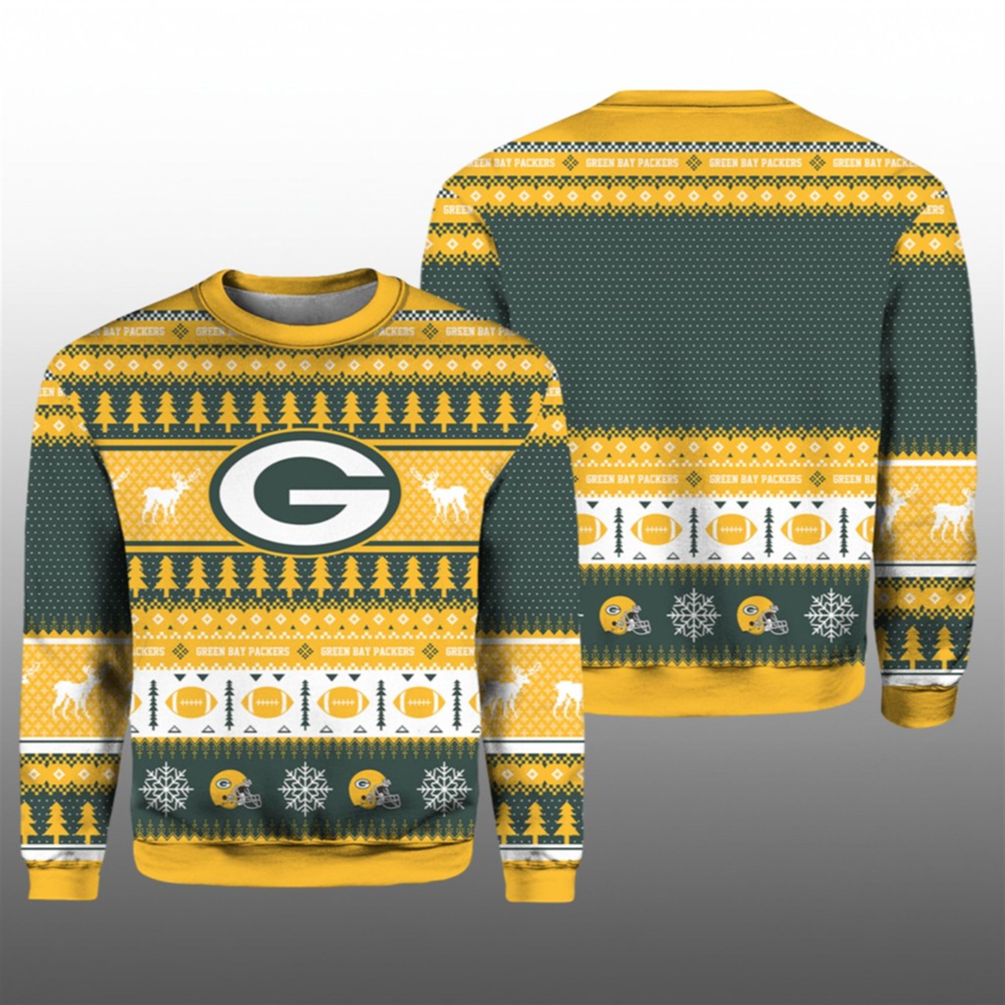 Unlike subtle fan gear, this sweater embraces the “more is more” aesthetic of the holiday season. It features intricate bands of festive designs, including winter snowflakes, pine trees representing the Northwoods, and grazing reindeer, all seamlessly integrated with football elements. The centerpiece is the massive Green Bay “G” logo proudly displayed on the chest, flanked by reindeer, symbolizing the team’s dominance through the winter months.