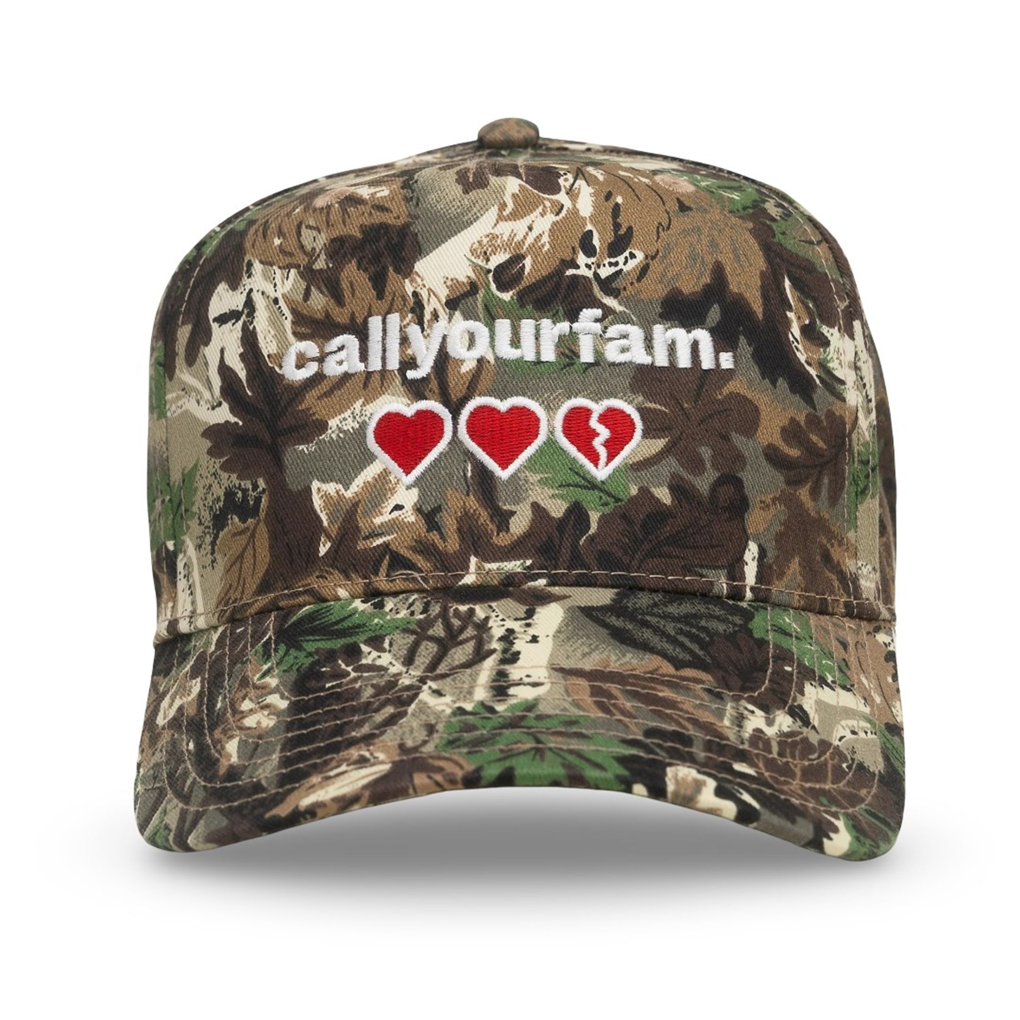 The design of this hat is a masterclass in contrast. It utilizes a classic woodland camouflage pattern—a staple in American fashion known for its association with hunting, the outdoors, and rugged utility. However, instead of aggressive branding or tactical imagery, the front panel features the simple, lowercase phrase “callyourfam.” in stark white.