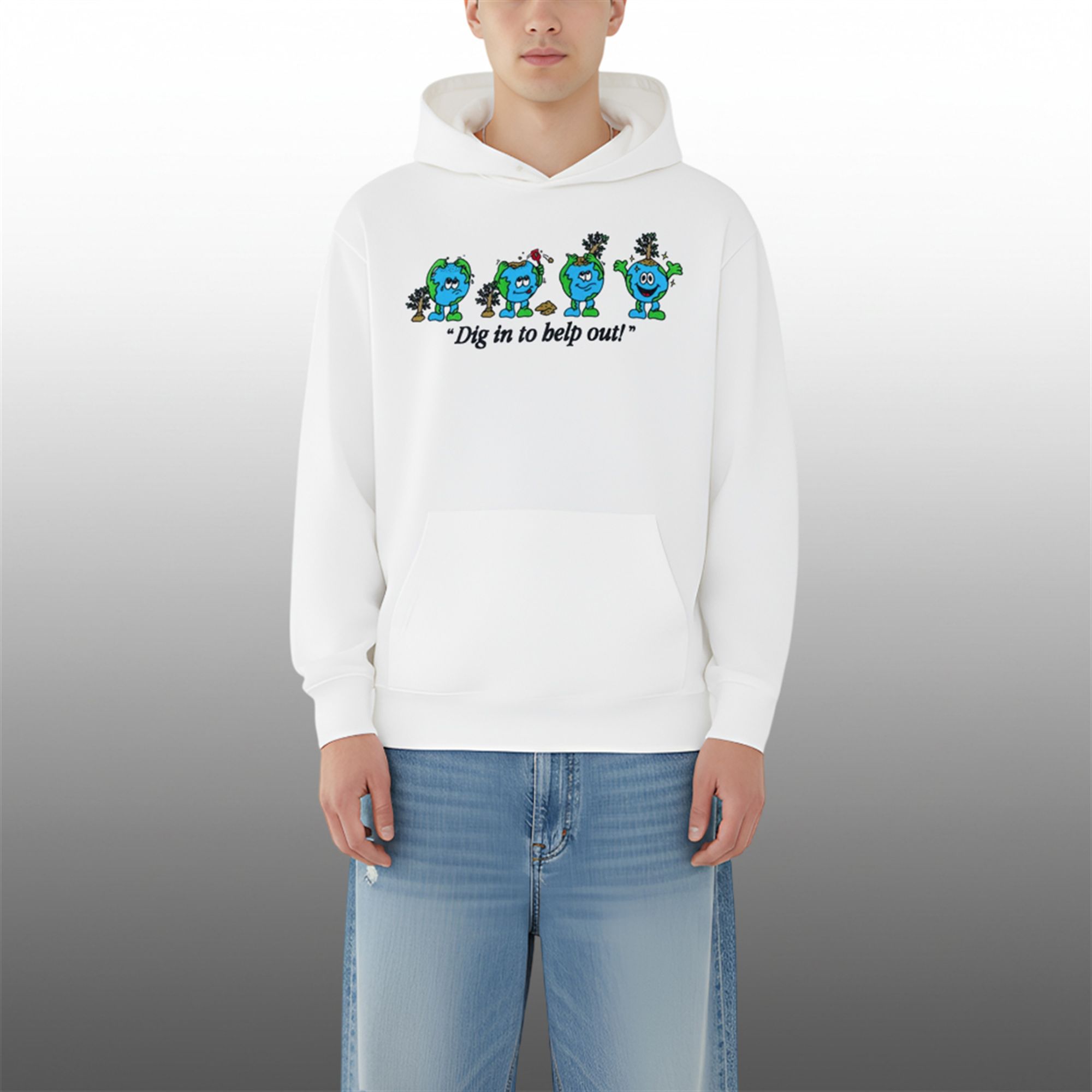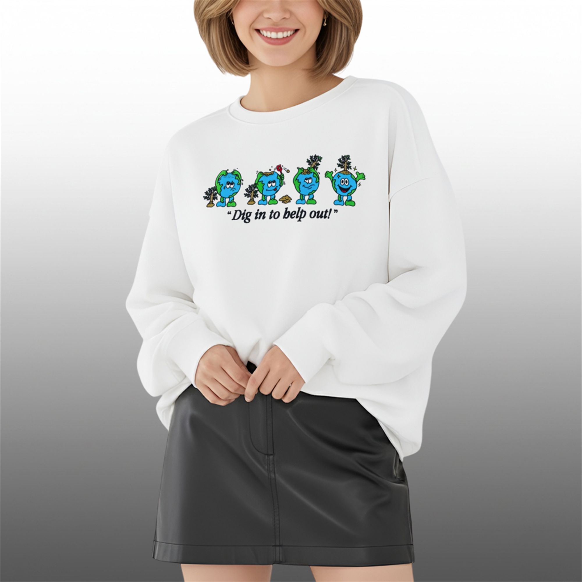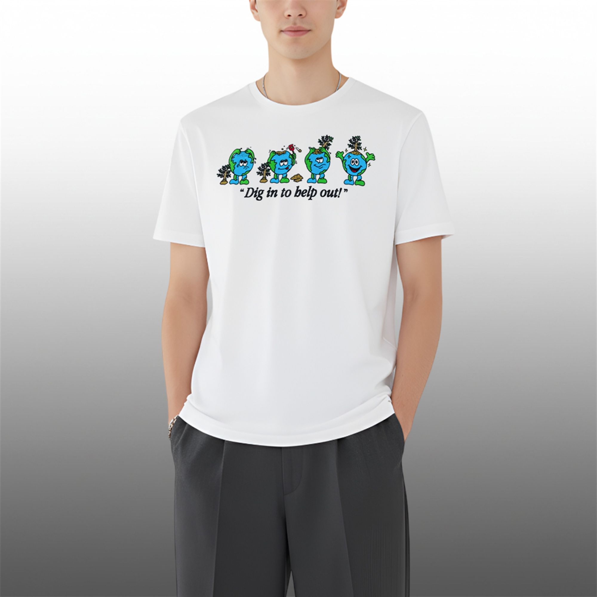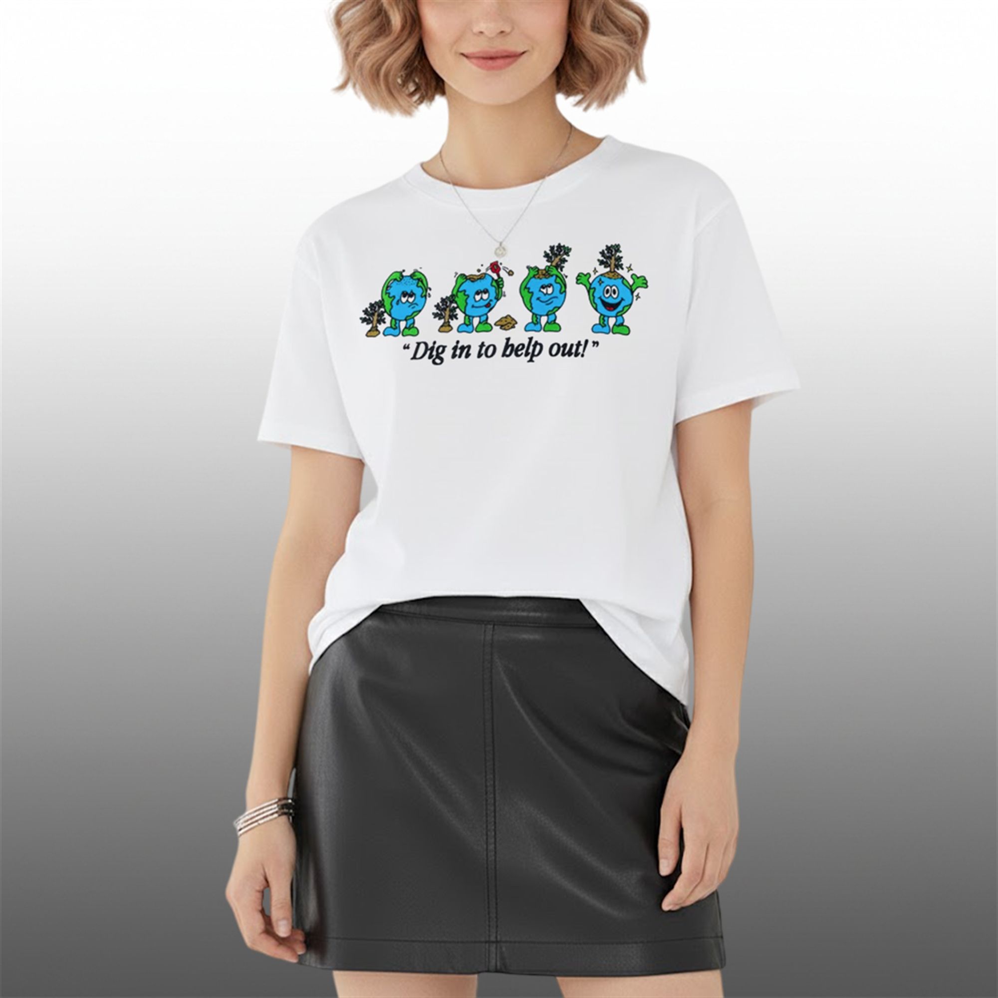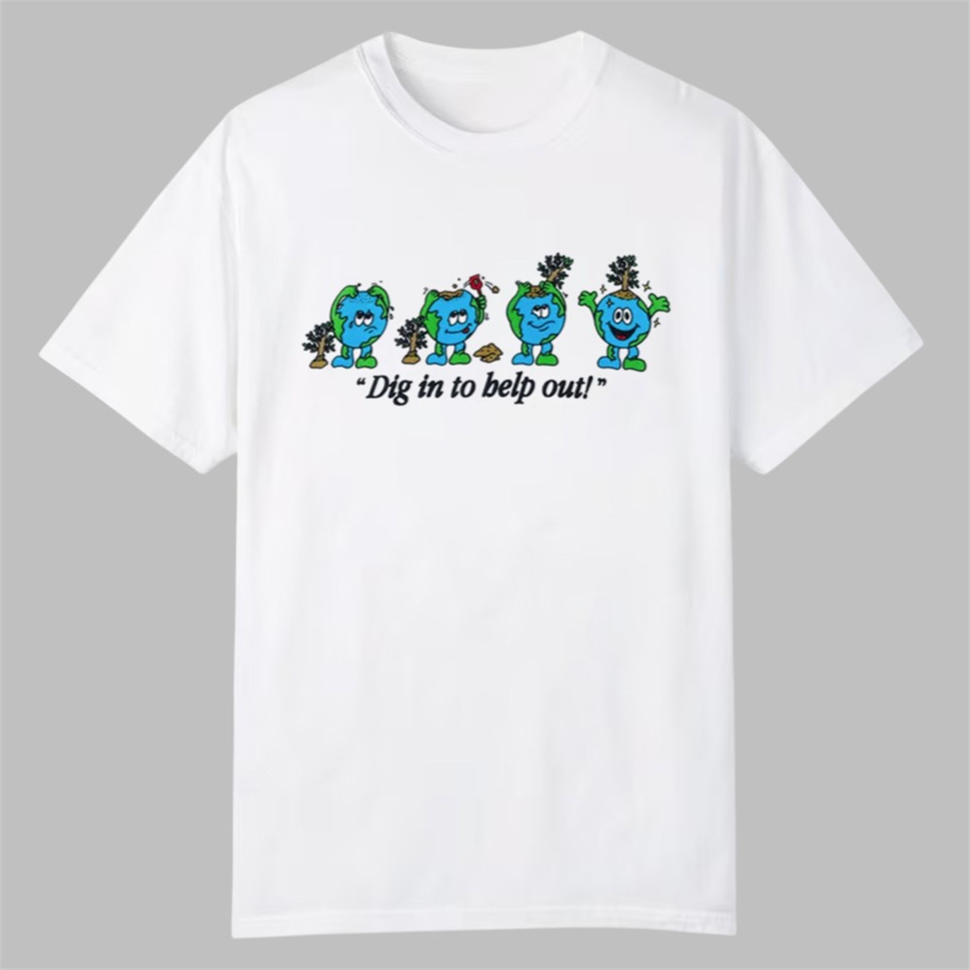 - Beneath the colorful illustration, the slogan “Dig in to help out!” is printed in a classic serif font, evoking the feel of vintage public service announcements. This quality print retains the retro “clip-art” aesthetic that makes the shirt so distinct and sought-after.