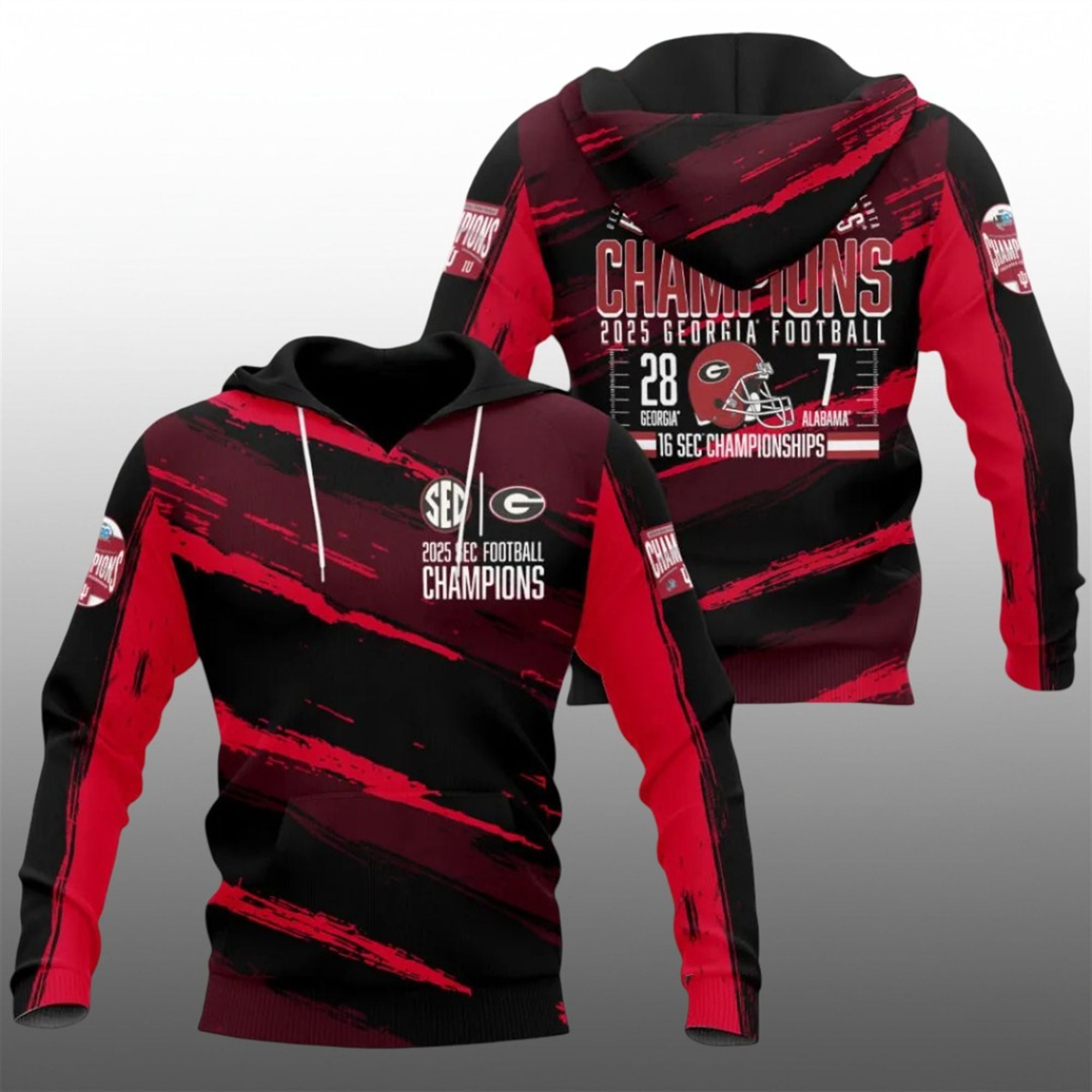 Back Design: The back acts as the ultimate scoreboard. It immortalizes the final score—Georgia 28, Alabama 7—and features the date, venue (Mercedes-Benz Stadium), and the rallying cry that every fan knows: “How ‘Bout Them Dawgs.” It also highlights the program’s history with the text “16 SEC Championships,” connecting this win to a legacy of greatness.