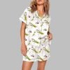 This Giraffe Pajama Set For Women features a playful all-over giraffe print on a creamy, off-white background. The classic design includes a button-down, short-sleeved top with a notched collar and matching shorts with a comfortable elastic waistband. Delicate piping trim adds a touch of sophistication, elevating the look from simple sleepwear to a stylish loungewear ensemble.
