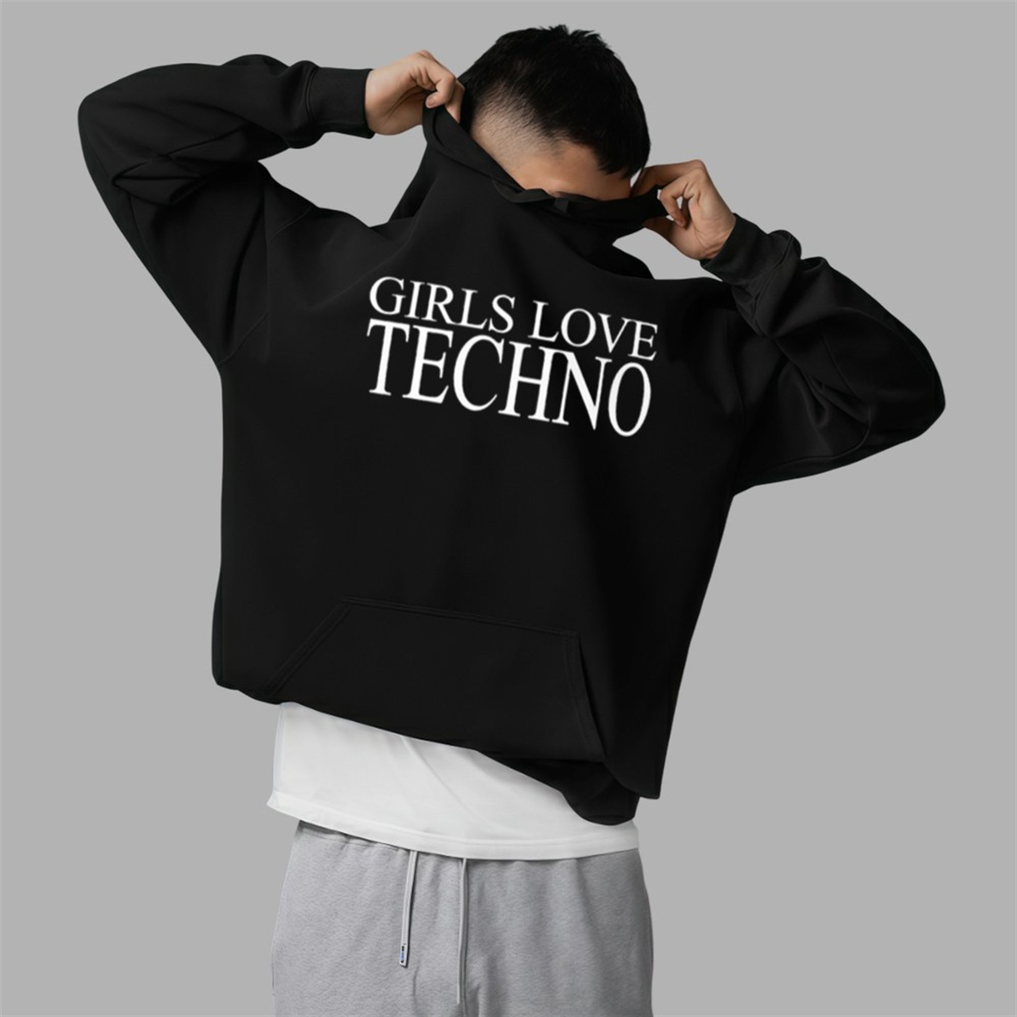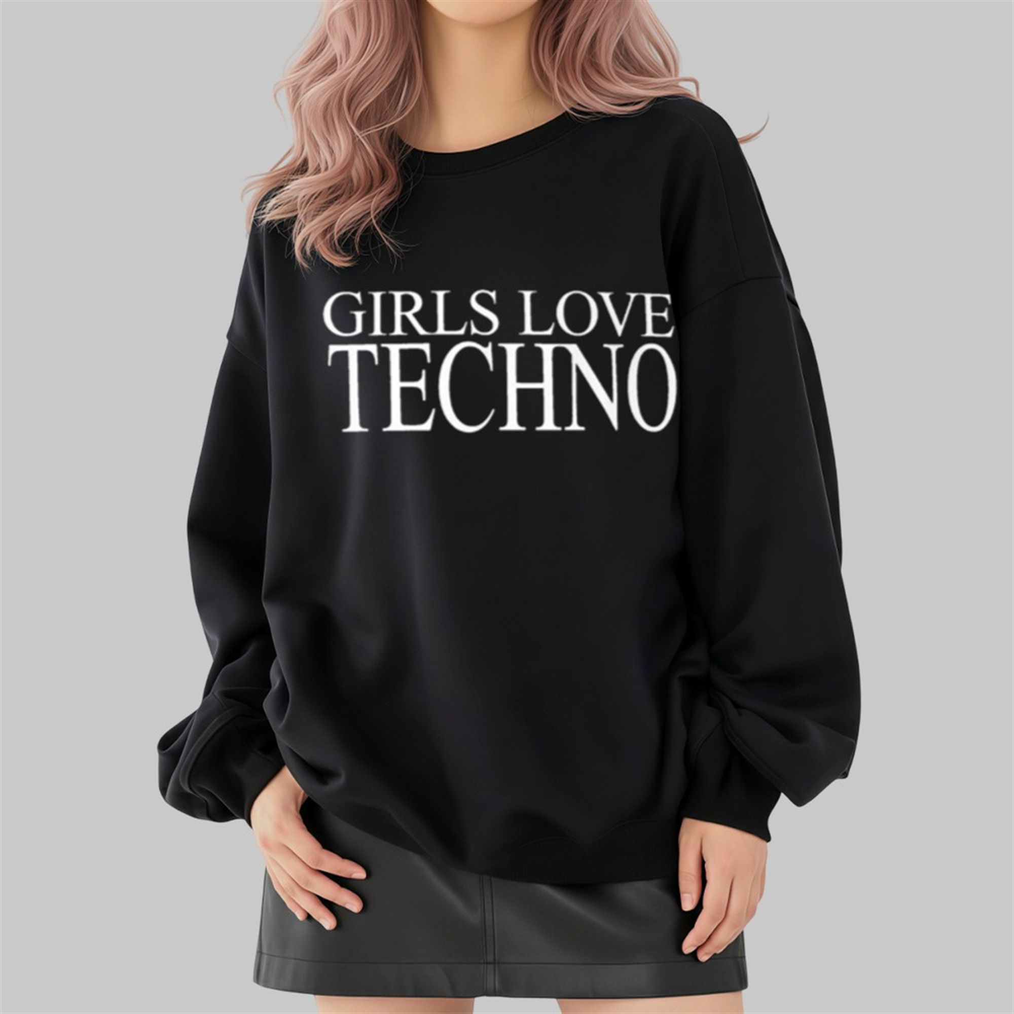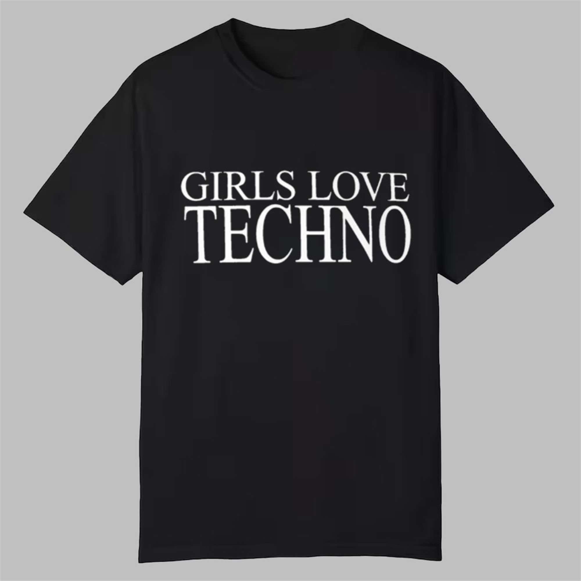 The shirt features the phrase “GIRLS LOVE TECHNO” printed in a crisp, classic serif font that contrasts sharply against a high-quality black cotton background. This aesthetic choice nods to the high-fashion meets underground-grit style that is trending heavily in 2025 rave fashion. The design is intentionally clean, allowing it to serve as a versatile staple in your wardrobe—essential for layering under mesh bodysuits, pairing with tactical harnesses, or wearing oversized for that effortless “model-off-duty” afterparty look.