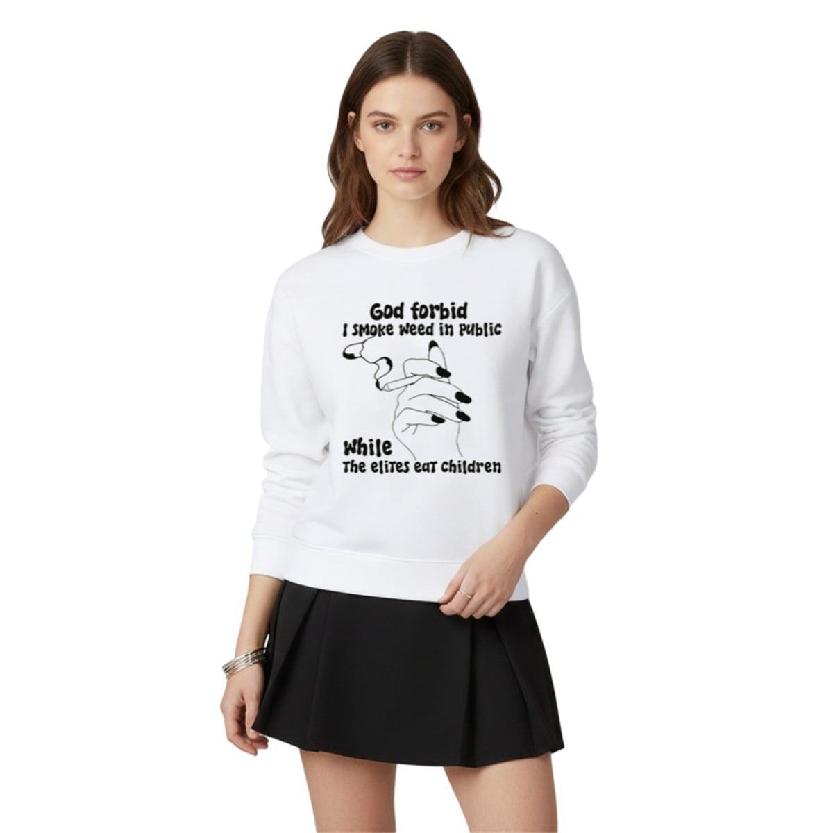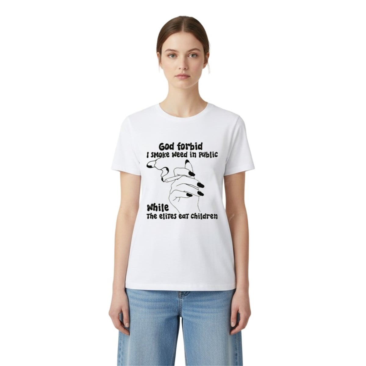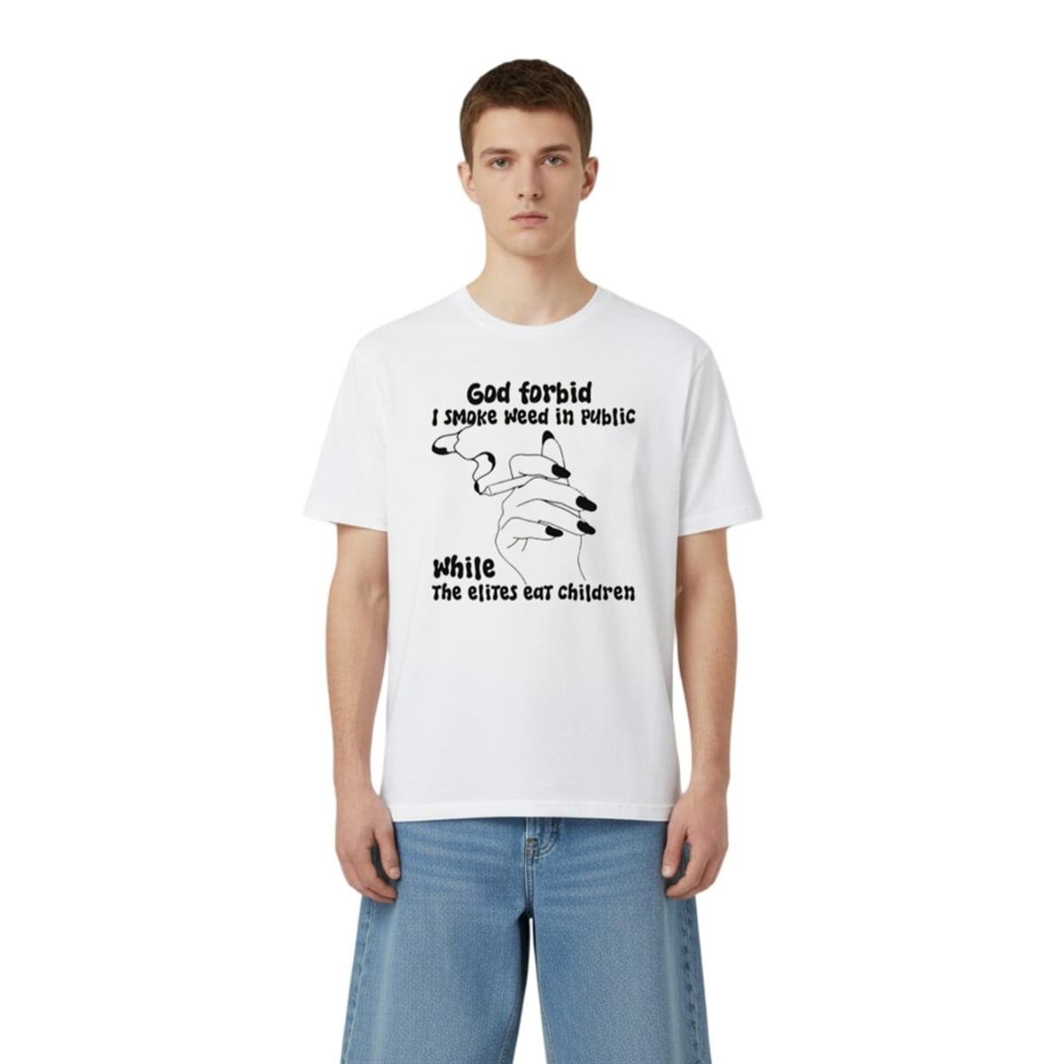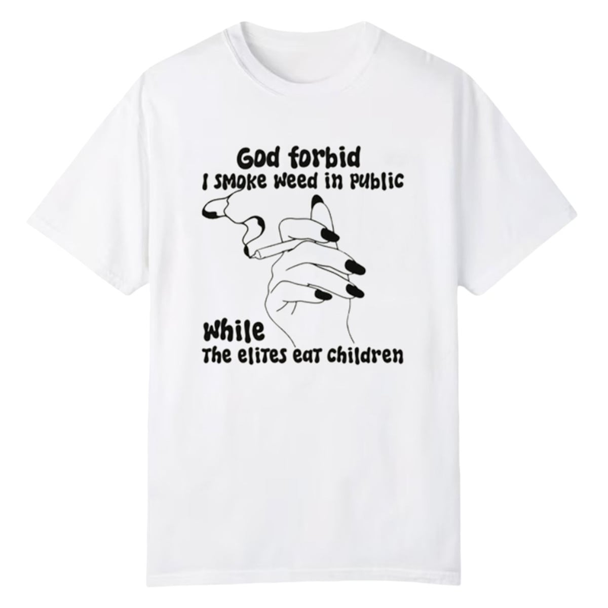 At its core, this design is a masterclass in hyperbolic satire. The phrase “God forbid I smoke weed in public while the elites eat children” uses extreme contrast to point out the perceived hypocrisy in how society enforces moral standards. On one hand, it highlights a relatively harmless, increasingly normalized activity (smoking cannabis). On the other hand, it references absurd, top-tier internet conspiracy theories regarding the global elite.